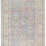 A beautiful large contemporary Sultanabad carpet with the softest dyes and hand-spun wool. Amazing natural dyes have been used that help make this contemporary carpet look like an antique piece. With a light blue toned background and light off white border colour, this is a very calm and gentle palette, with some warmer tones used as well to add that warmth. Ideal for a drawing room, dining room or bedroom, these carpets are woven using the best techniques and weavers.