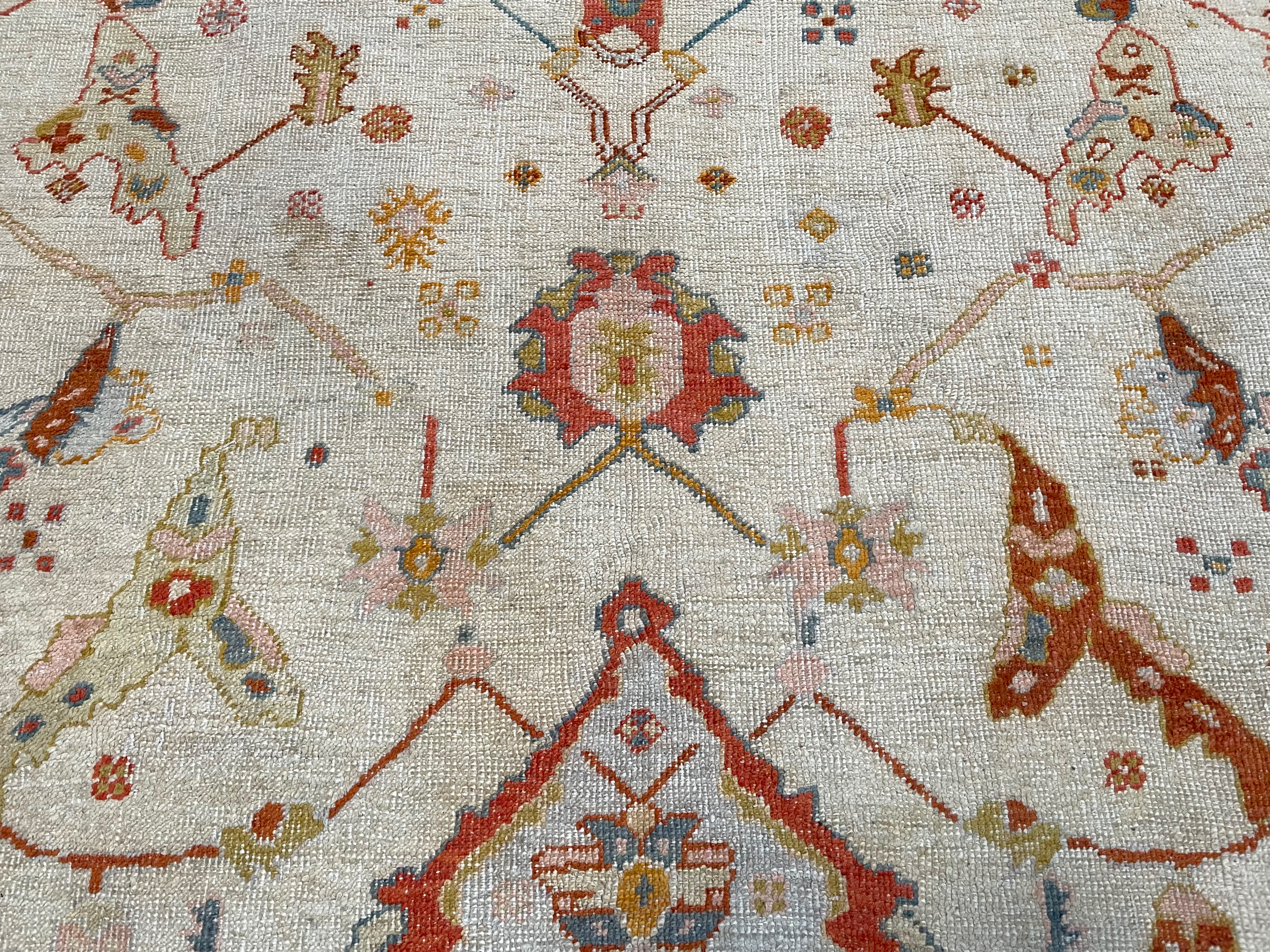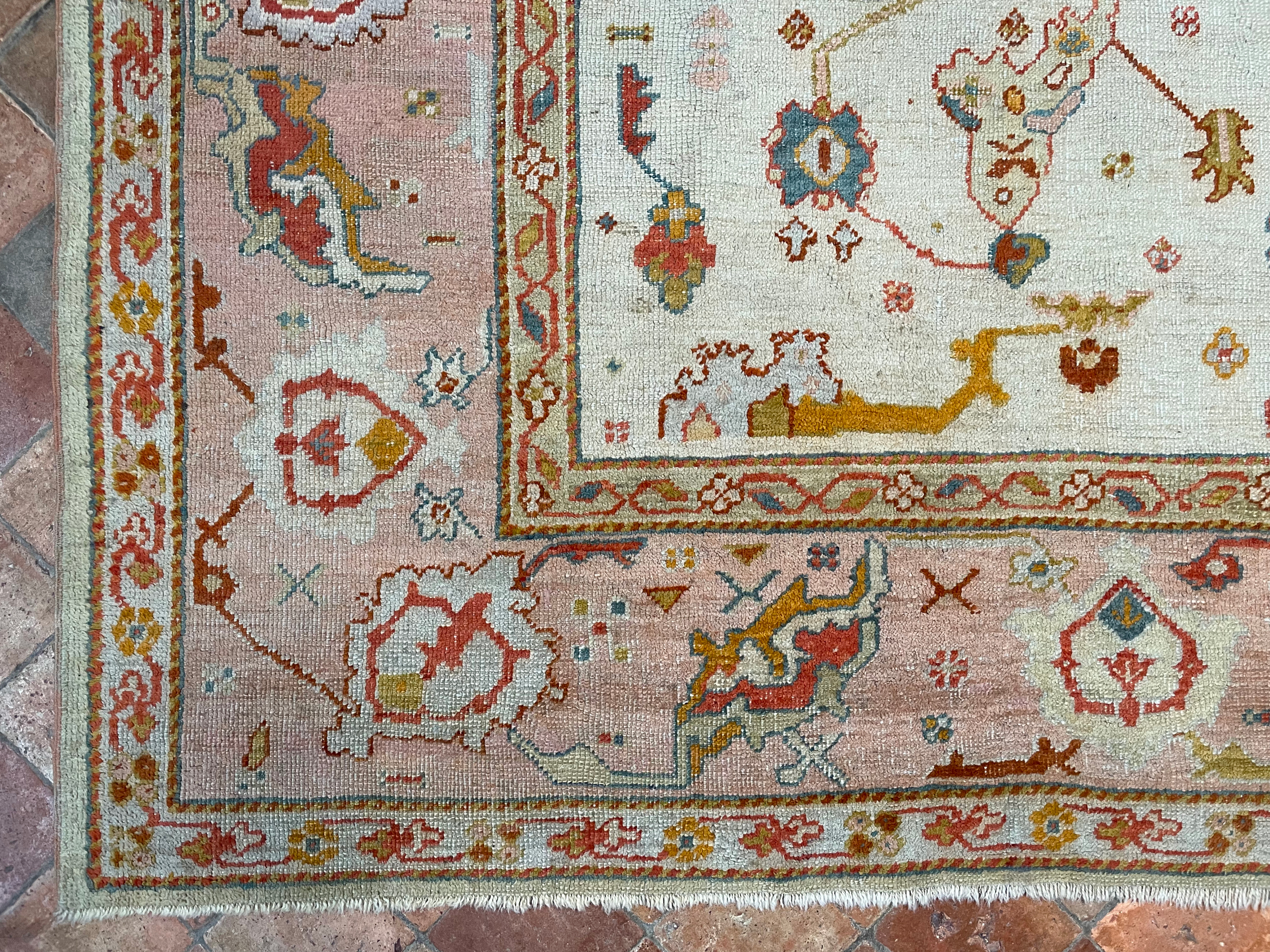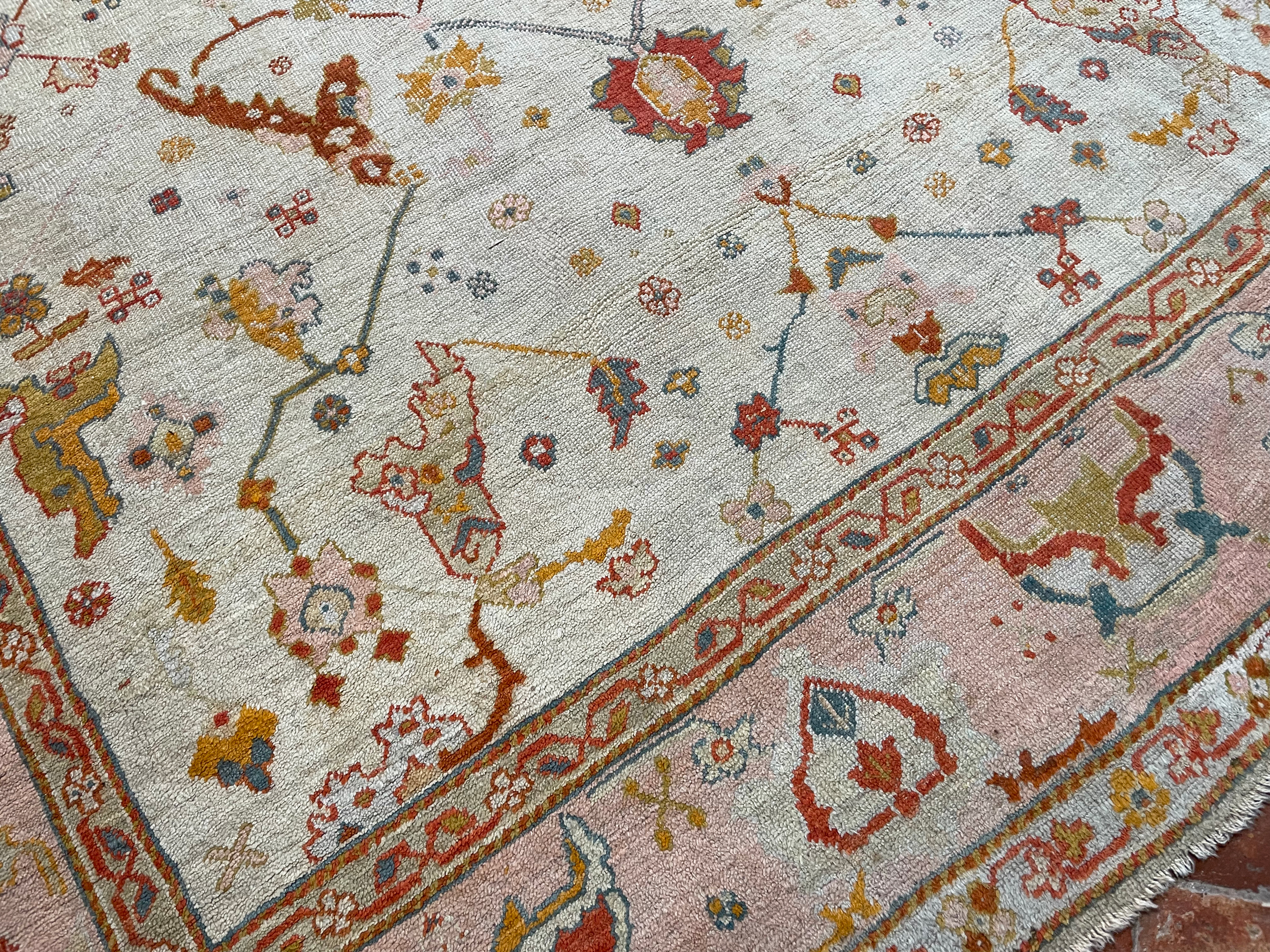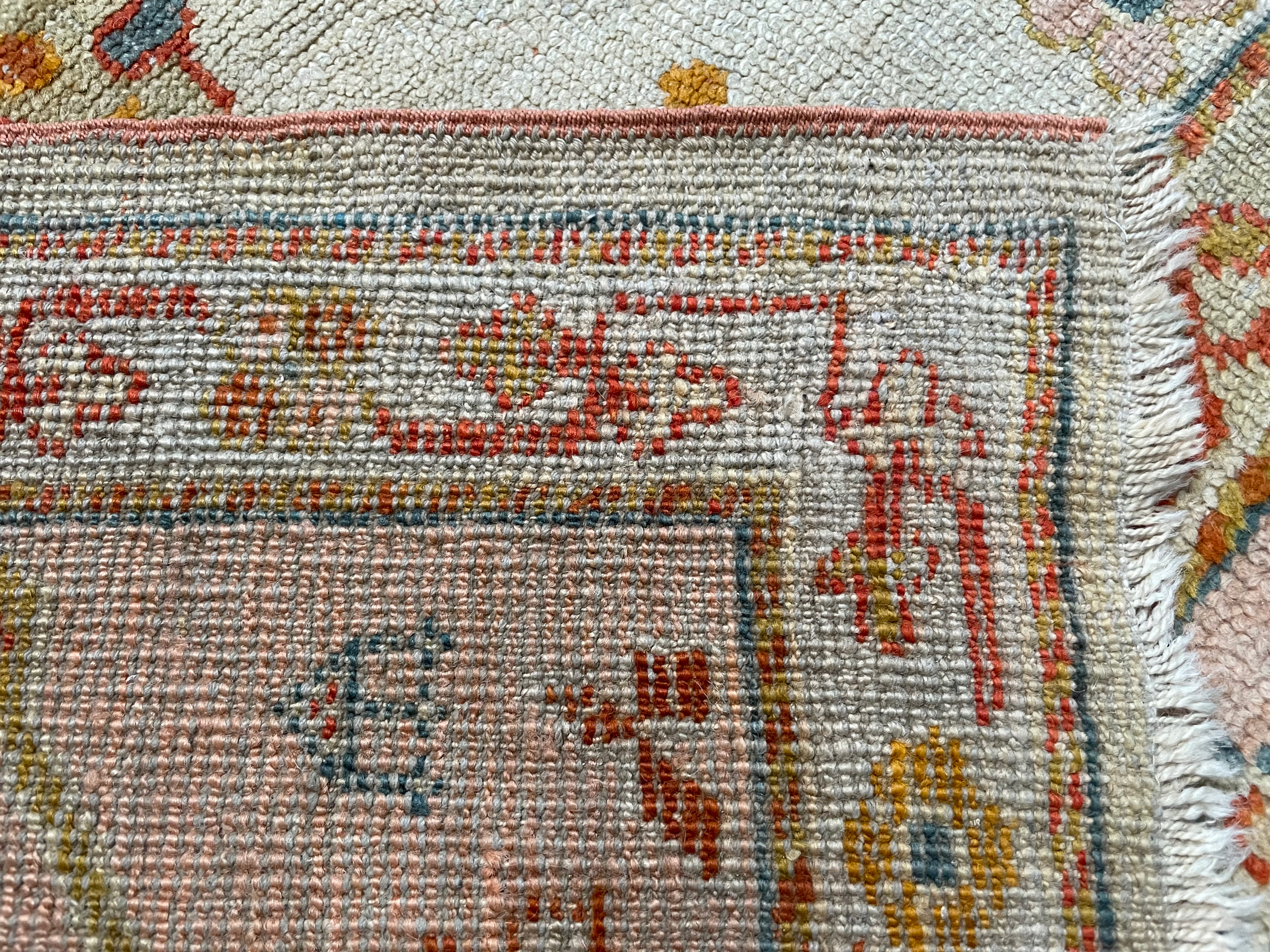 An ivory background and very pretty early antique Ushak carpet. Woven in the late 19th Century in Anatolia, western Turkey, these exquisite hand-woven carpets have been produced since the start of the Ottoman period. Which dates from 1300-1922. The mid to late 19th century examples such as this became more open and decorative in design and were commissioned more for the Western market in the US and Europe and have since rivalled the look of the famous Ziegler carpets from Persia.