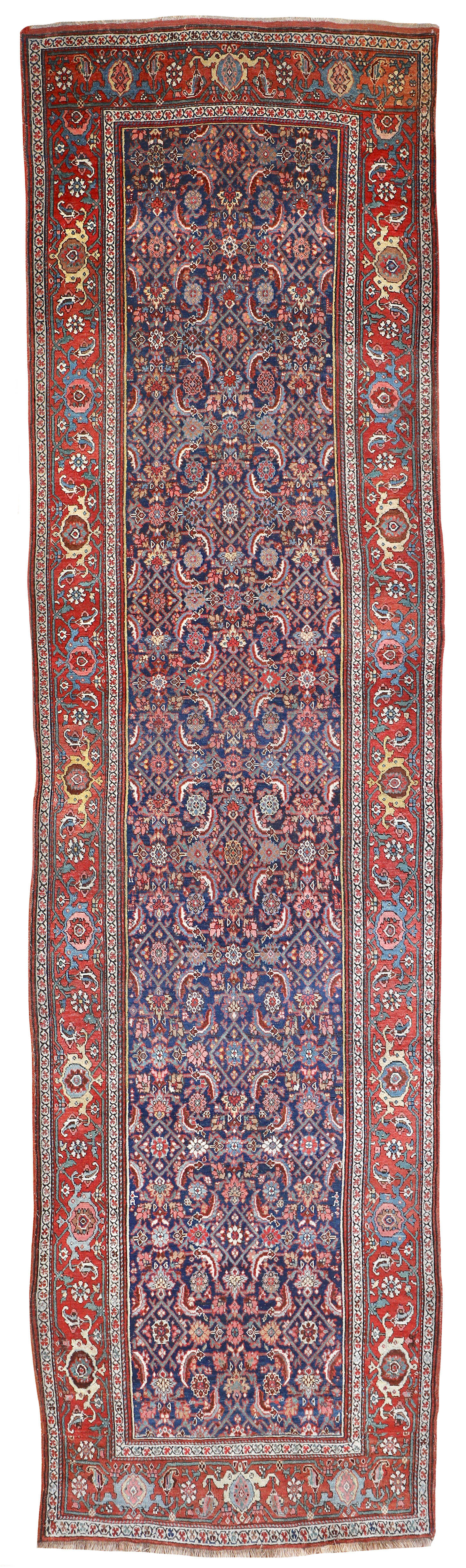 A fabulous antique Bidjar runner with a deep blue background and using wonderful faded madder dyes for the border. We can see some lovely yellow and green dyes too for the floral detailing.These antique runners are known for their strength and durability, mainly due to the tough wool they used and the sturdy construction of usually four wefts.