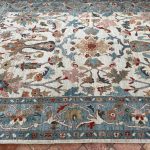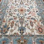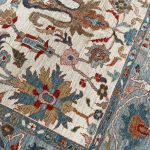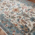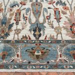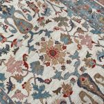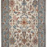 A really beautiful and light ground contemporary Sultanabad carpet using natural dyes and traditional designs from the famous carpets woven in Sultanabad with a modern feel. The off-white natural background colour combined with the muted pinks, soft biscuit tones, pale blues and greens makes for a wonderful decorative carpet. Combined with the gentle pale blue border, the design and colours have been expertly hand-woven and thought out by the best weavers today.