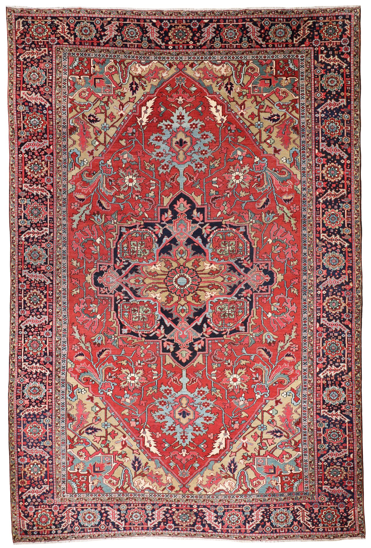A truly breathtaking antique Heriz carpet, a really stunning carpet with amazing rich colours and vivid drawing. A remarkable intricate pattern with detailed large leaves, a wonderful medallion and gorgeous sandy yellow corners. A real wow! The natural dyes and fine weave create one of the best Heriz we have seen recently, the colour combination and beautiful design makes this a wonderful antique carpet. Condition is really very good, a finely cut medium wool pile, and dating from circa 1890-1900.