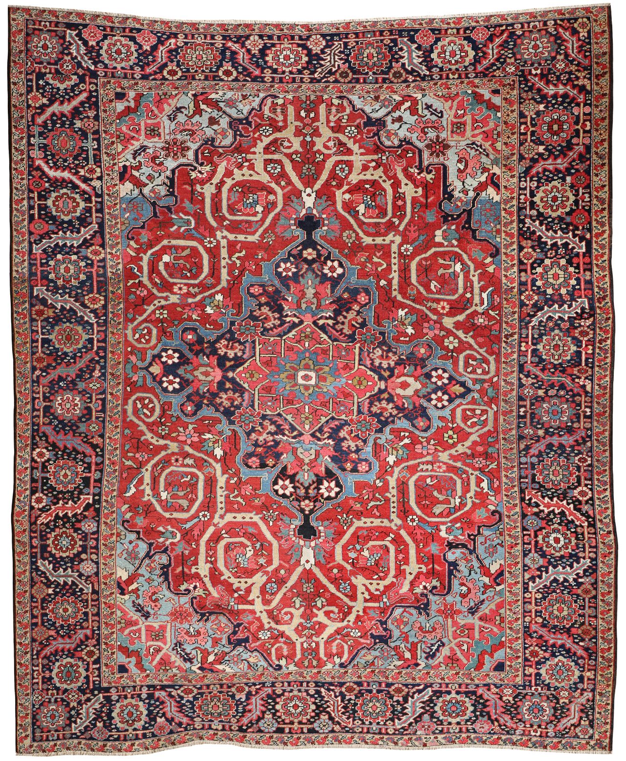 A fabulous antique Heriz carpet from the late 19th Century, an intricate medallion pattern with golden yellow scrolling vines in the red outer medallion. The four pale blue corners are a real delight, this early pale blue dye is one of our favourites to see on a Heriz. Heriz have always been regarded as tough, decorative rugs and this wonderful example is a prime example.