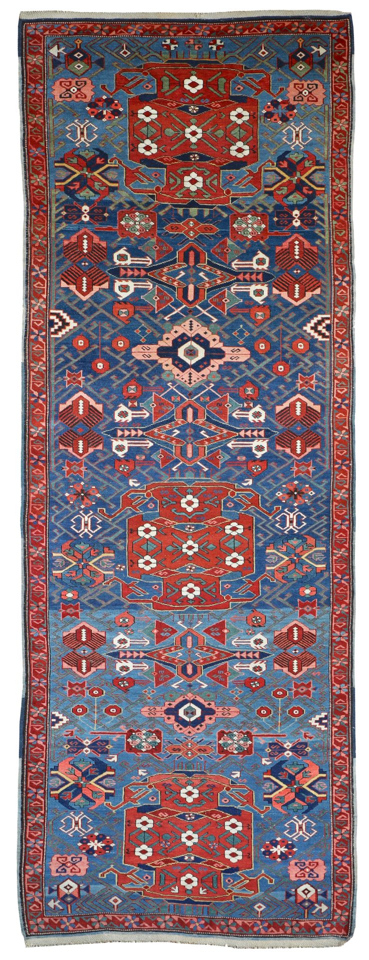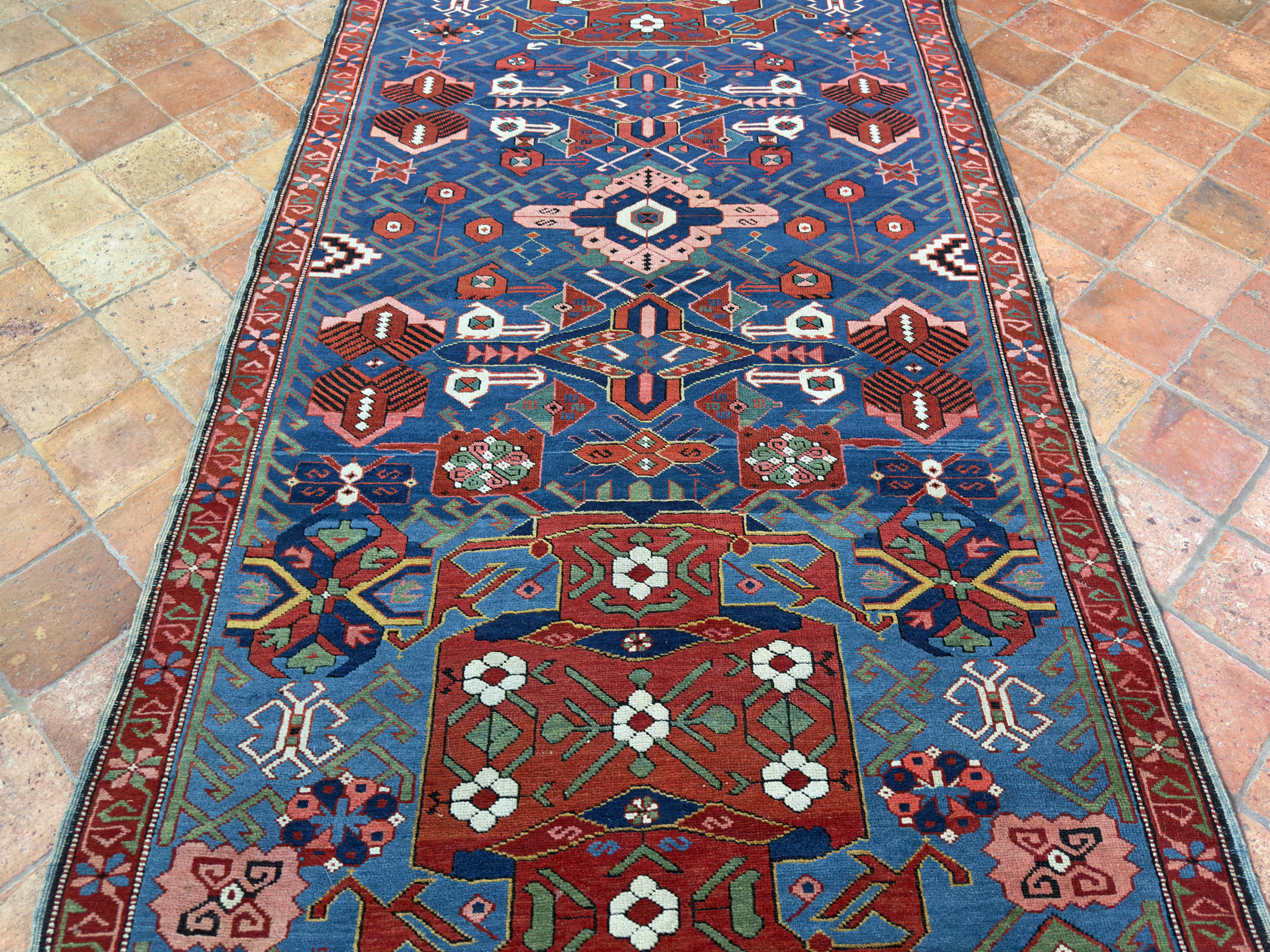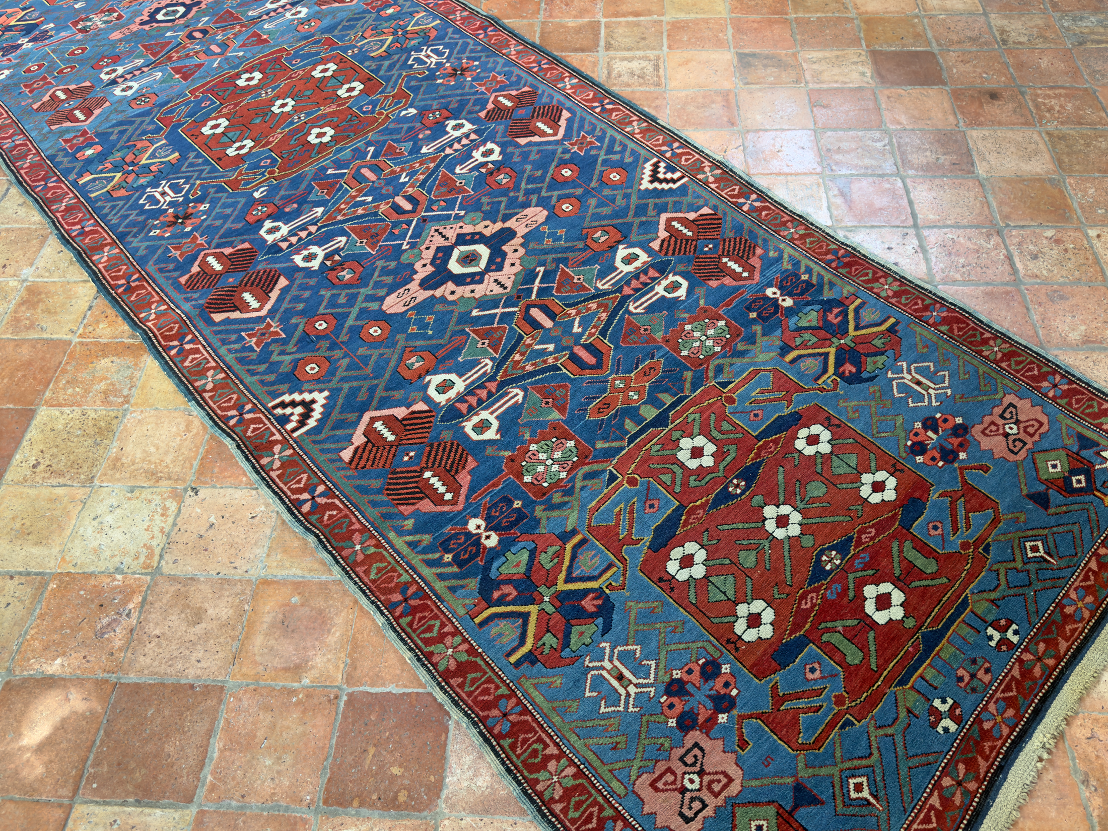 A tribal antique Caucasian Seychour Kelleh woven in the North Kuba region, Dagestan, in the late 19th century.  The varying dyes of blue and changes in dye add a lot of interest and character to this ancient piece of weaving.  With vivid terracotta tones, pinks, greens and off white dyes, the palette is fun and vibrant which is often the way with Caucasian pieces.  They loved to weave interesting and usually colourful rugs and these longer runners too.  In fabulous pile, soft wool and original kilim ends can be seen at both fringes.