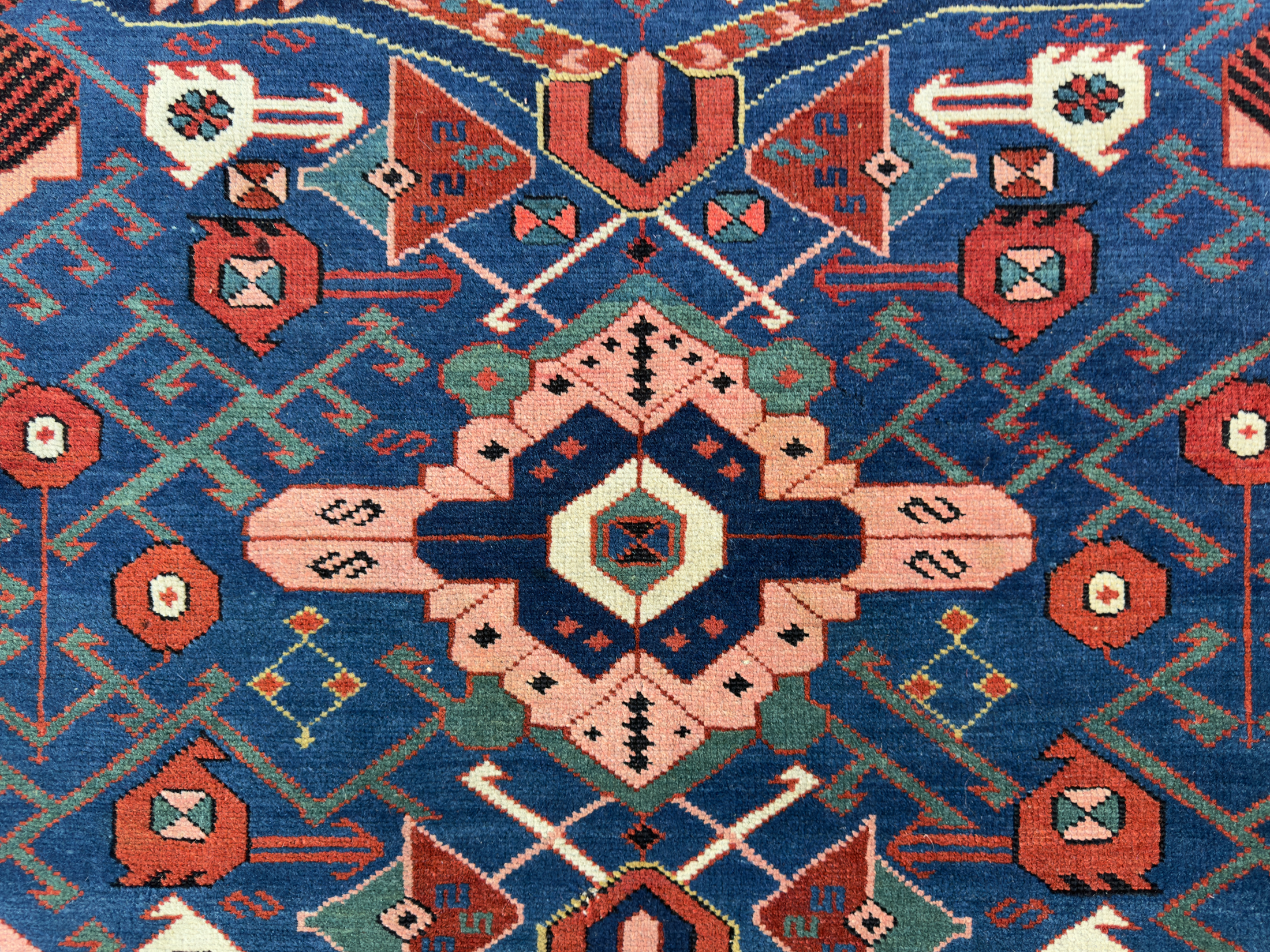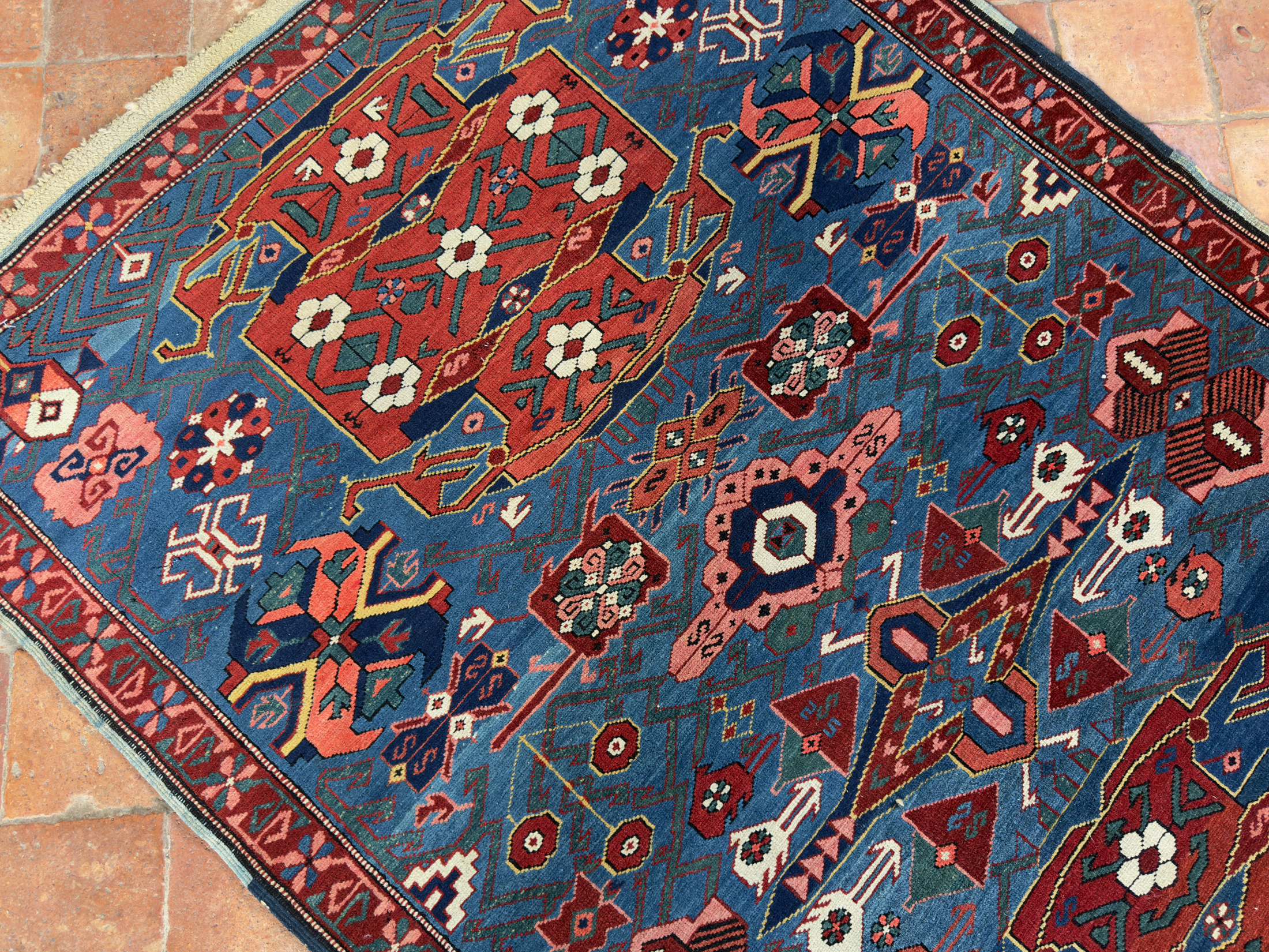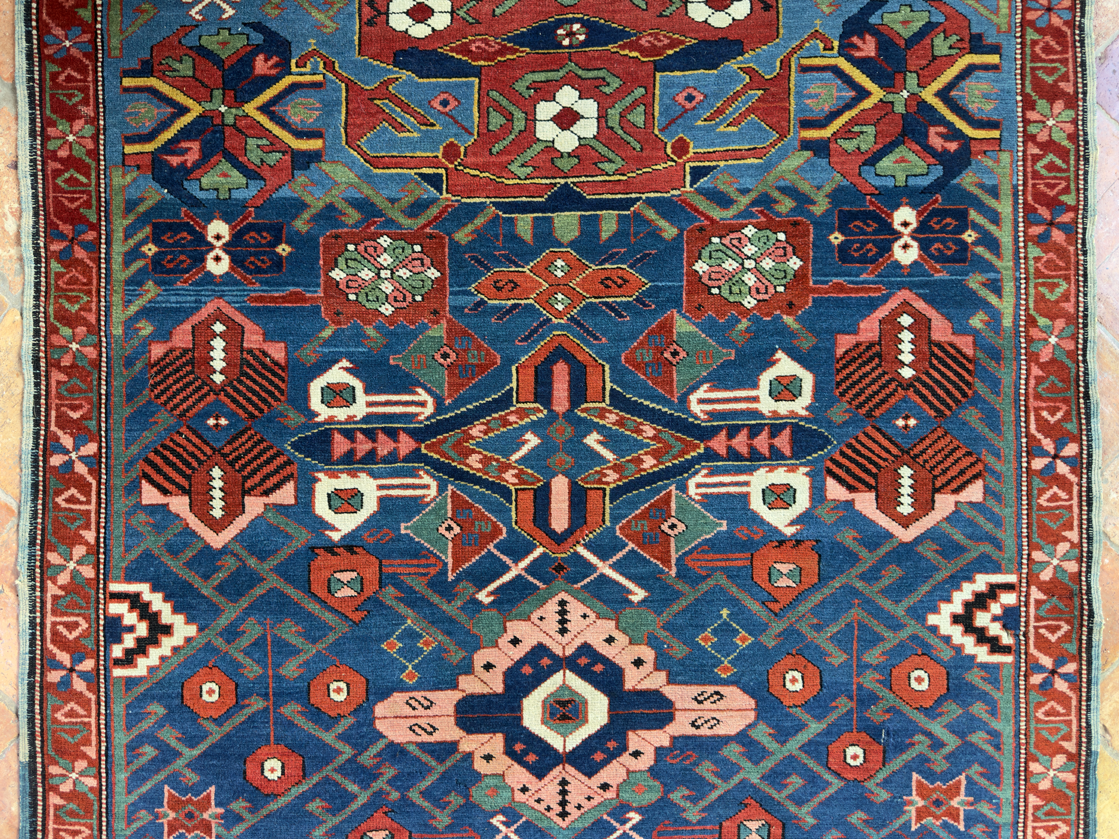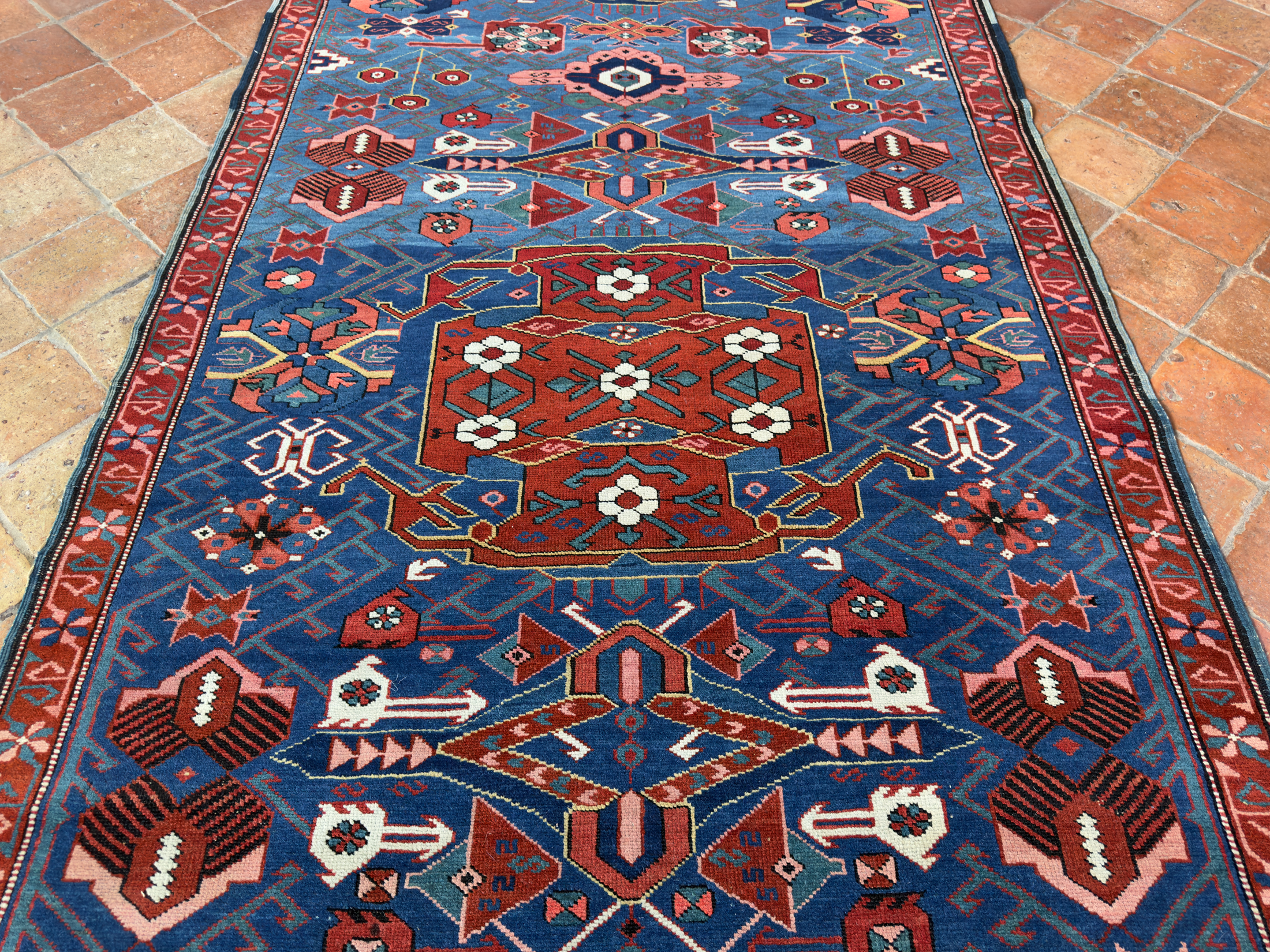 A tribal antique Caucasian Seychour Kelleh woven in the North Kuba region, Dagestan, in the late 19th century.  The varying dyes of blue and changes in dye add a lot of interest and character to this ancient piece of weaving.  With vivid terracotta tones, pinks, greens and off white dyes, the palette is fun and vibrant which is often the way with Caucasian pieces.  They loved to weave interesting and usually colourful rugs and these longer runners too.  In fabulous pile, soft wool and original kilim ends can be seen at both fringes.