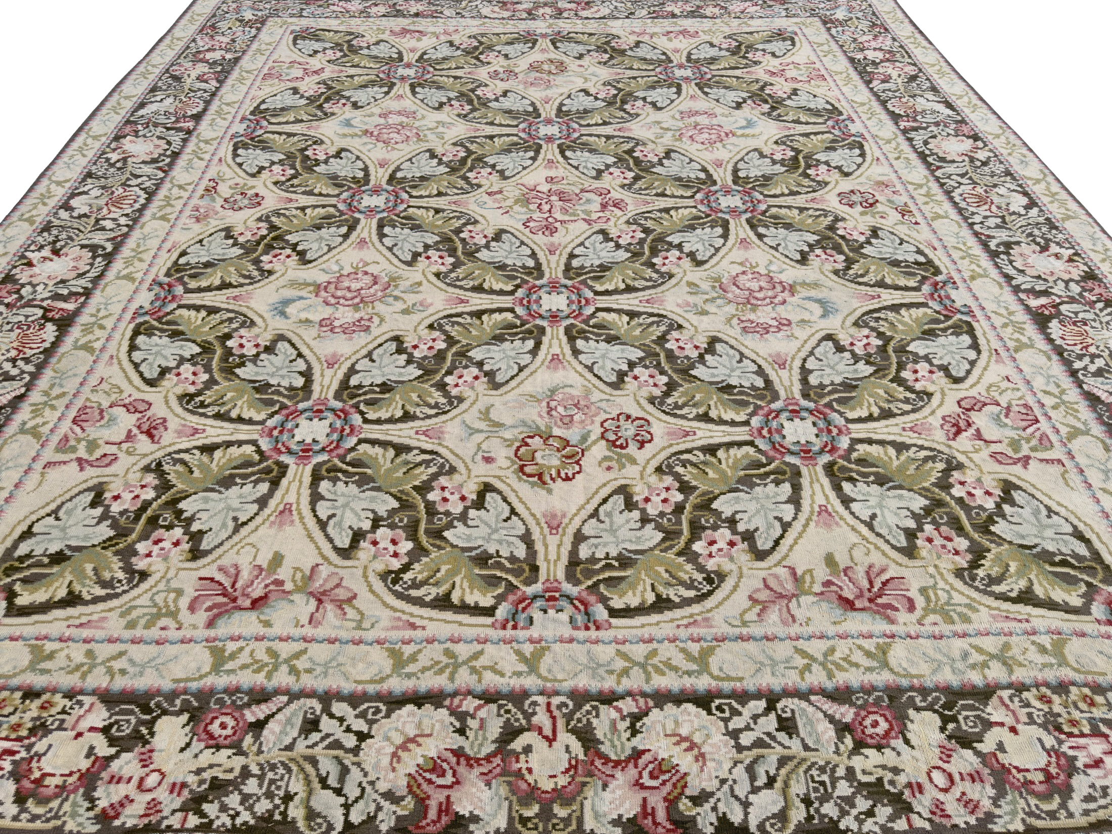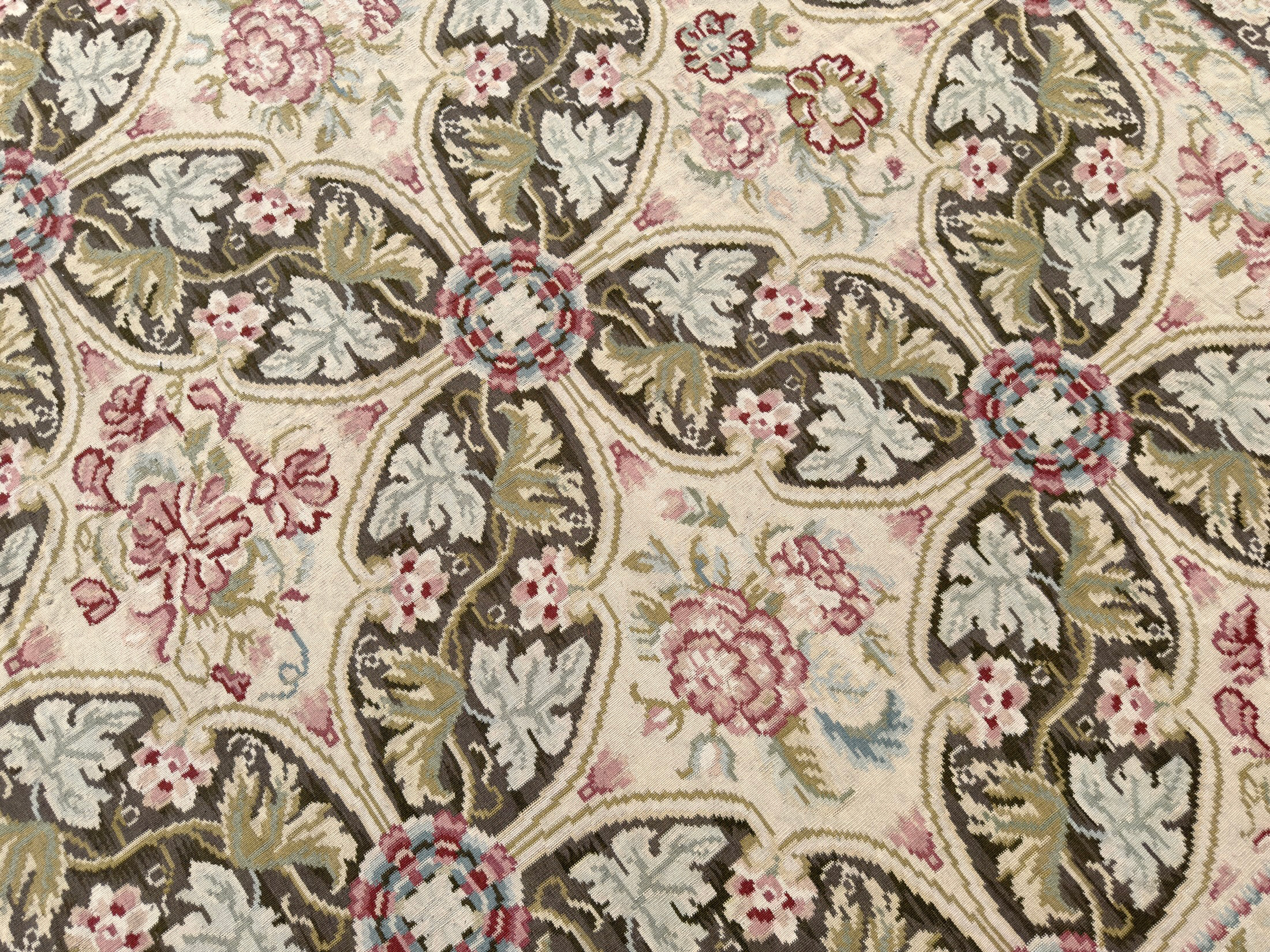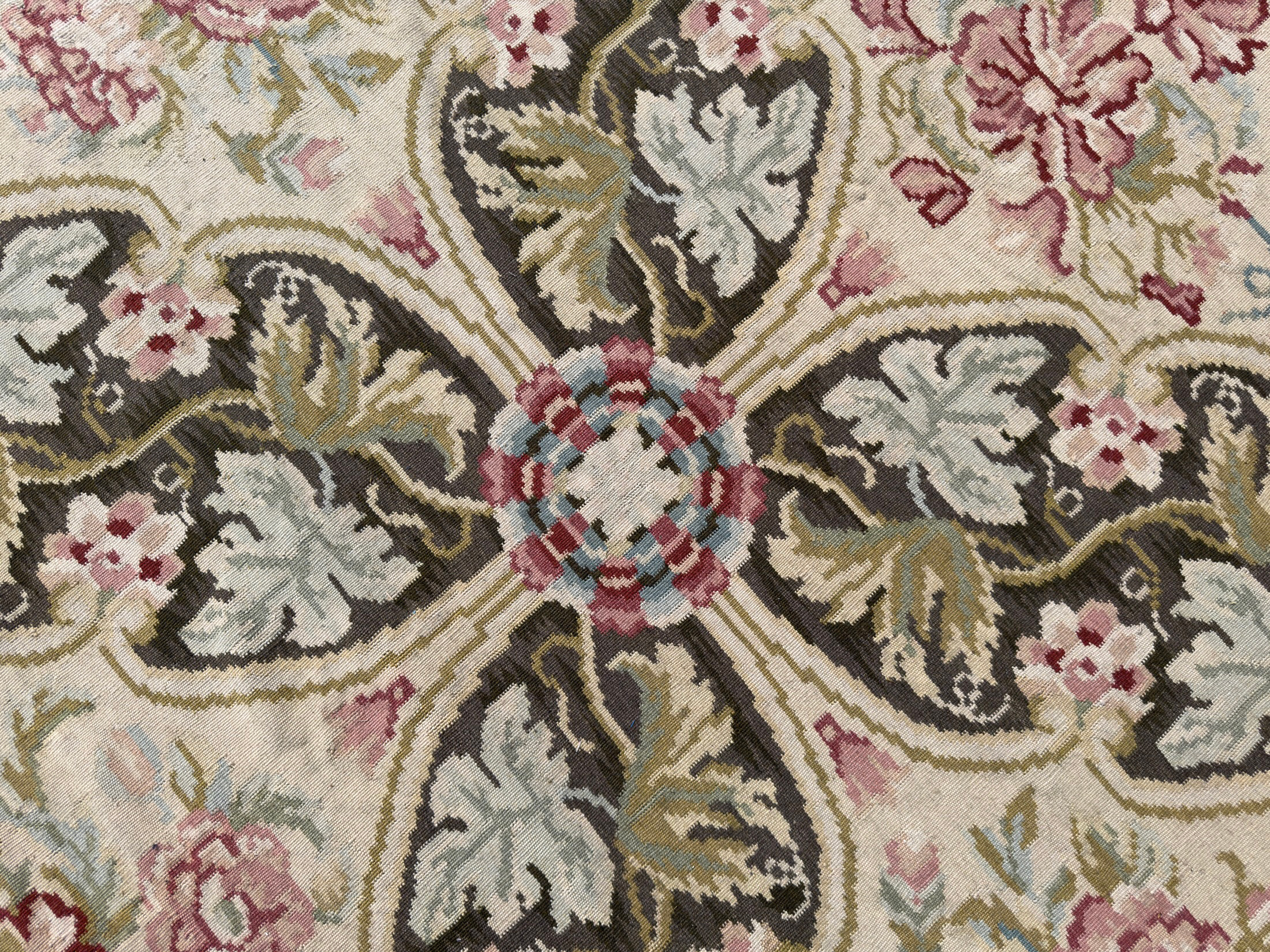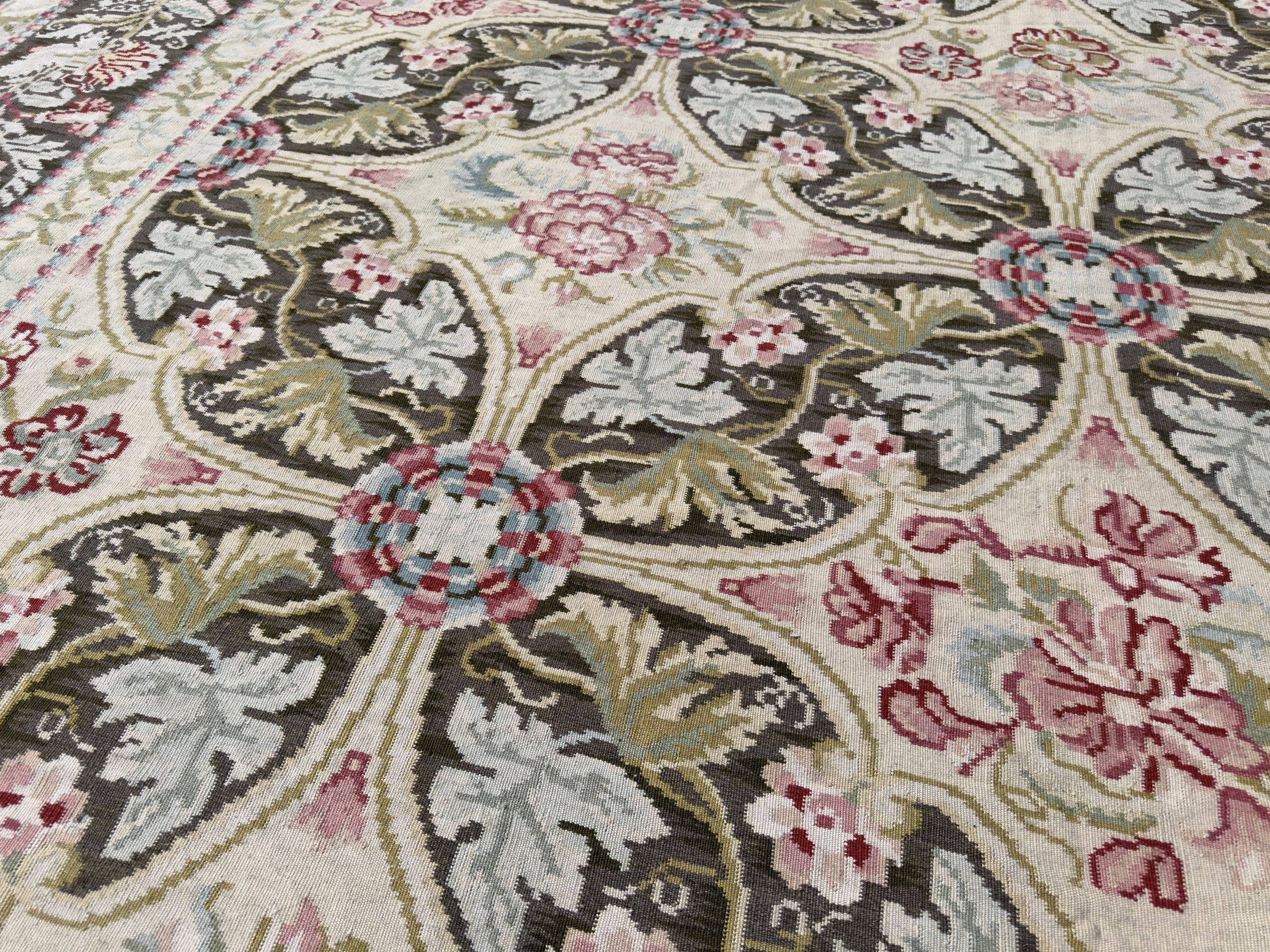 A contemporary Bessarabian kilim inspired by the traditional elements of antique kilims from the same name, this has been beautifully hand created using the best wool and natural dyes. The delicate floral sprays, with olive tones, taupes, and muted pinks and browns. Woven within the last 20 years this is a wonderful contemporary kilim, rare to find in this large size. View all the close up details and colours on al the additional images.