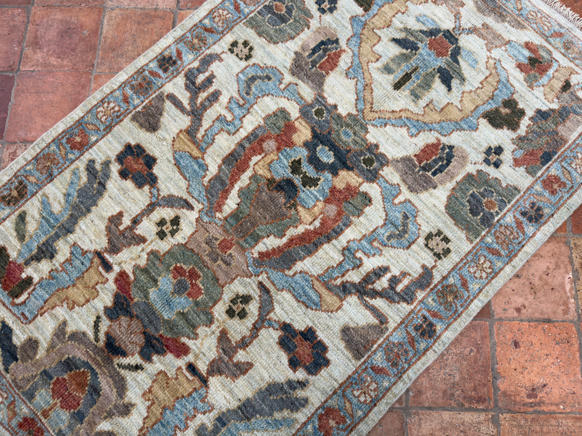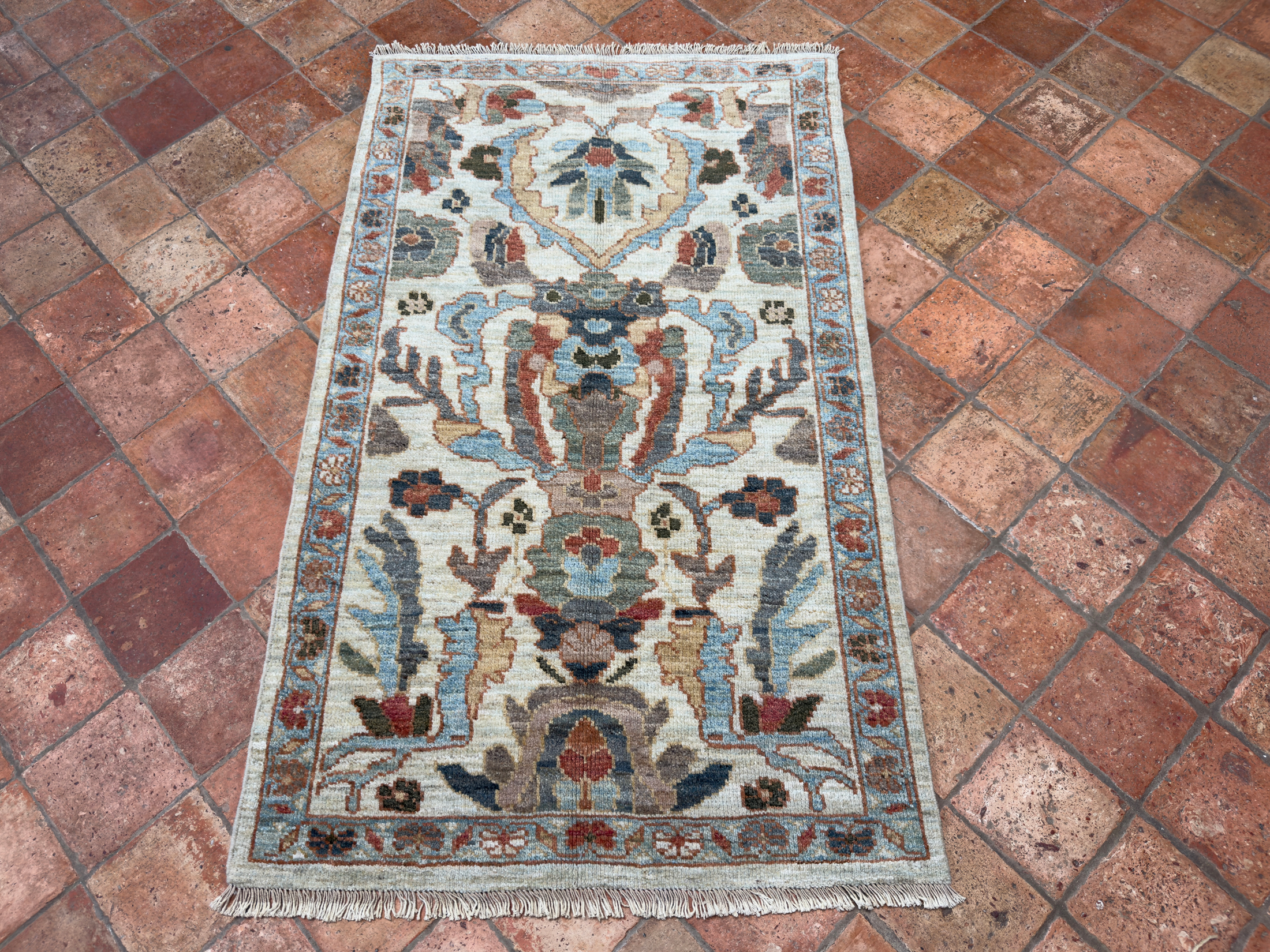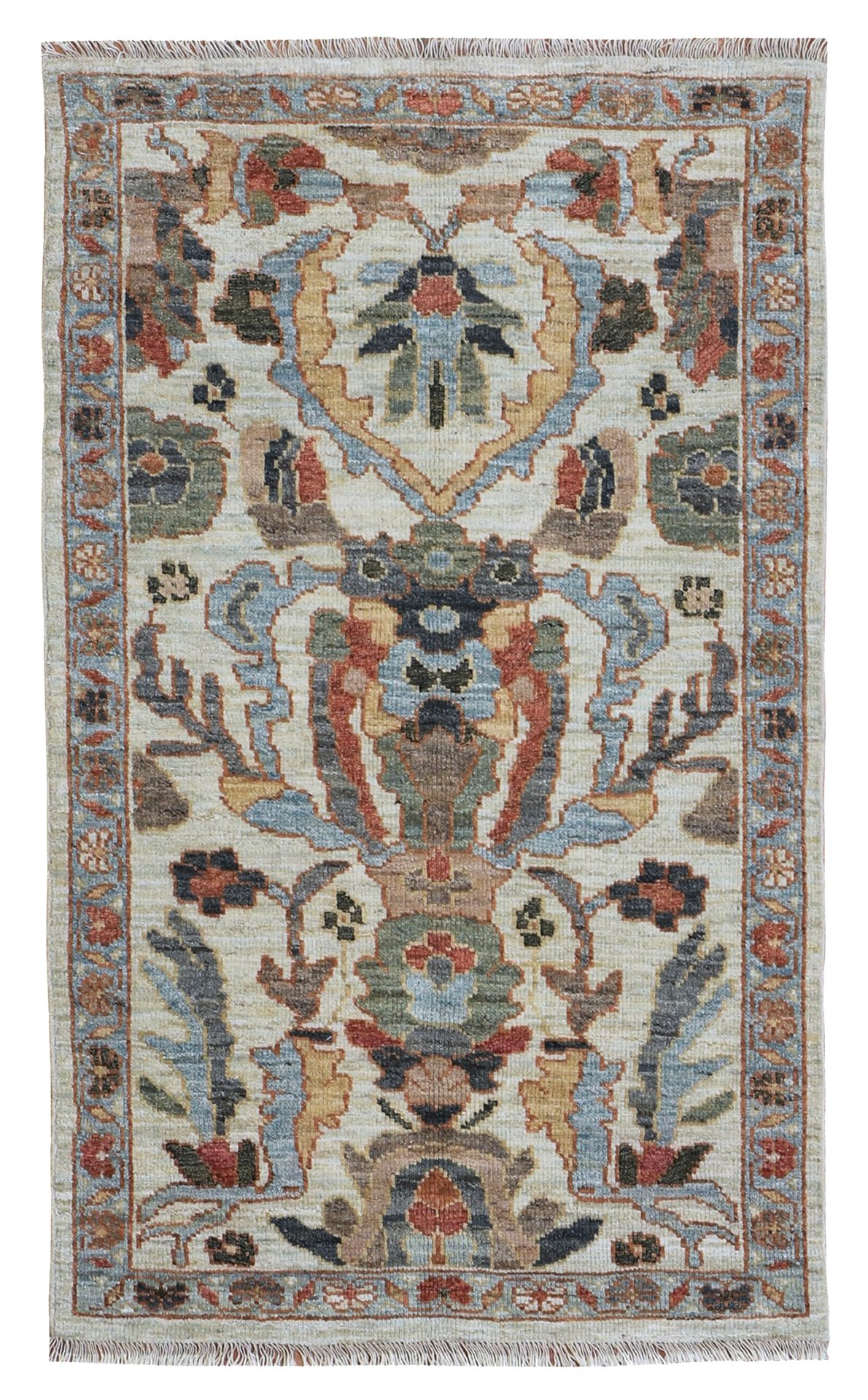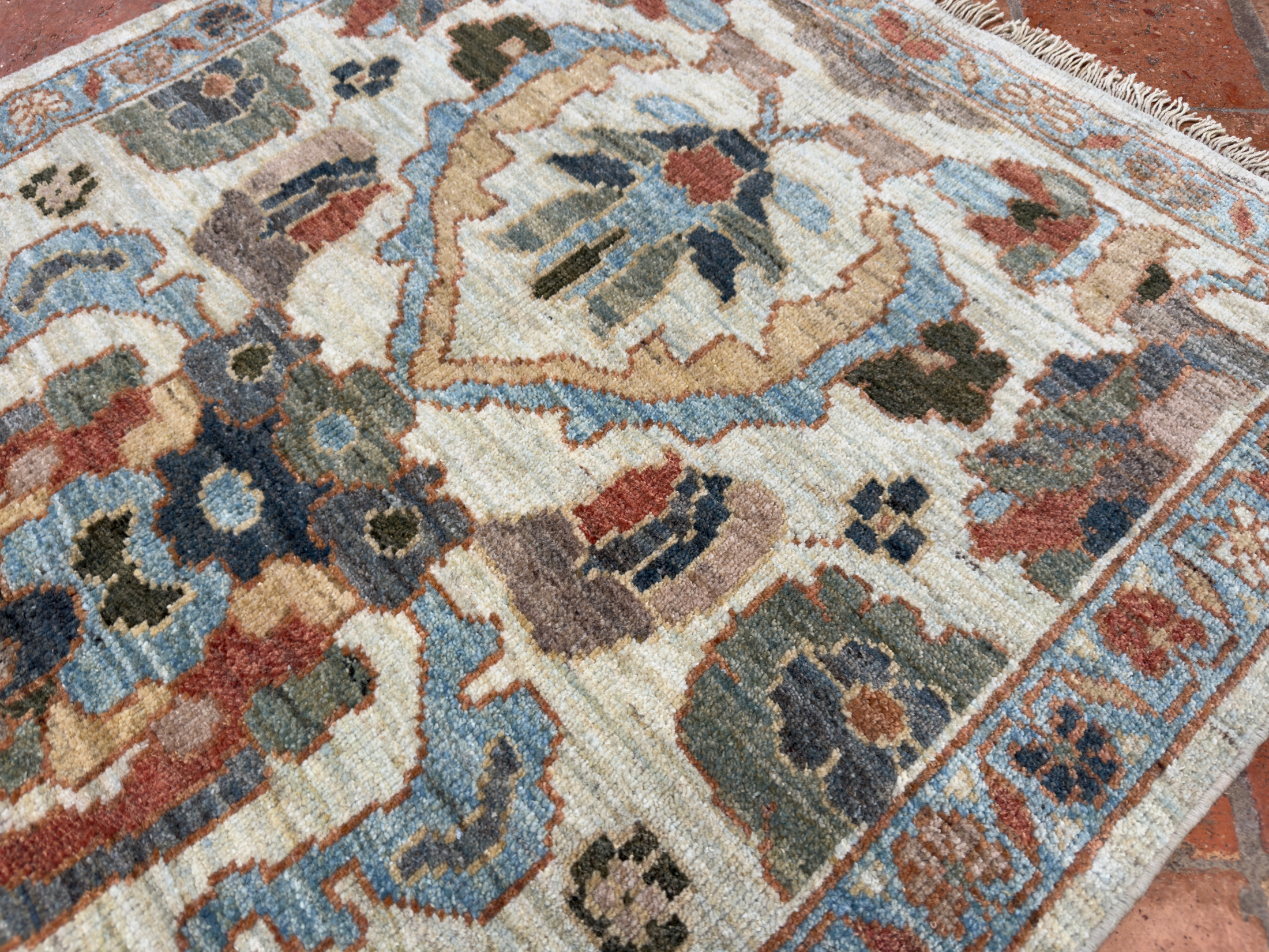 A contemporary Sultanabad rug, woven with soft greens and gold hues and subtle red tones to add warmth on the off white background. All hand-woven with natural dyes and all hand-spun wool. The wonderful small floral palmettes and vine designs we see on this modern rug are from the famous workshop carpets from Sultanabad, and specifically the Ziegler & Co from the late 19th century.