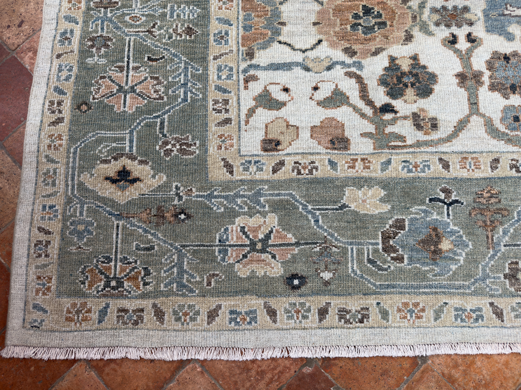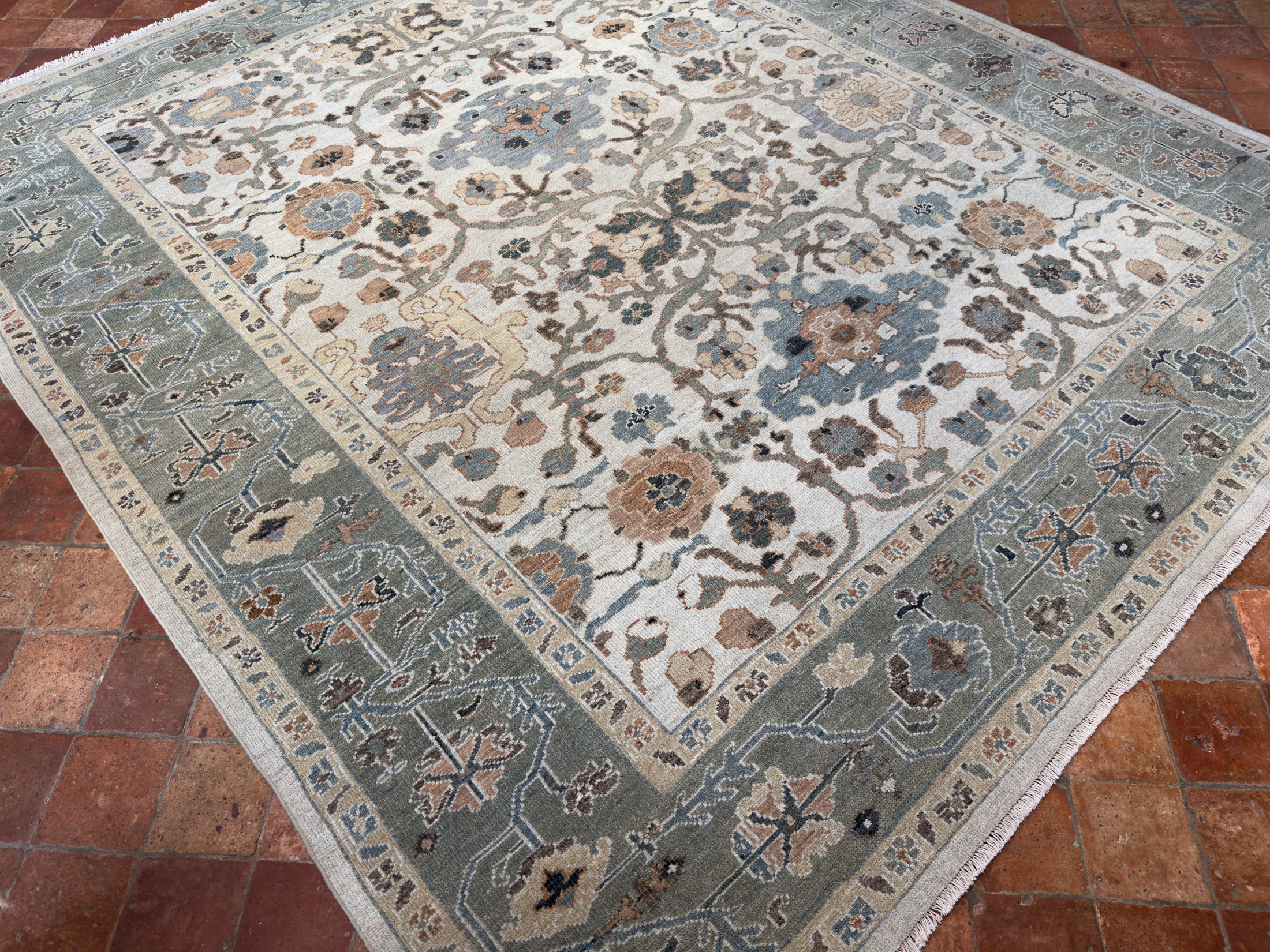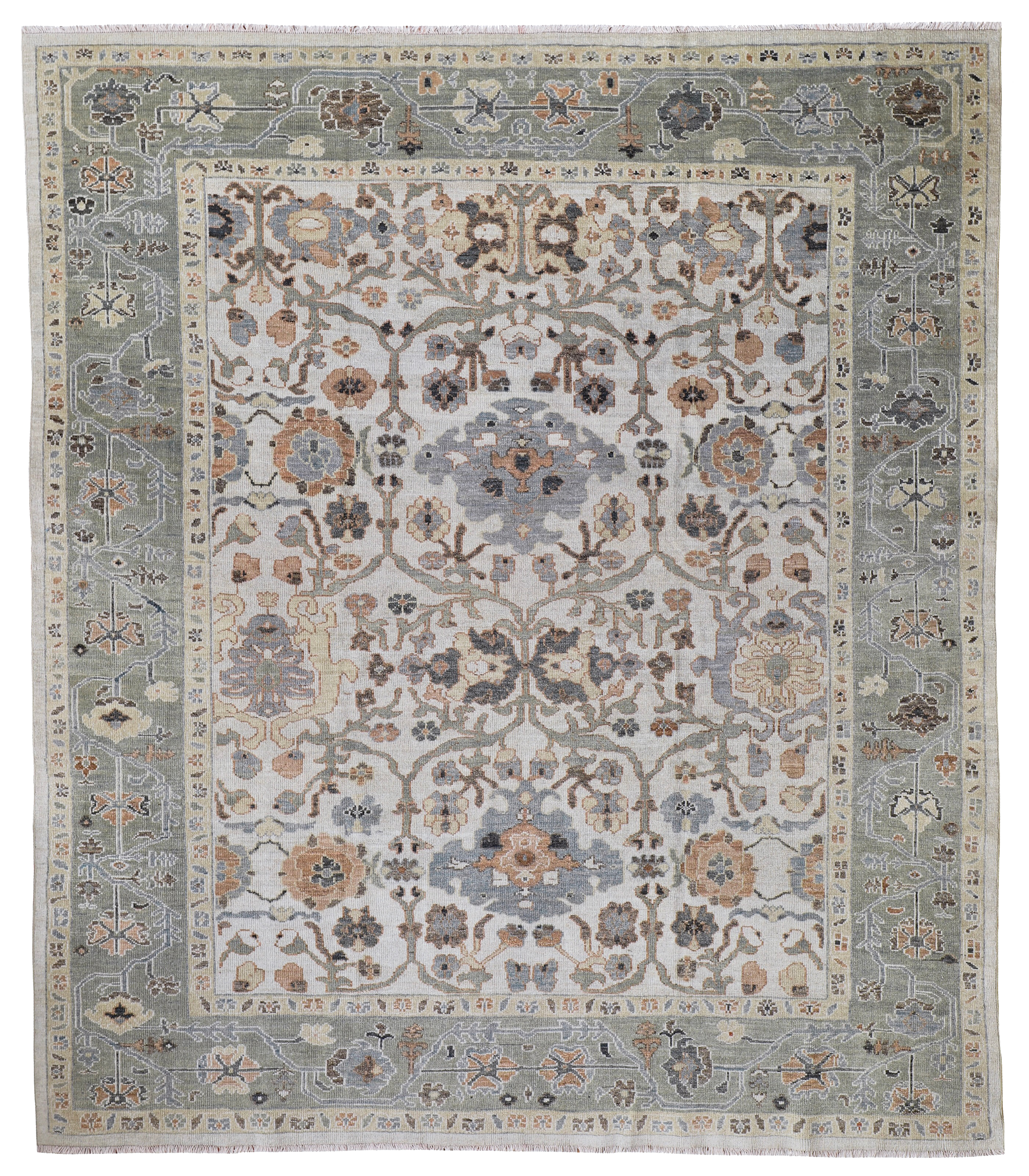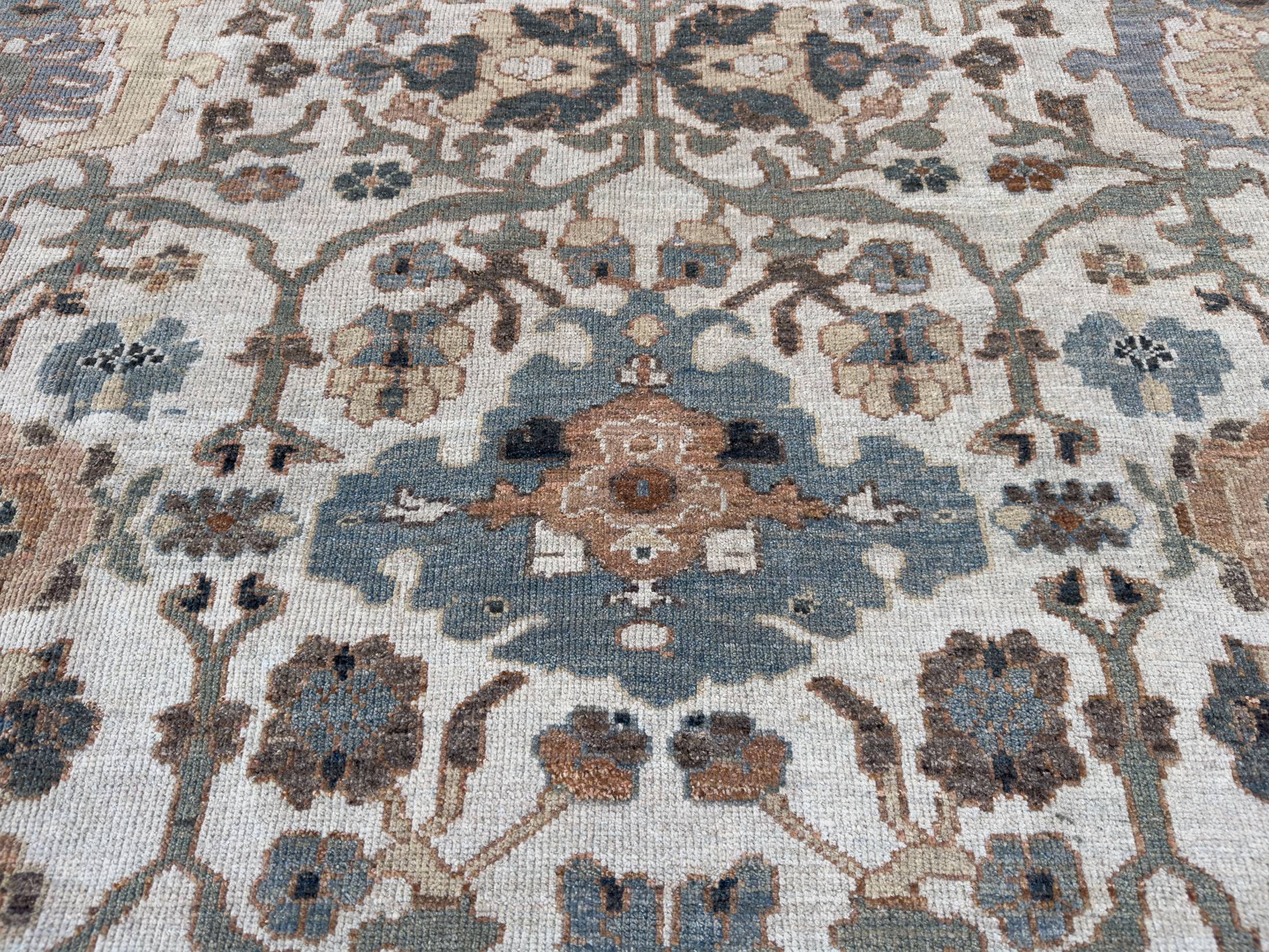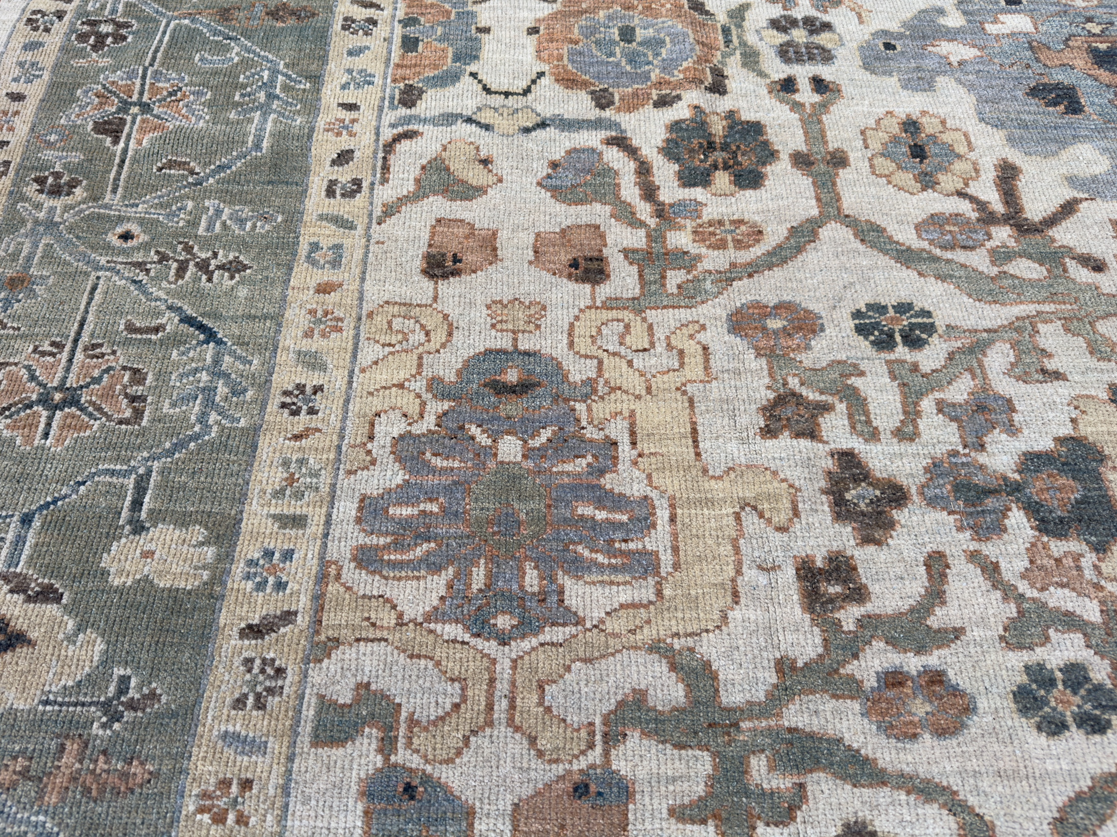 Contemporary Sultanabad design carpet, hand-woven using the best hand-spun wool and natural dyes. The pile height is cut low to medium high, making them look more like an antique carpet, and this means placing them in any room, they look like they have always lived there and they are very timeless in their look.
