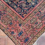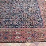 This 150 year old Farahan has such character and sublime natural faded dyes, the muted red/pinkish border is a really wonderful contrasting colour with the deep blue almost black background it brings the old greens and light blues and pinks to the surface on the floral motifs. Some lower areas of pile, as you can see in the additional images, but still a strong and durable antique carpet, supplied with our anti-slip underlay.