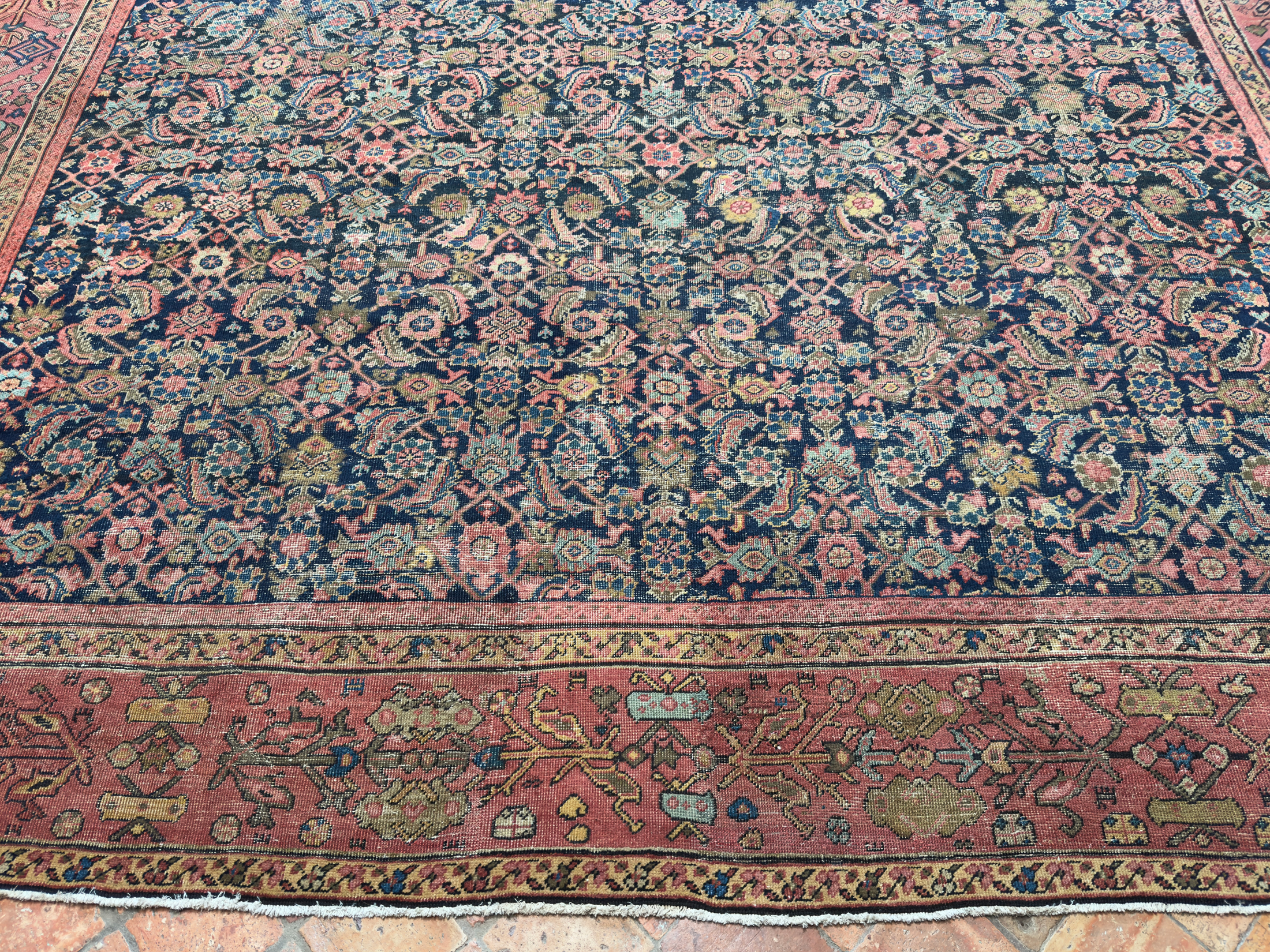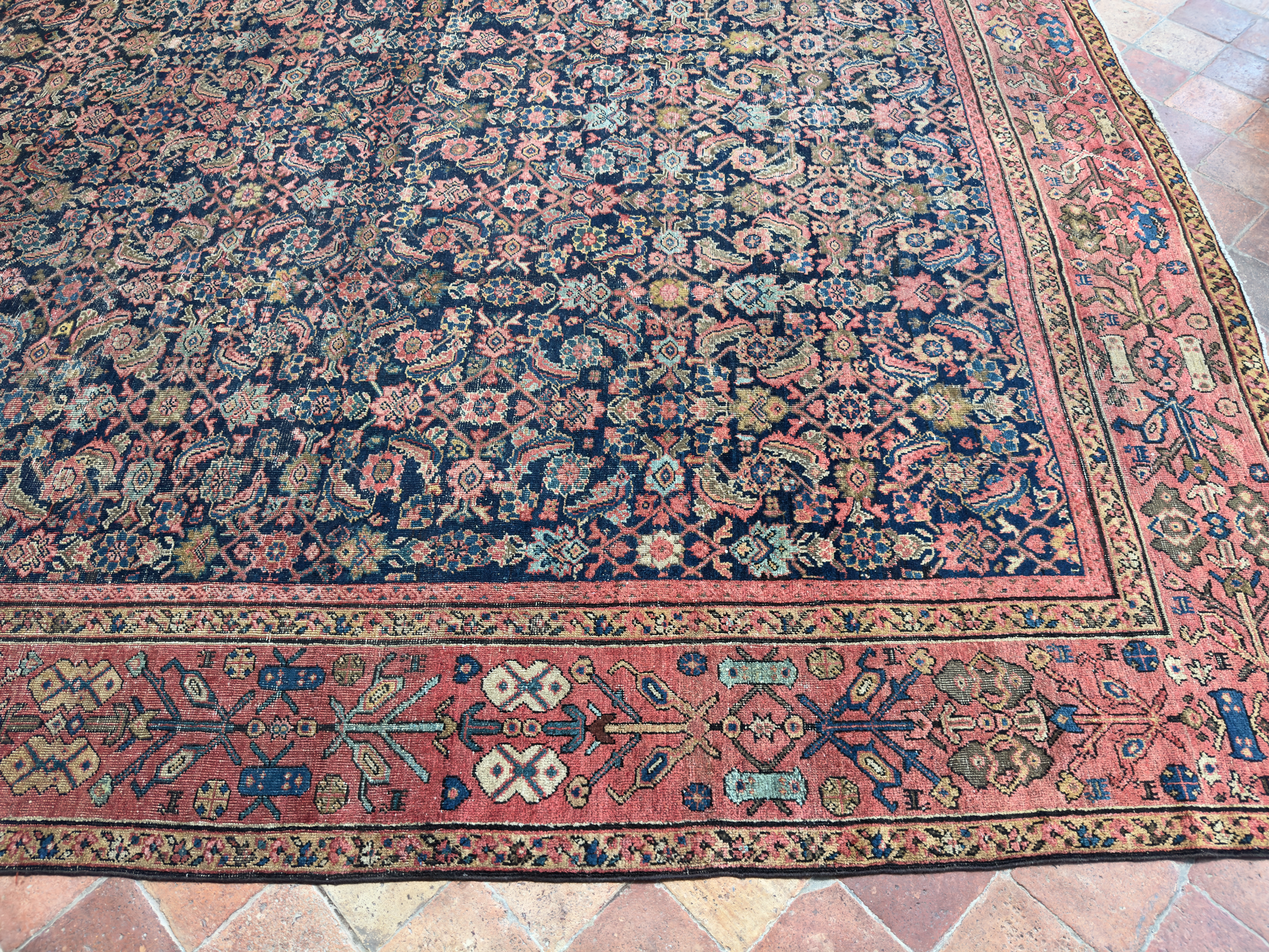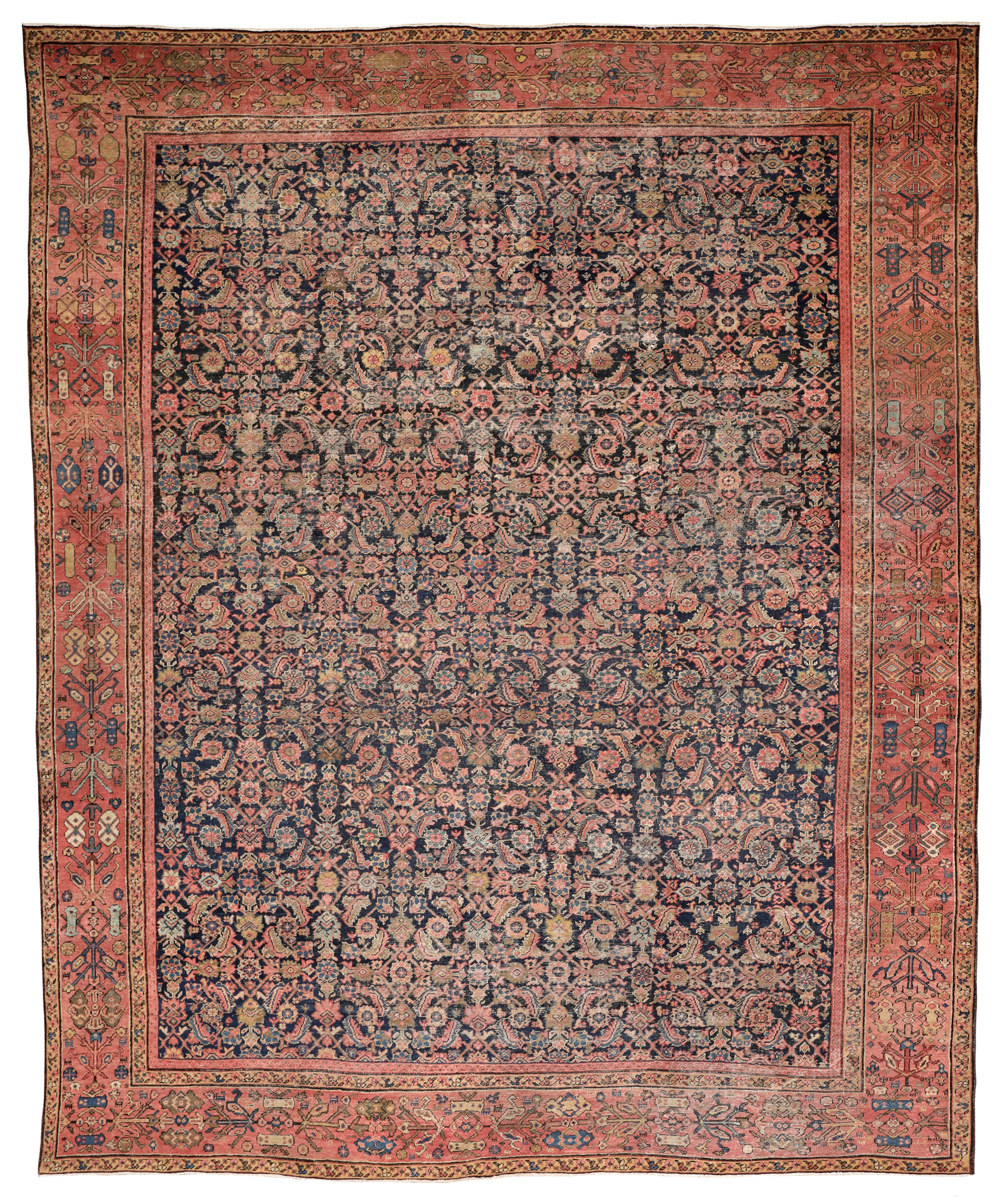 This 150 year old Farahan has such character and sublime natural faded dyes, the muted red/pinkish border is a really wonderful contrasting colour with the deep blue almost black background it brings the old greens and light blues and pinks to the surface on the floral motifs. Some lower areas of pile, as you can see in the additional images, but still a strong and durable antique carpet, supplied with our anti-slip underlay.