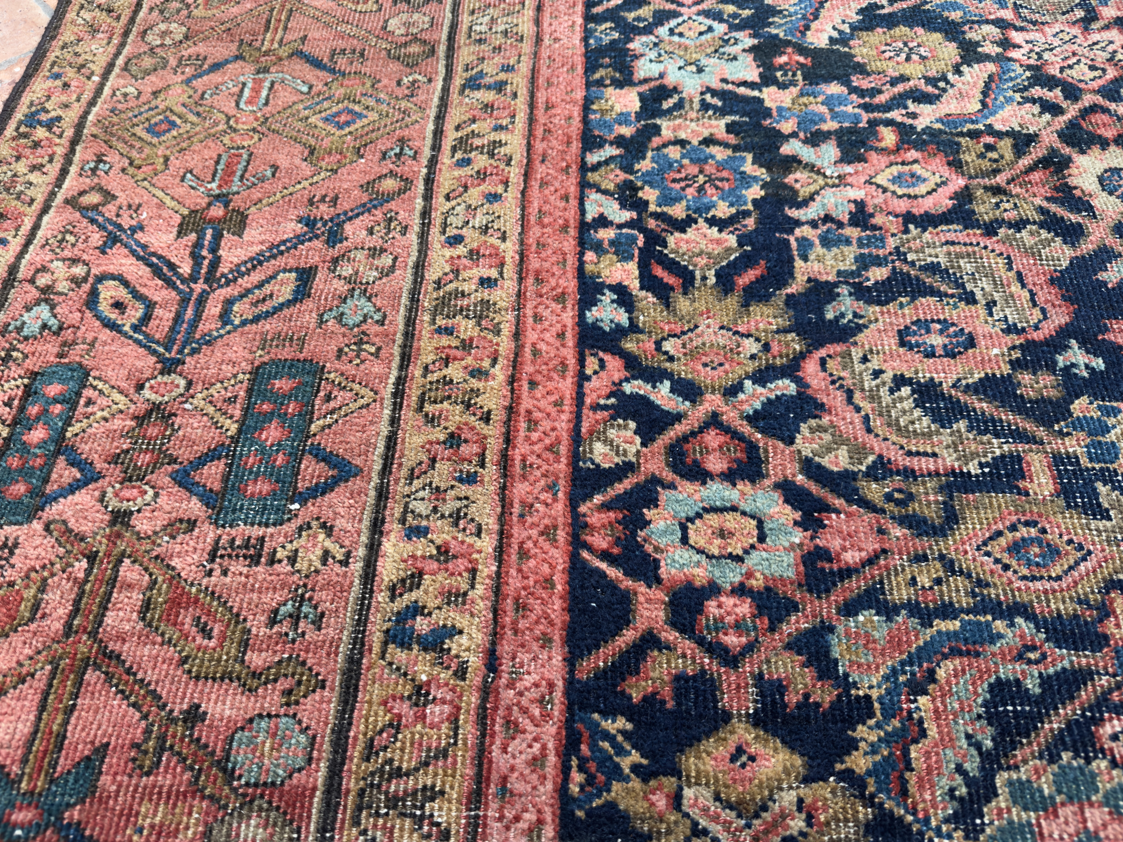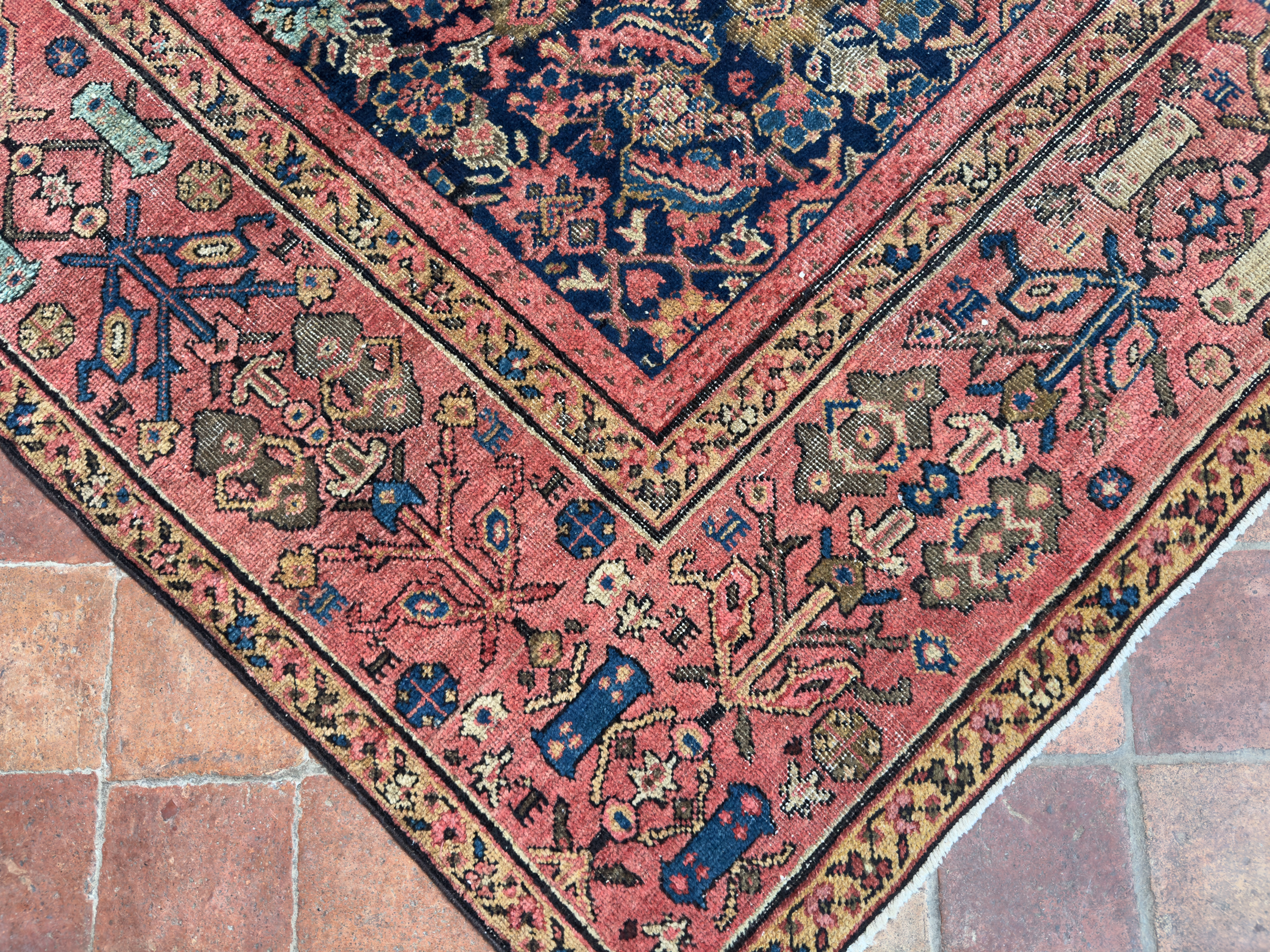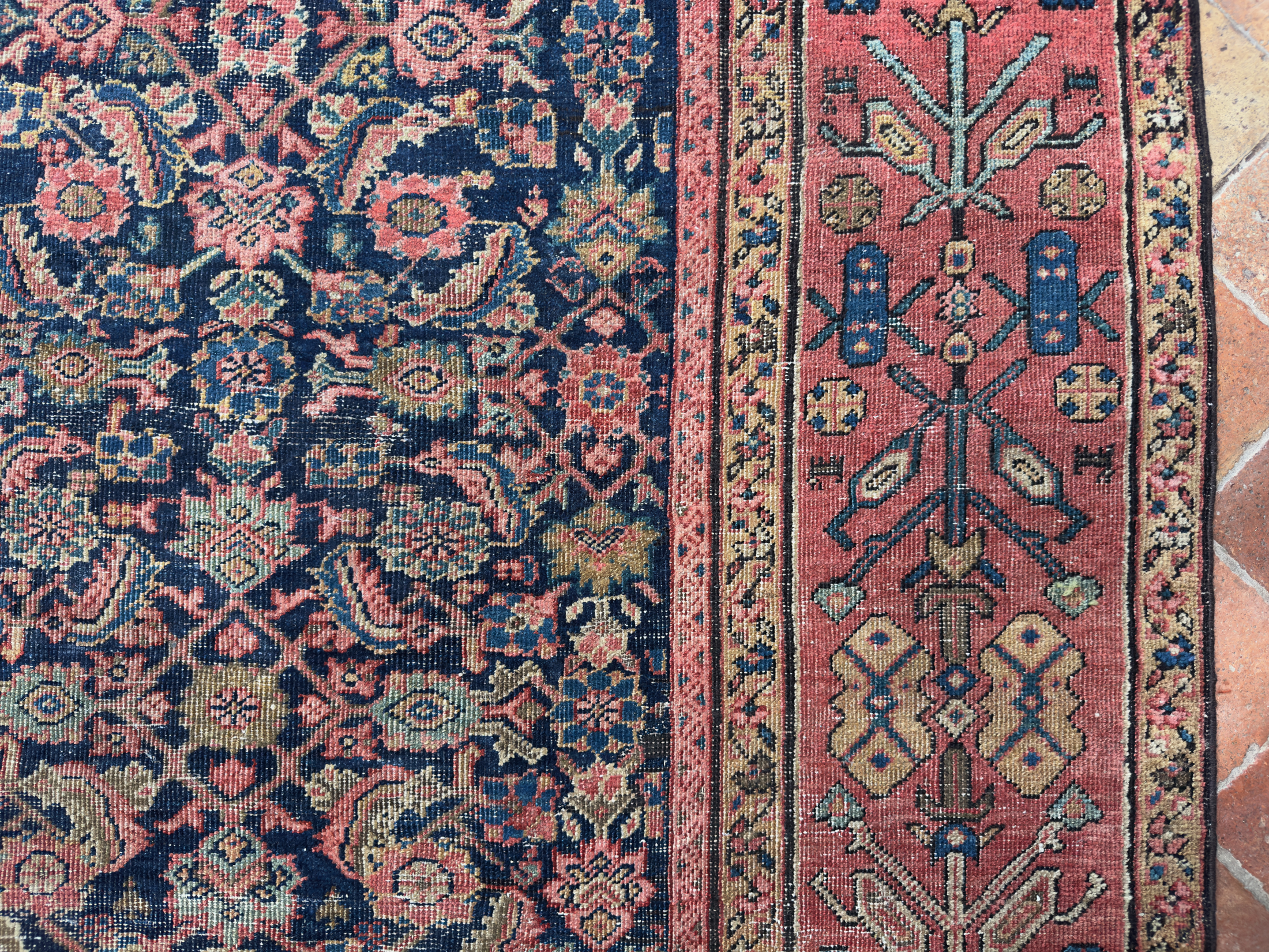 This 150 year old Farahan has such character and sublime natural faded dyes, the muted red/pinkish border is a really wonderful contrasting colour with the deep blue almost black background it brings the old greens and light blues and pinks to the surface on the floral motifs. Some lower areas of pile, as you can see in the additional images, but still a strong and durable antique carpet, supplied with our anti-slip underlay.