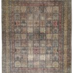 A finely woven and beautiful distressed antique Kirman carpet, with an all over panel garden design.  Showing a wonderful variant of floral elements, from Cypress and Shrub trees in soft colours.  An incredibly decorative and interesting carpet, the detailing is exquisite all woven by hand around 110 years ago.