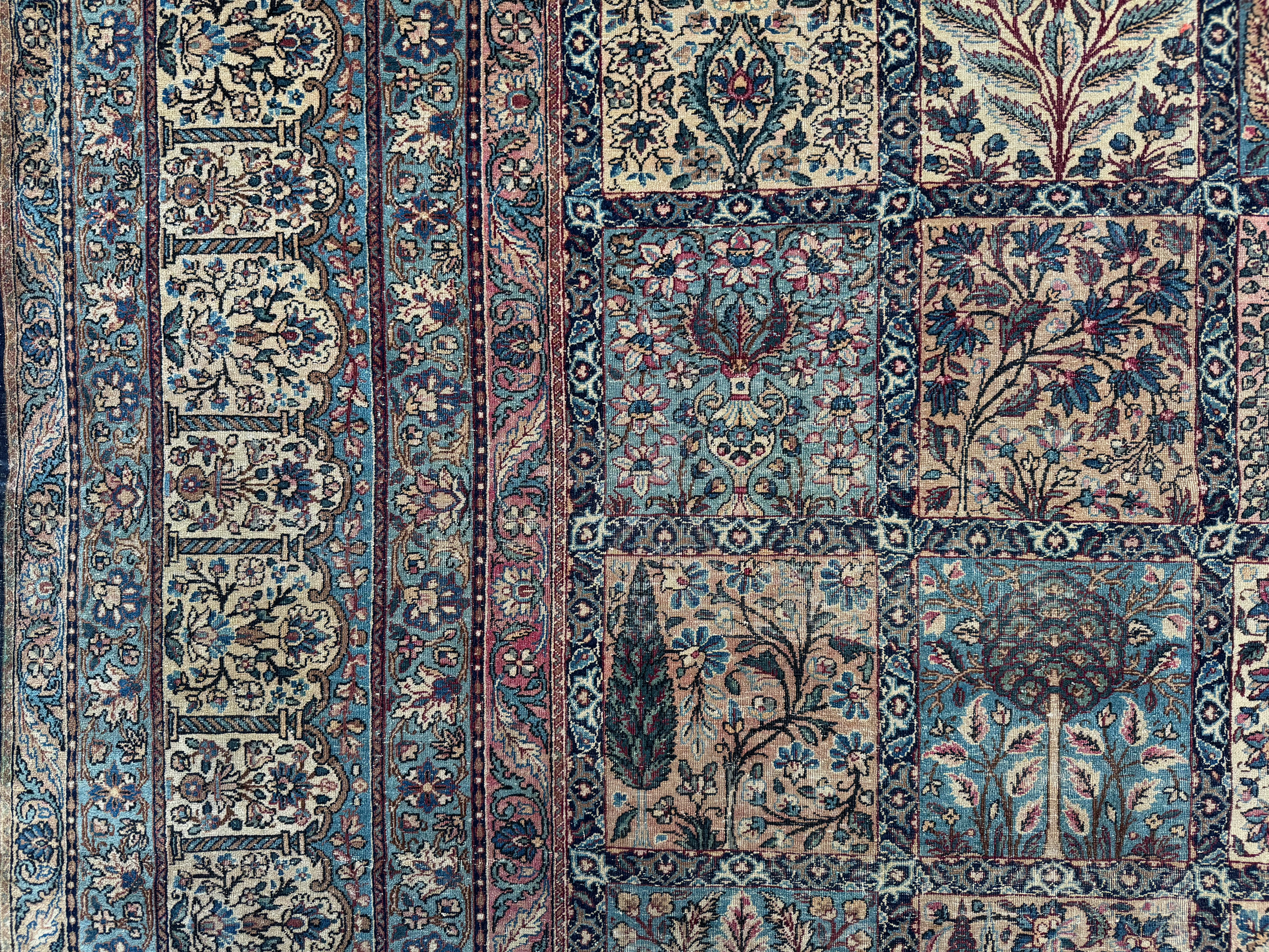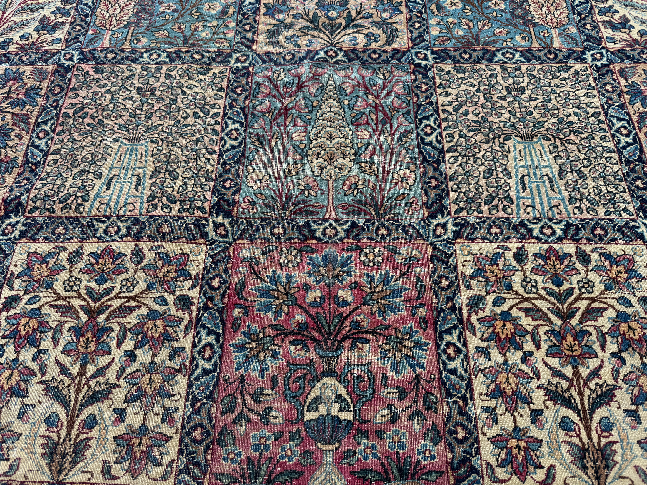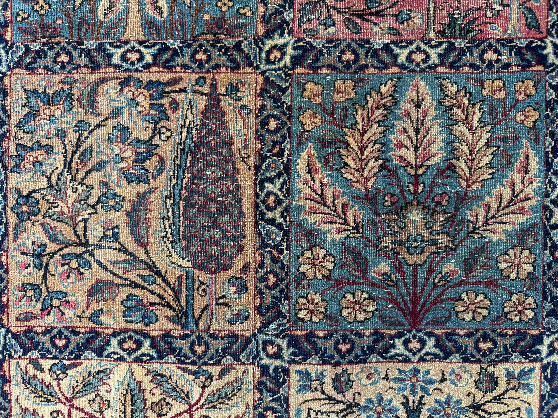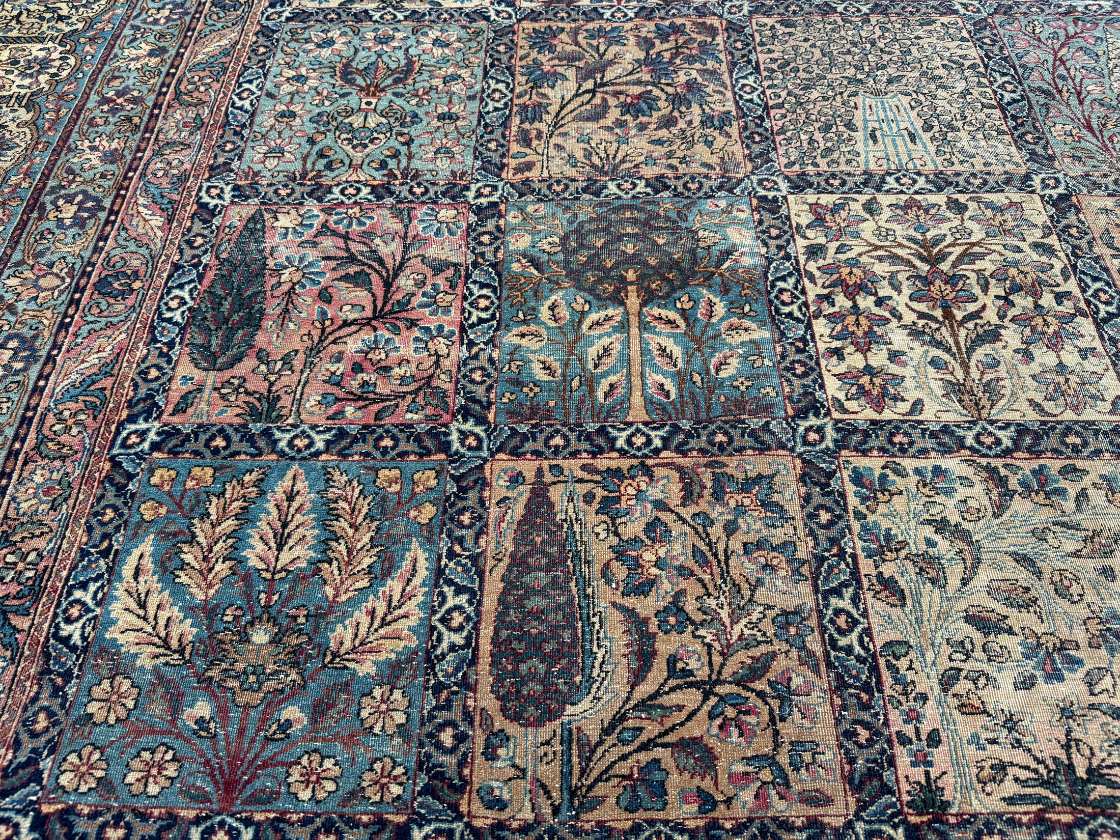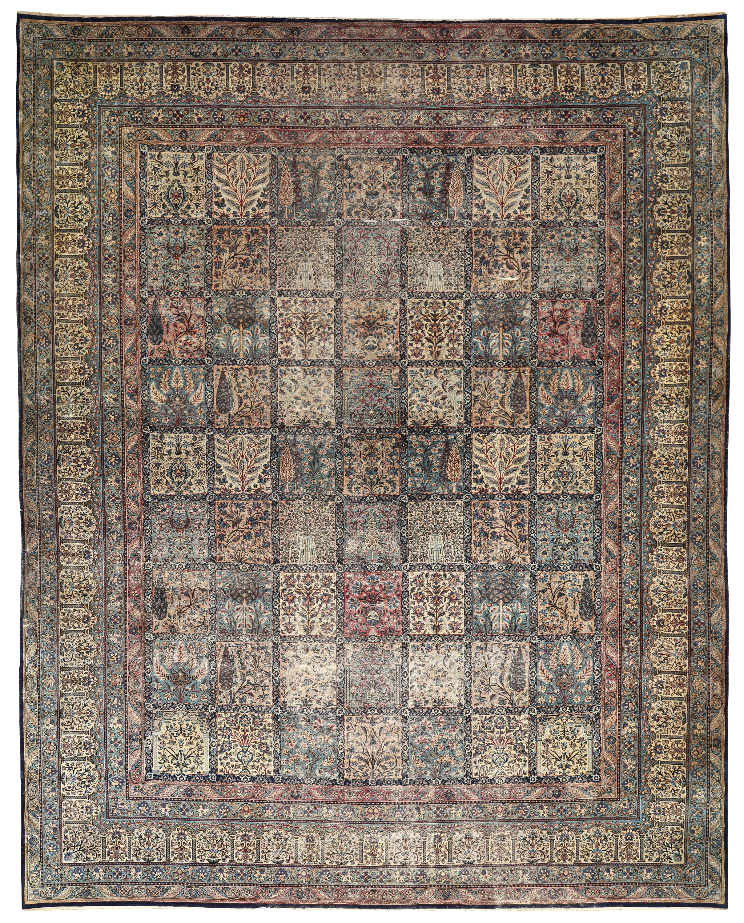 A finely woven and beautiful distressed antique Kirman carpet, with an all over panel garden design.  Showing a wonderful variant of floral elements, from Cypress and Shrub trees in soft colours.  An incredibly decorative and interesting carpet, the detailing is exquisite all woven by hand around 110 years ago.