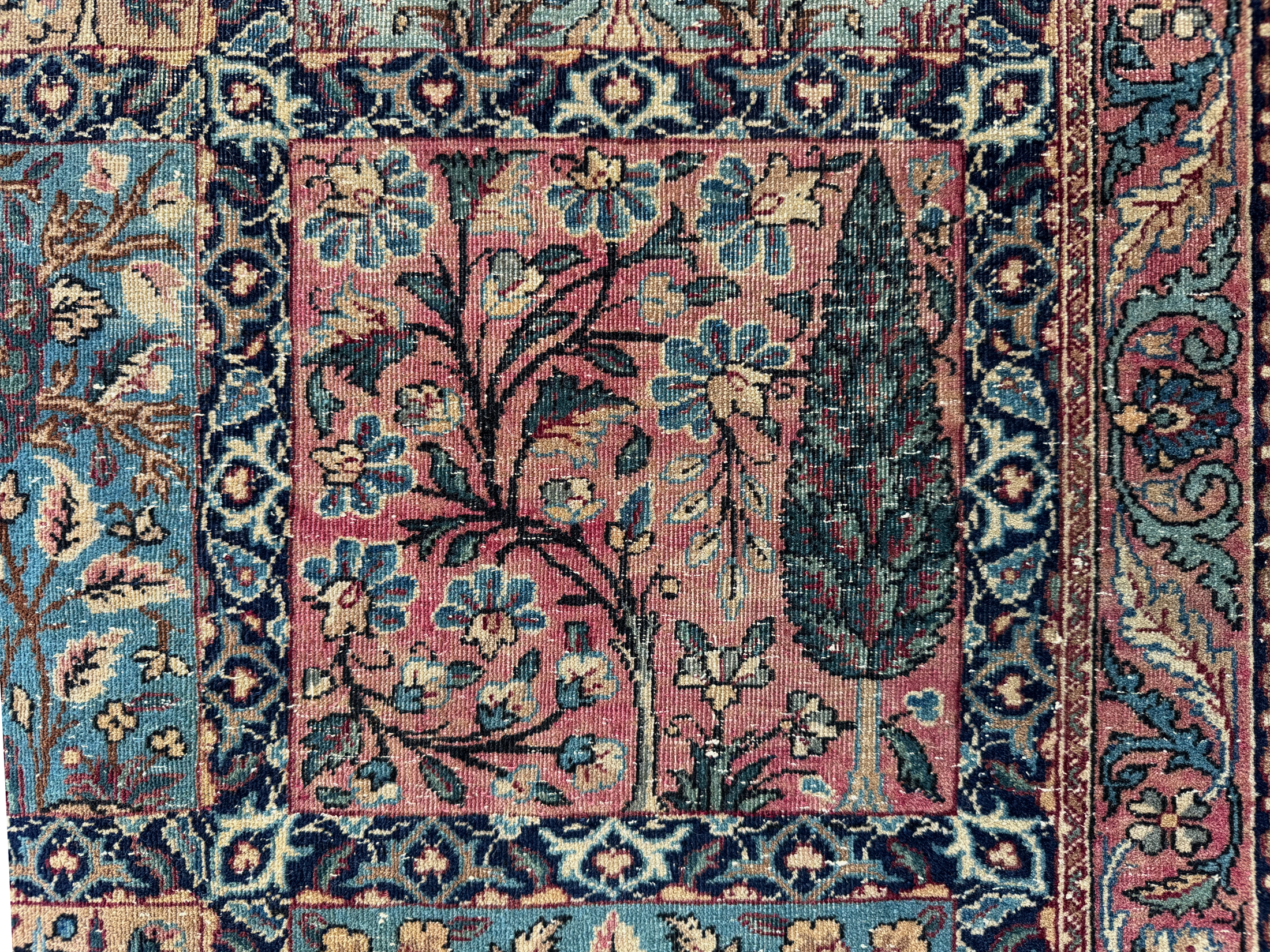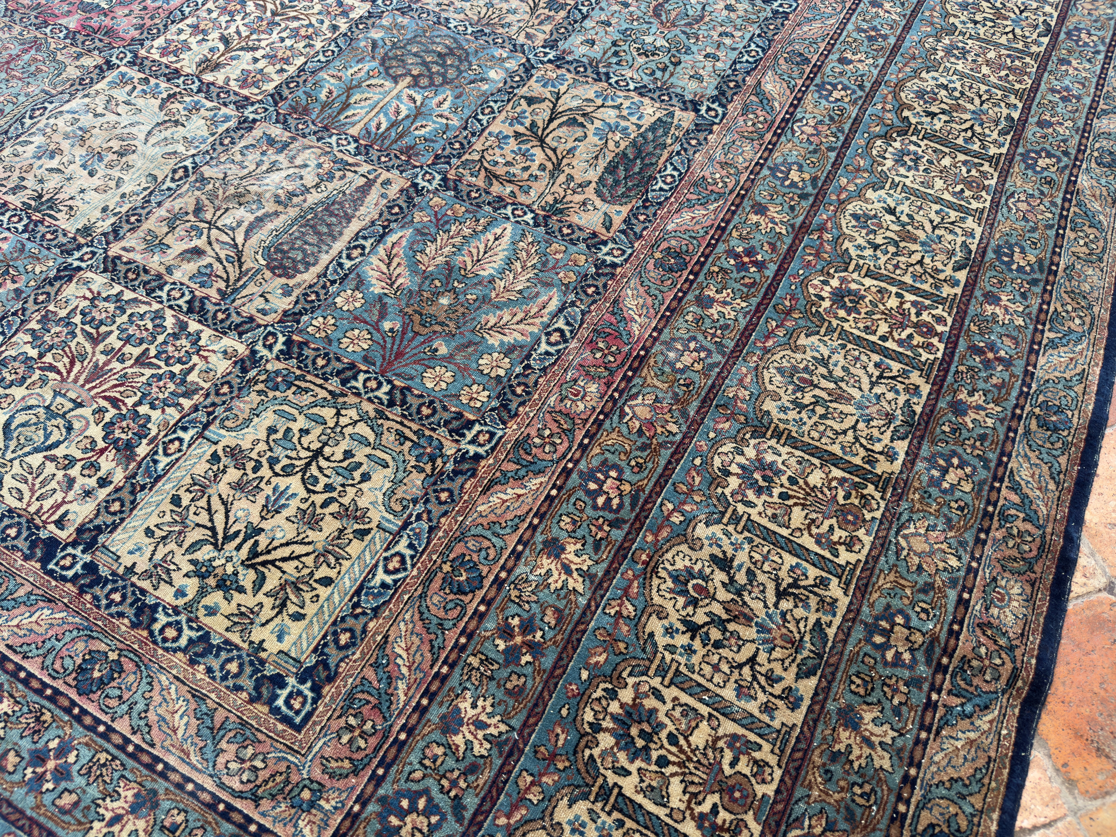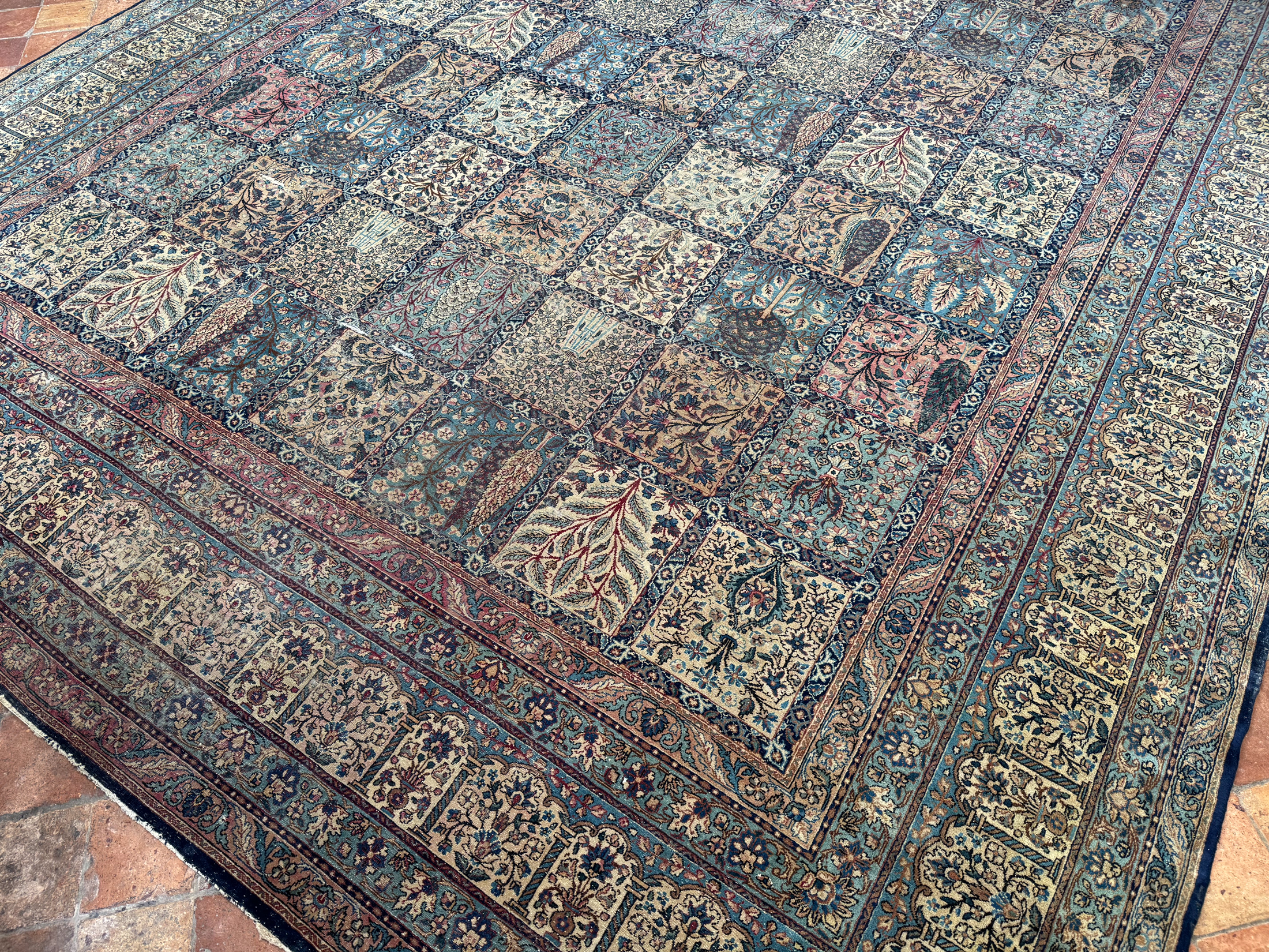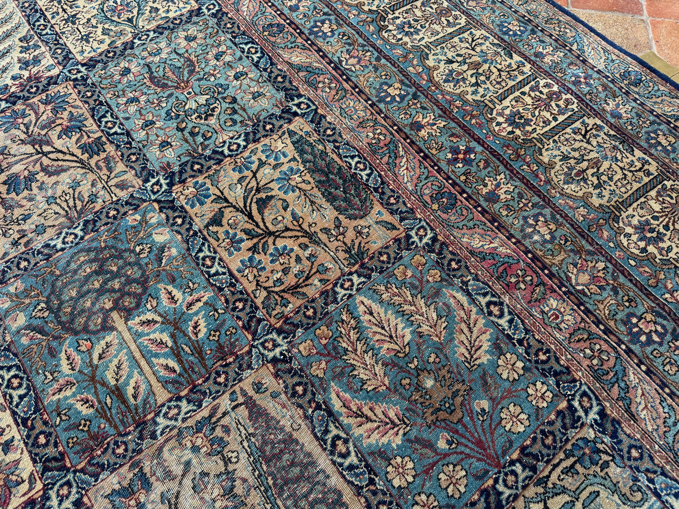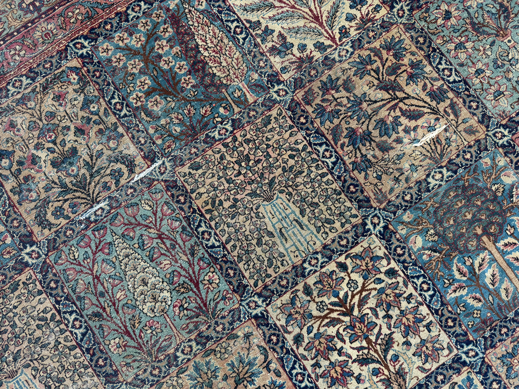 A finely woven and beautiful distressed antique Kirman carpet, with an all over panel garden design.  Showing a wonderful variant of floral elements, from Cypress and Shrub trees in soft colours.  An incredibly decorative and interesting carpet, the detailing is exquisite all woven by hand around 110 years ago.