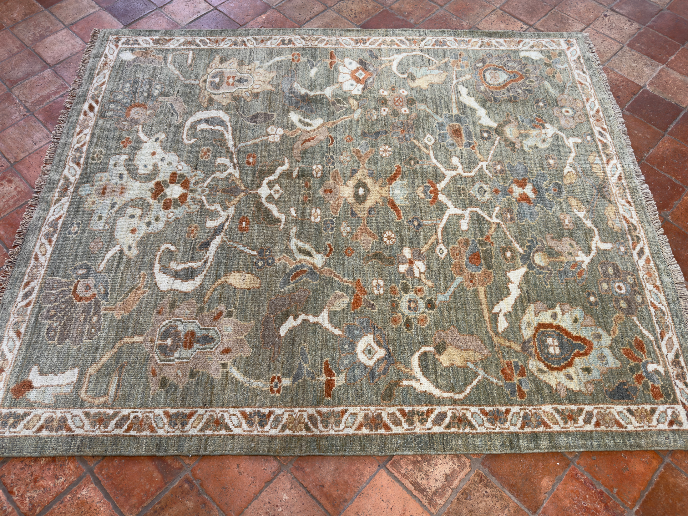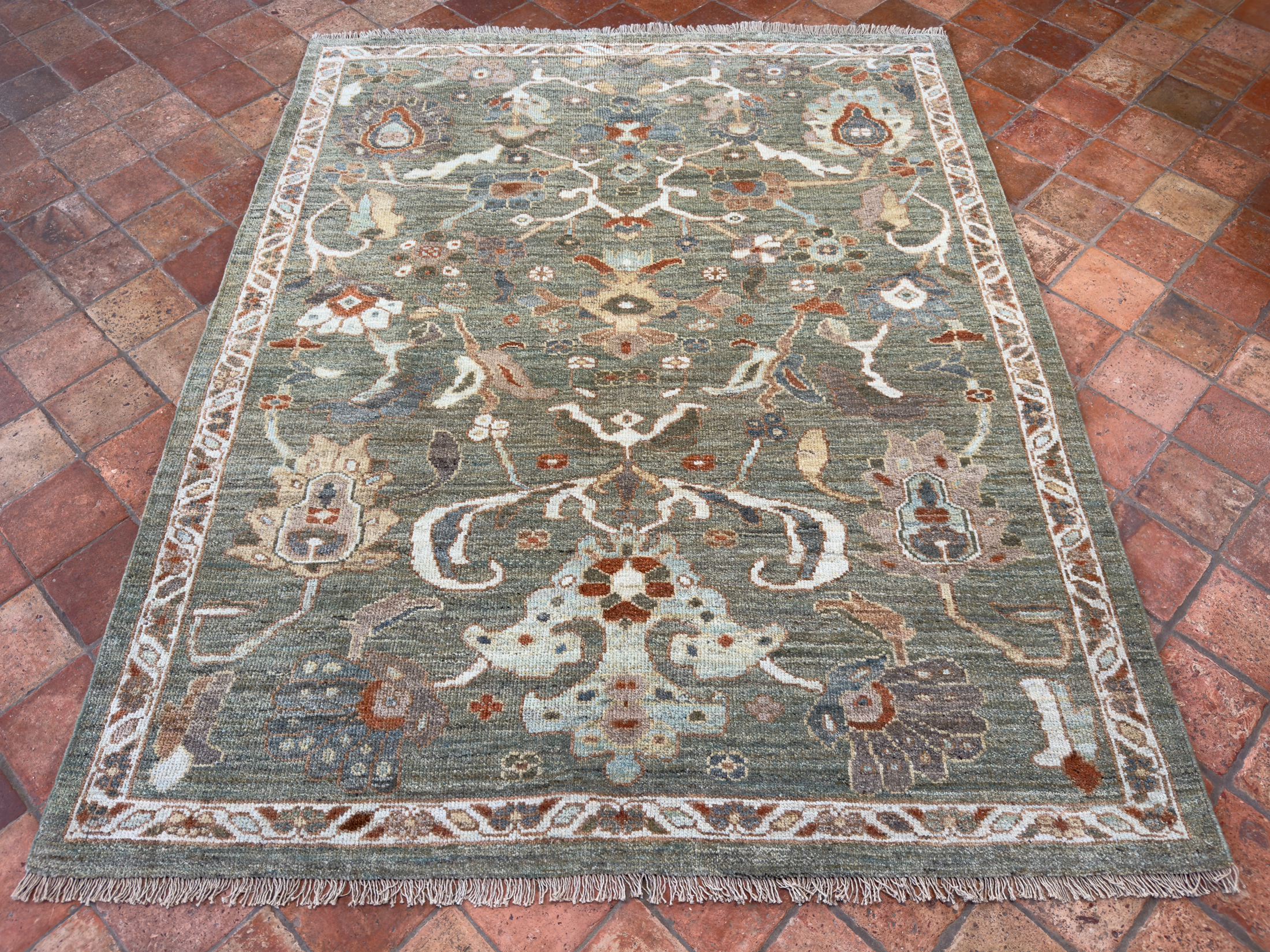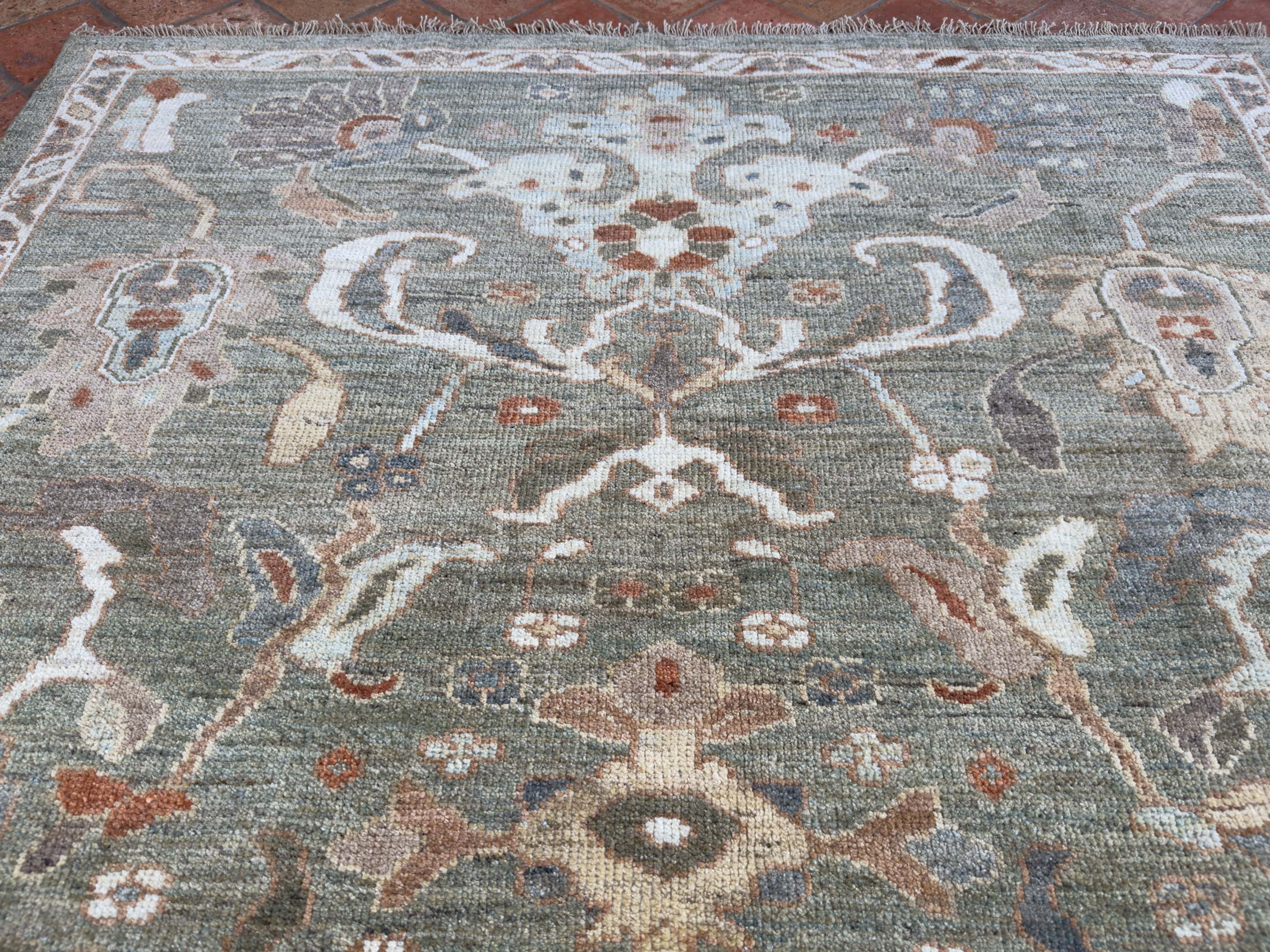 A beautiful array of green dyes have been used to weave this contemporary Sultanabad rug, a small light border surrounds background, using soft pink tones, sage greens and gold and red hues to add warmth. All hand-woven with natural dyes and all hand-spun wool. The wonderful small floral palmettes and vine designs we see on this modern rug are from the famous workshop carpets from Sultanabad, and specifically the Ziegler & Co from the late 19th century.