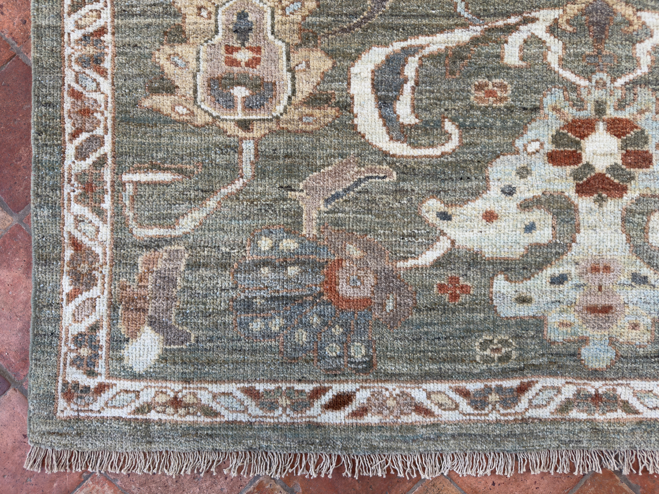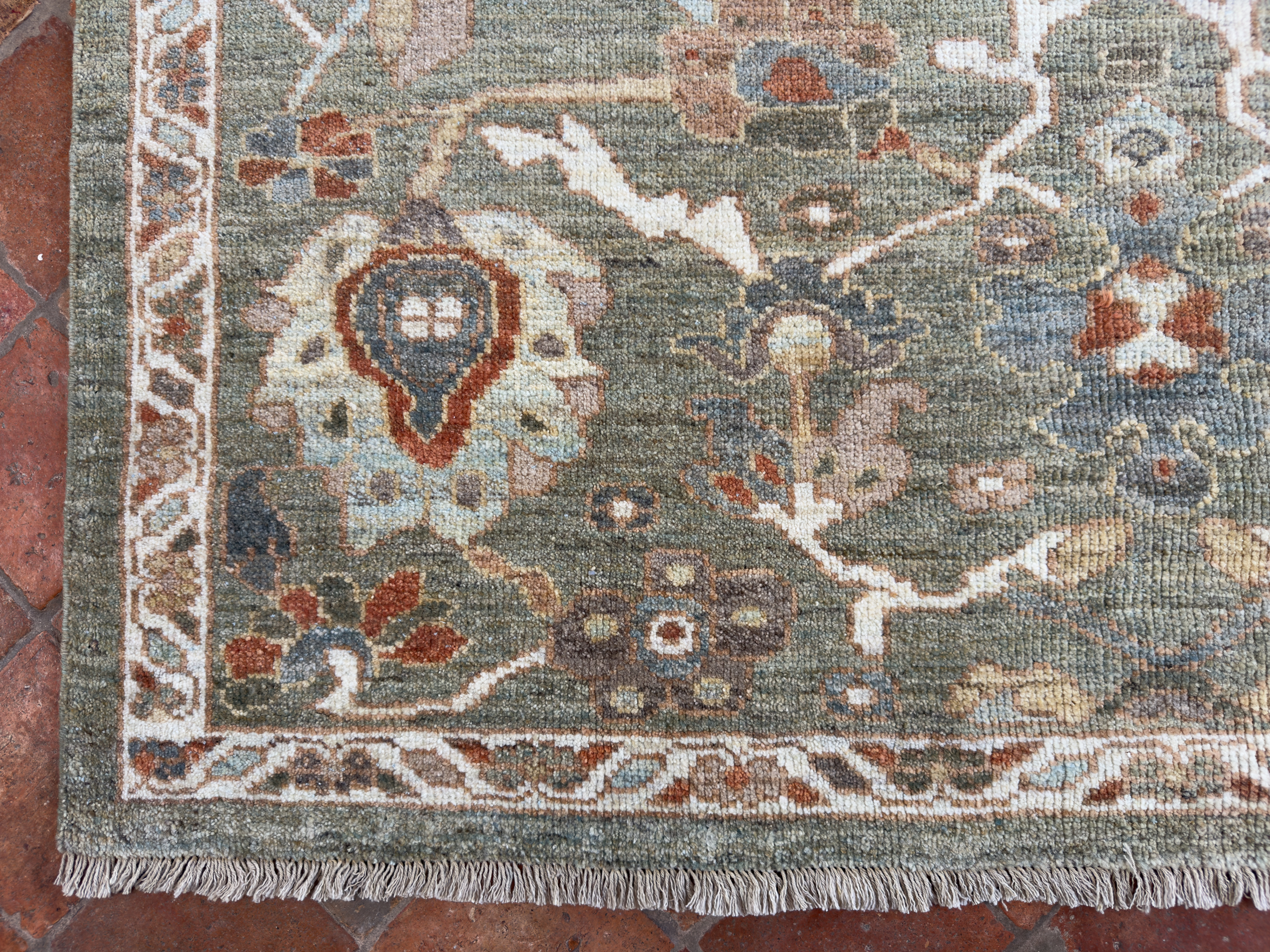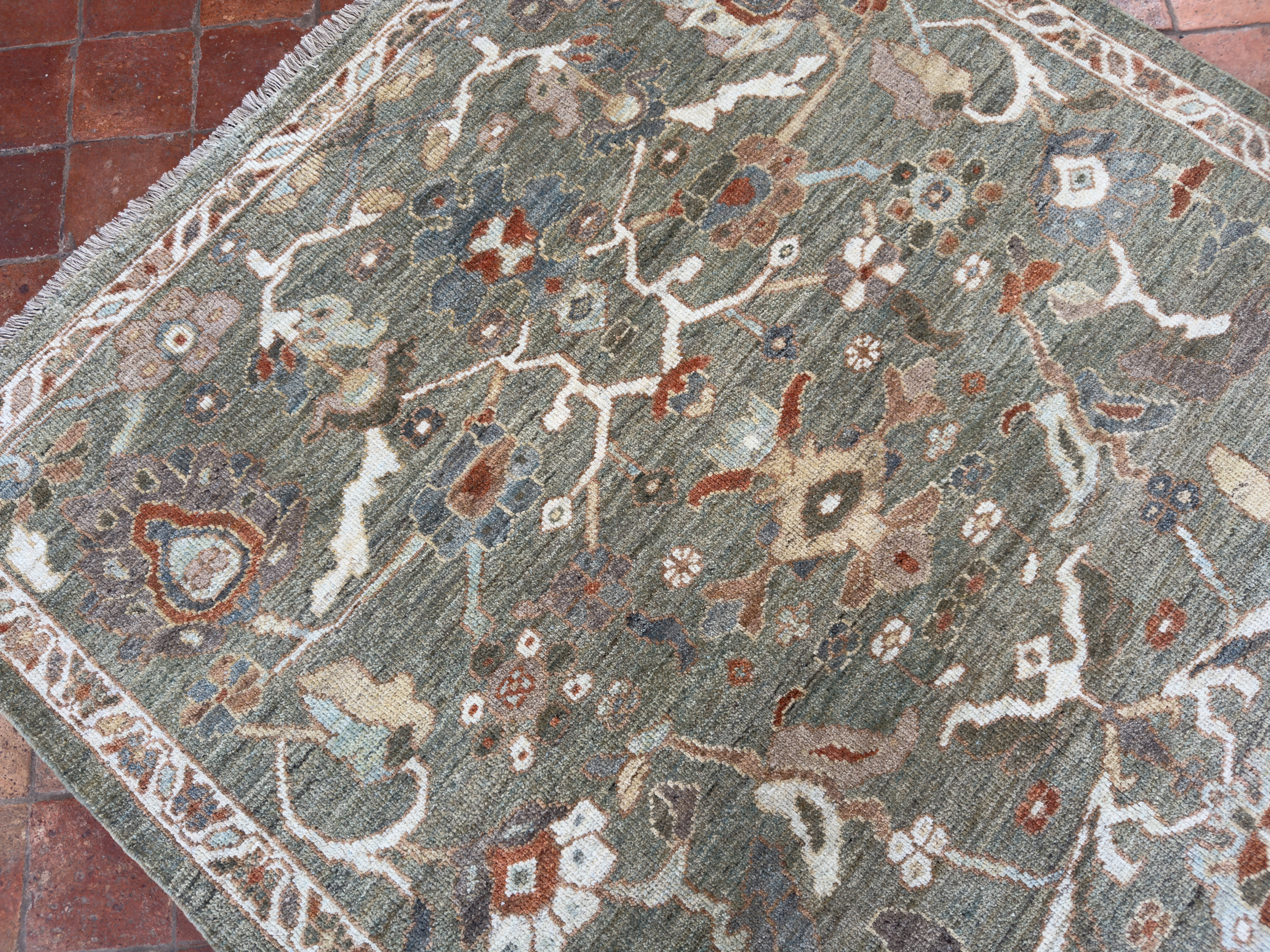 A beautiful array of green dyes have been used to weave this contemporary Sultanabad rug, a small light border surrounds background, using soft pink tones, sage greens and gold and red hues to add warmth. All hand-woven with natural dyes and all hand-spun wool. The wonderful small floral palmettes and vine designs we see on this modern rug are from the famous workshop carpets from Sultanabad, and specifically the Ziegler & Co from the late 19th century.