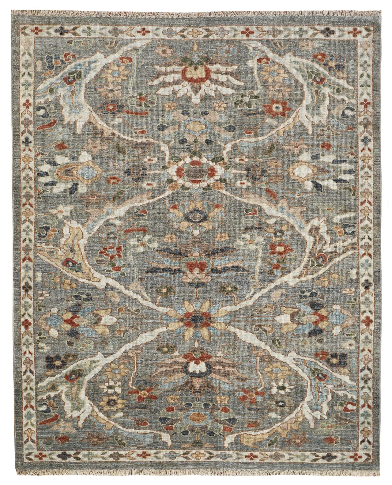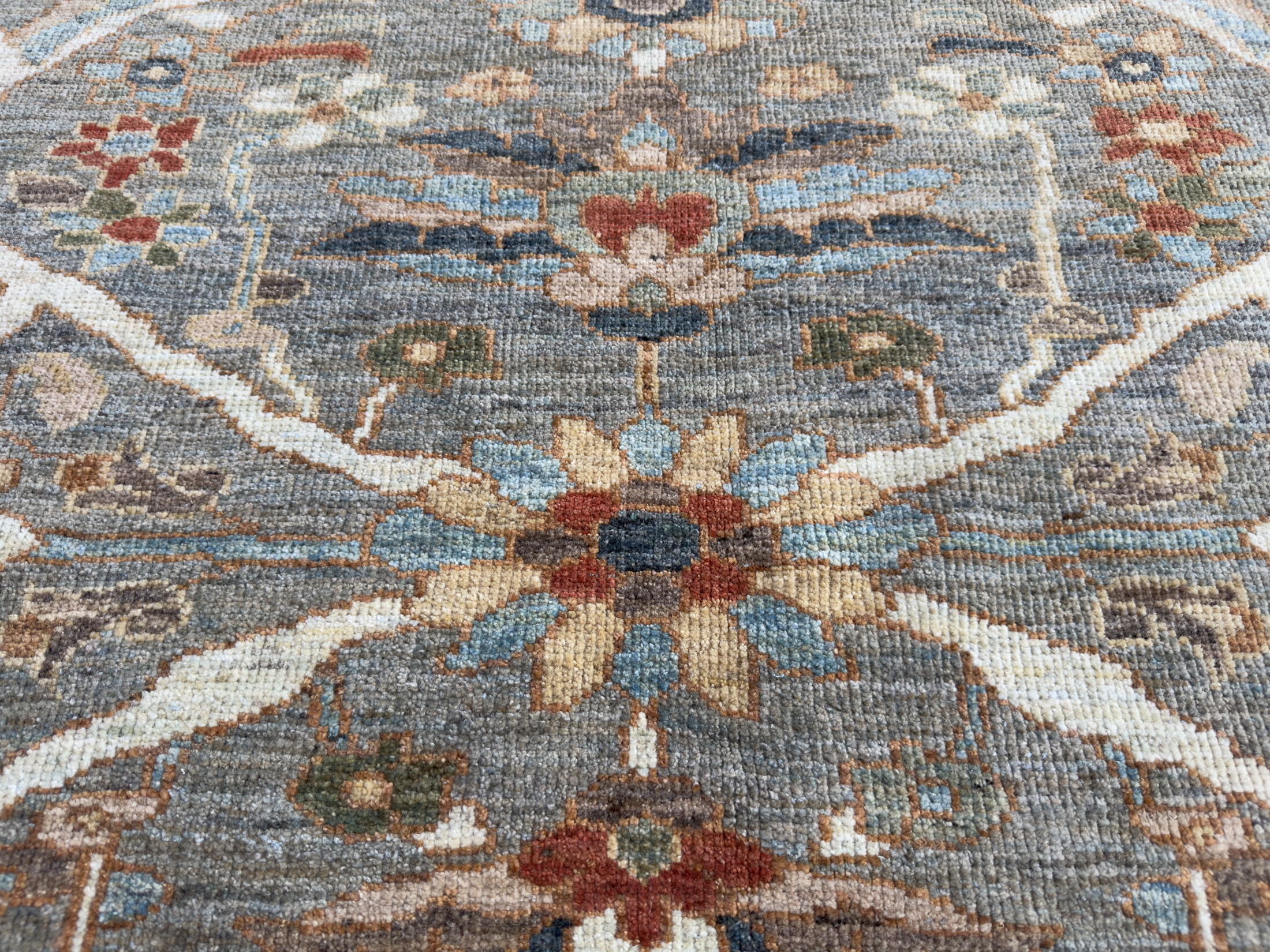 A rich variety of greys and browns have been used on this contemporary Sultanabad rug, a small light border surrounds background, using soft pink tones, sage greens and gold and red hues to add warmth. All hand-woven with natural dyes and all hand-spun wool. The wonderful small floral palmettes and vine designs we see on this modern rug are from the famous workshop carpets from Sultanabad, and specifically the Ziegler & Co from the late 19th century.