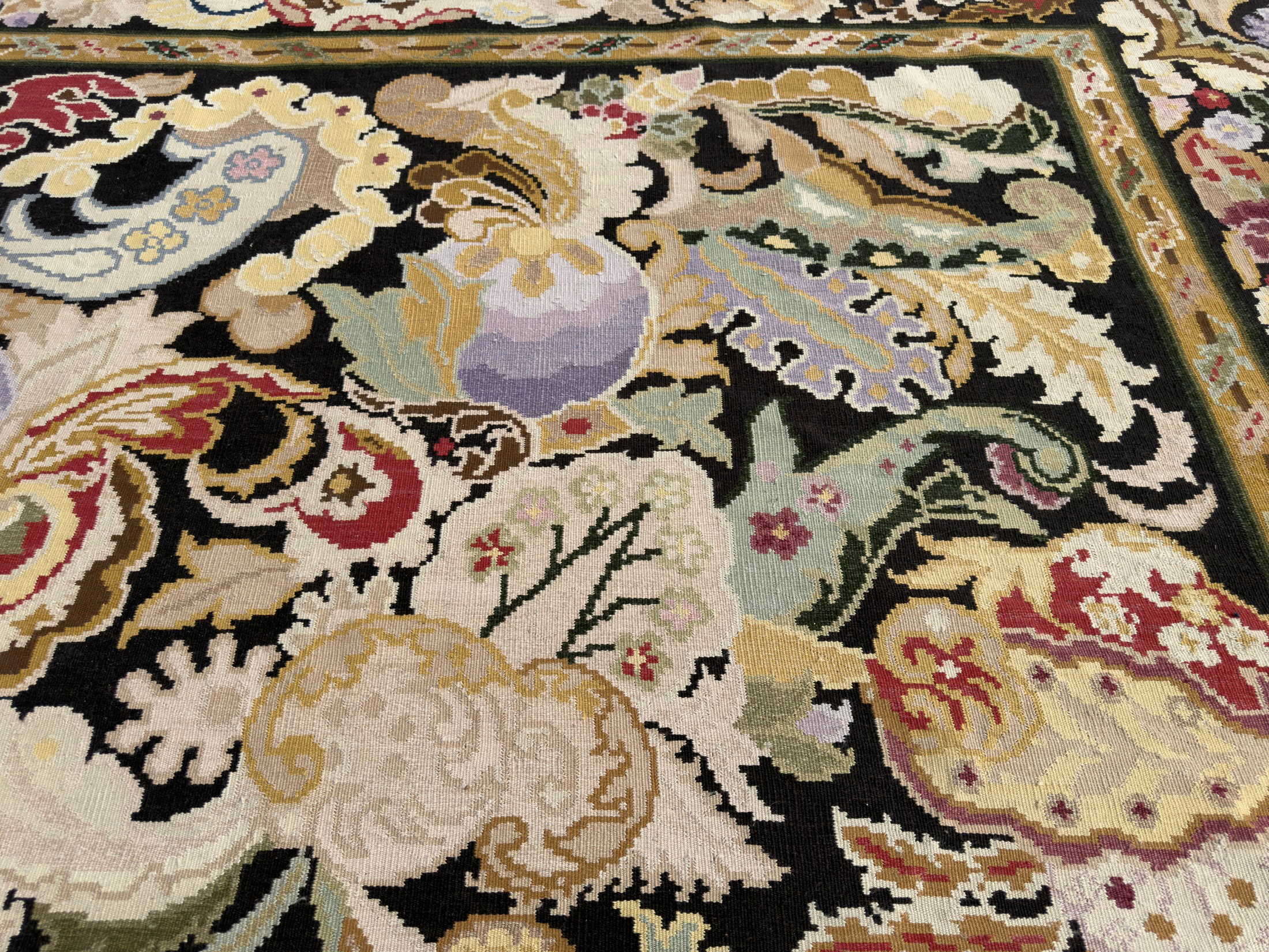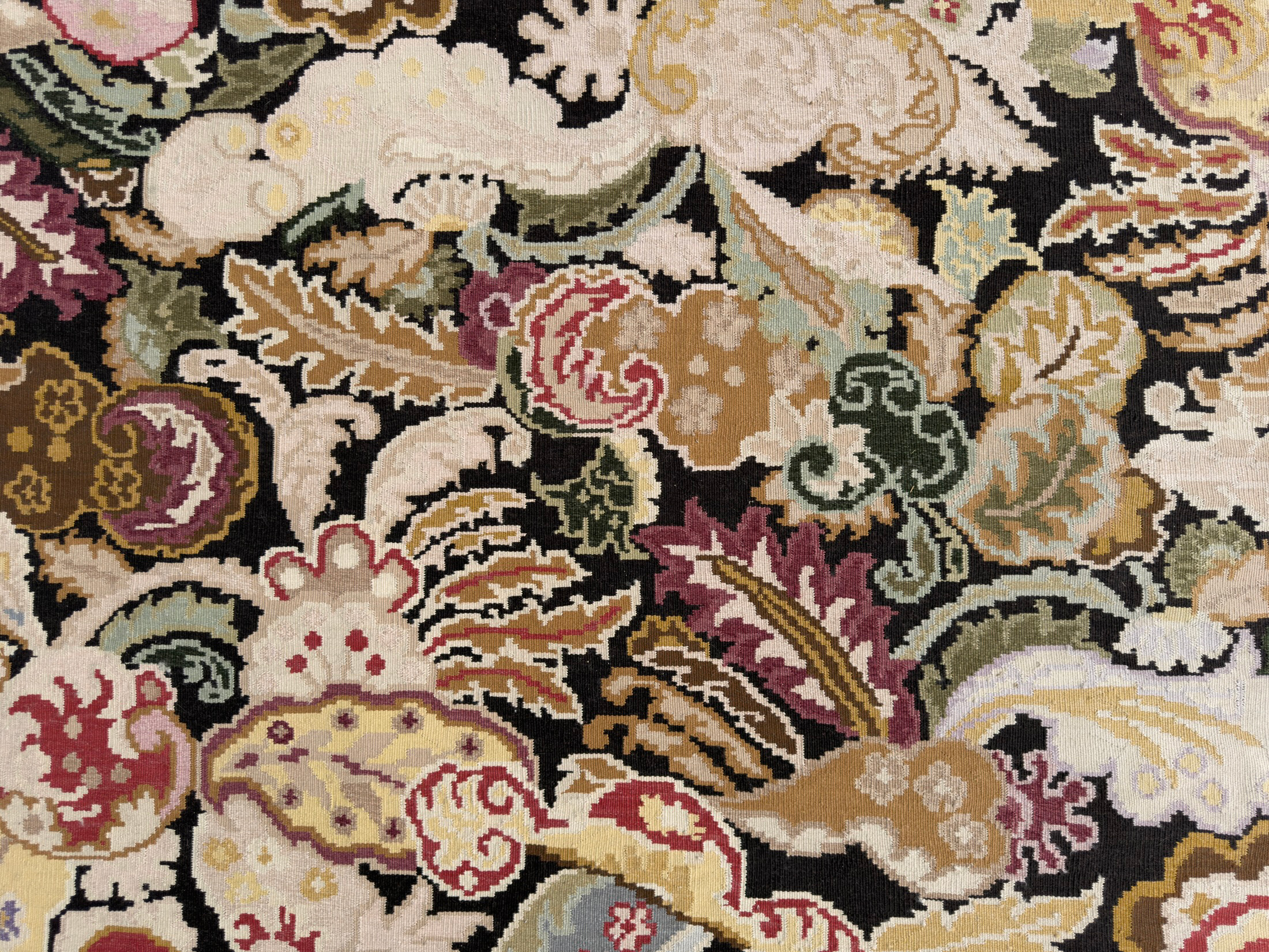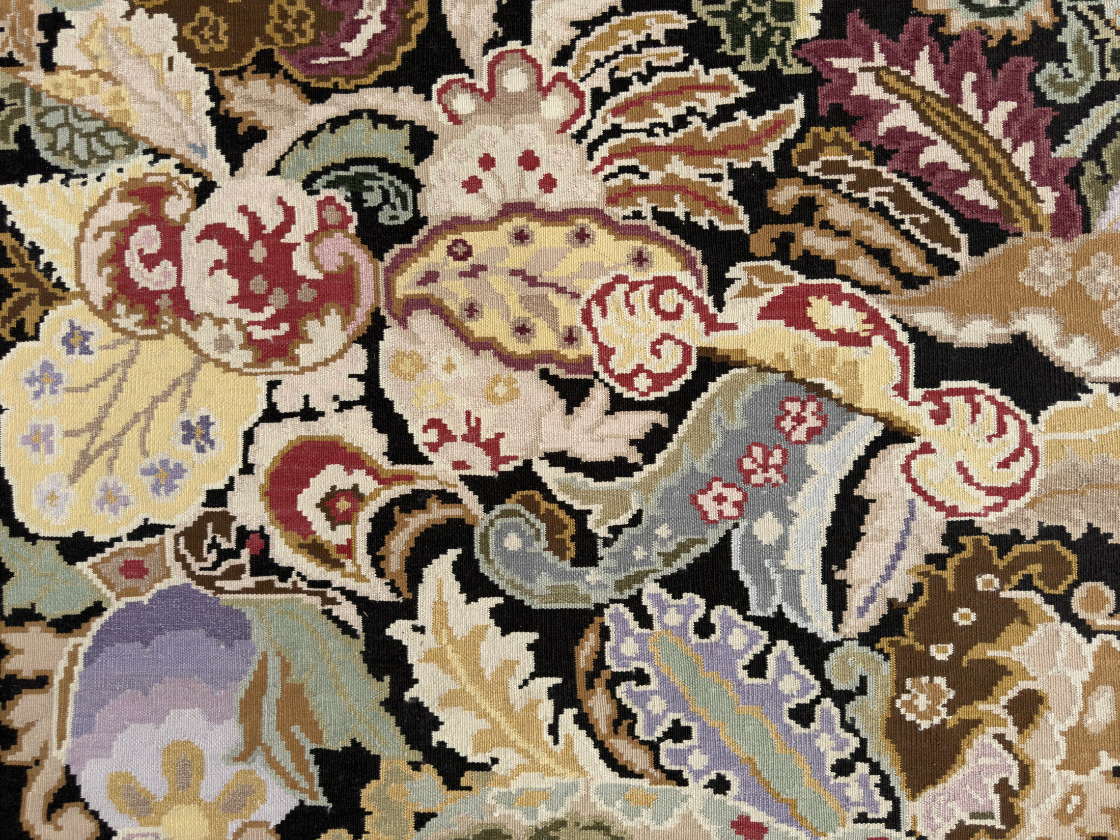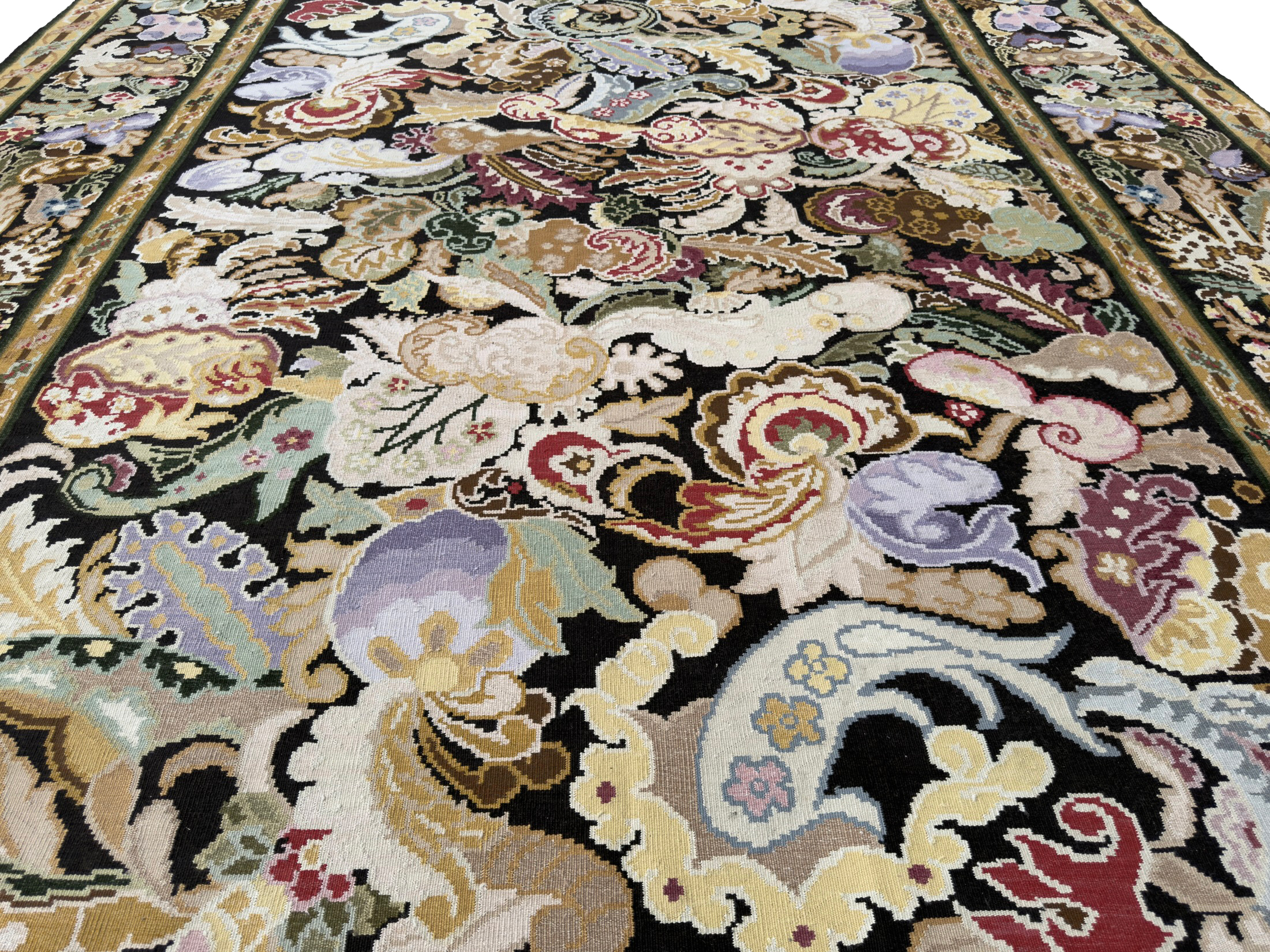 This Bessarabian Kilim is a masterpiece that effortlessly combines traditional motifs and patterns with a unique blend of Eastern and Western modern influences. Its design features floral motifs, over-lapping paisley motifs, bursting leaves, and a fascinating flowing border, all meticulously woven with a harmonious colour palette. The vibrant hues of red, purple, pastels, greens, and gold create a mesmerising visual feast for the eyes, evoking a sense of warmth, elegance, and sophistication. The deep black background used for both main background and border allow the dyes and pattern to create a work of art.