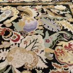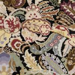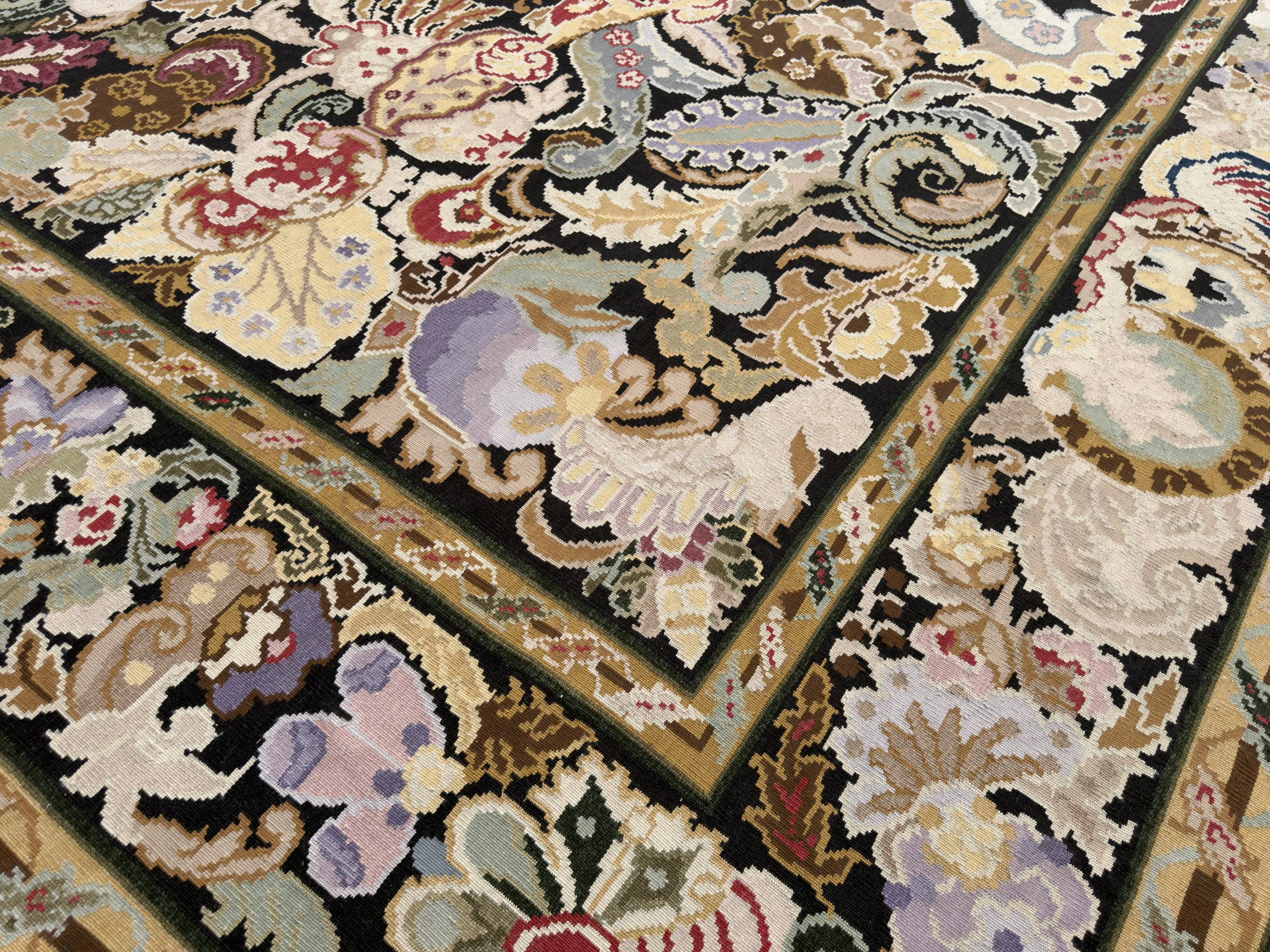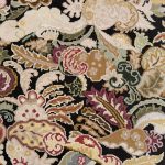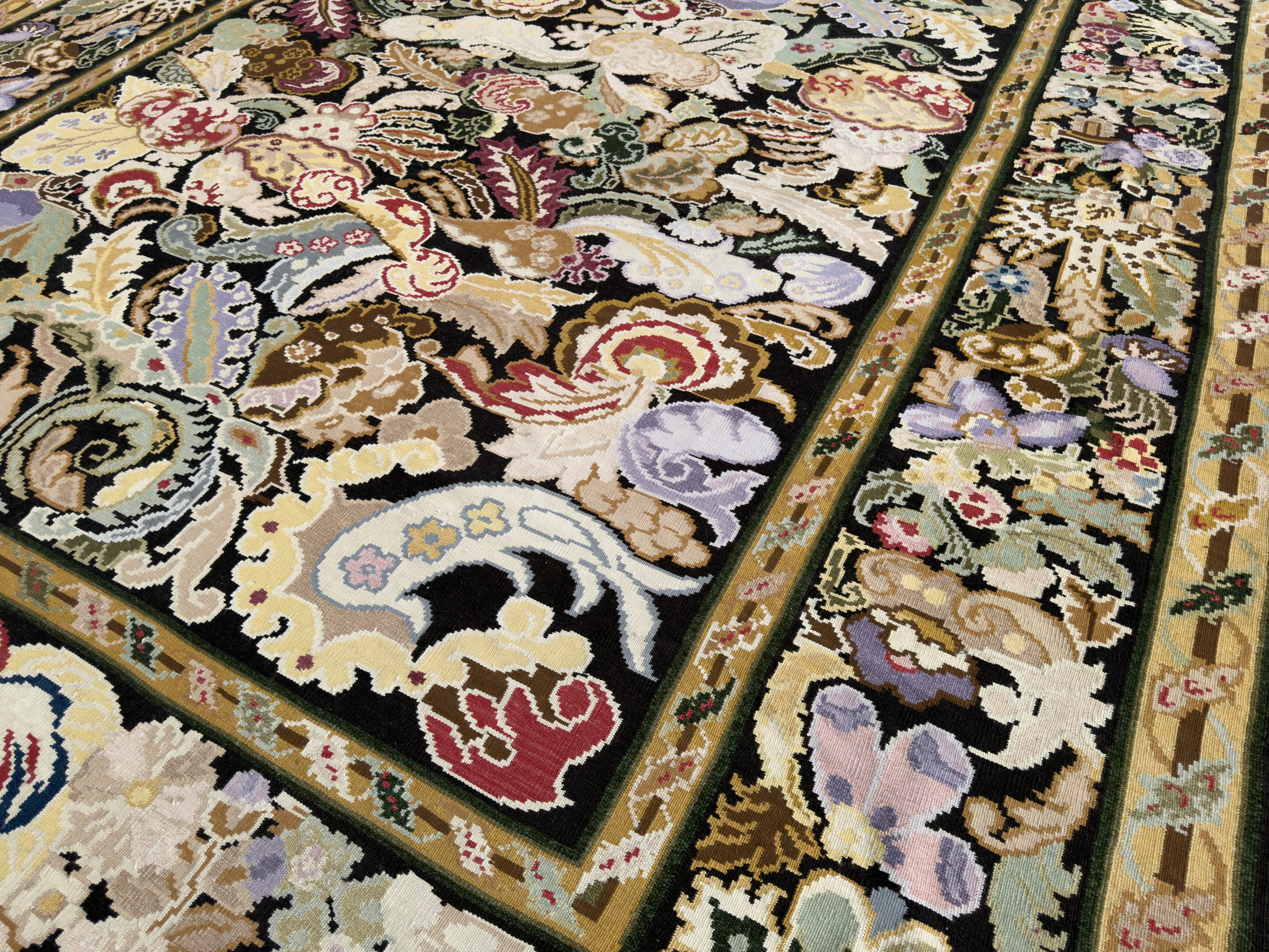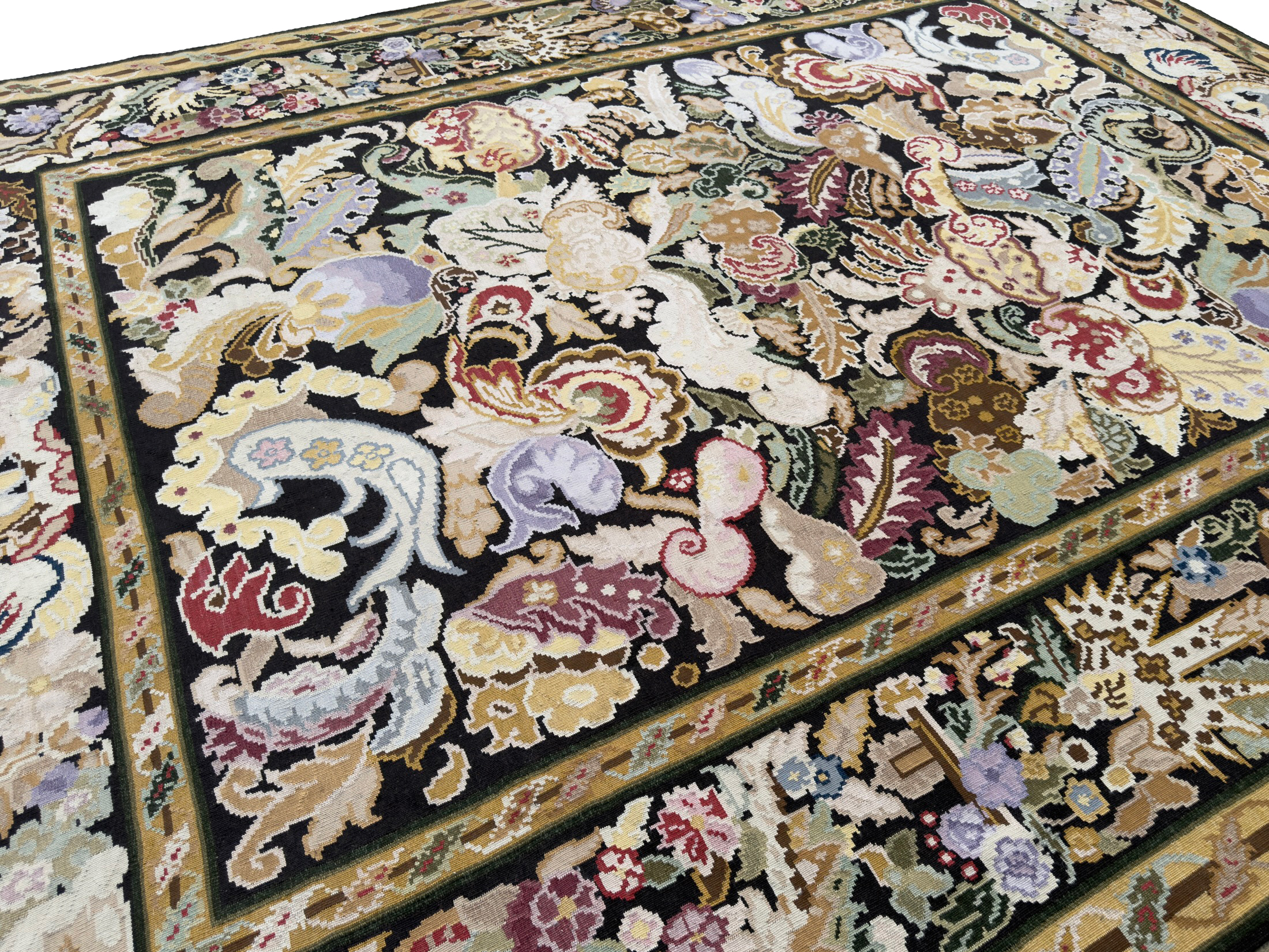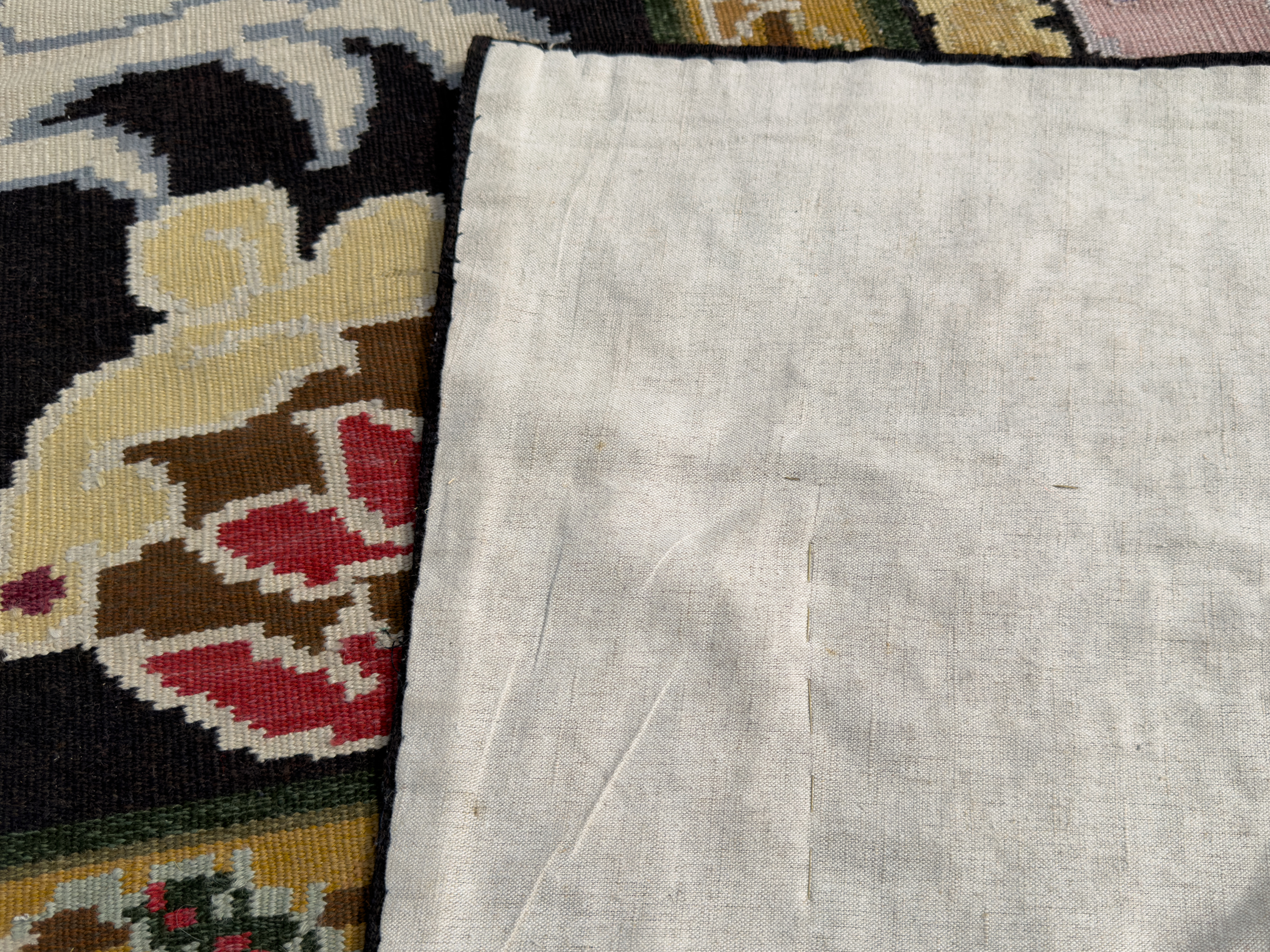This Bessarabian Kilim is a masterpiece that effortlessly combines traditional motifs and patterns with a unique blend of Eastern and Western modern influences. Its design features floral motifs, over-lapping paisley motifs, bursting leaves, and a fascinating flowing border, all meticulously woven with a harmonious colour palette. The vibrant hues of red, purple, pastels, greens, and gold create a mesmerising visual feast for the eyes, evoking a sense of warmth, elegance, and sophistication. The deep black background used for both main background and border allow the dyes and pattern to create a work of art.