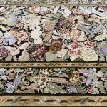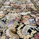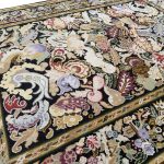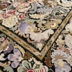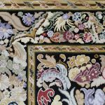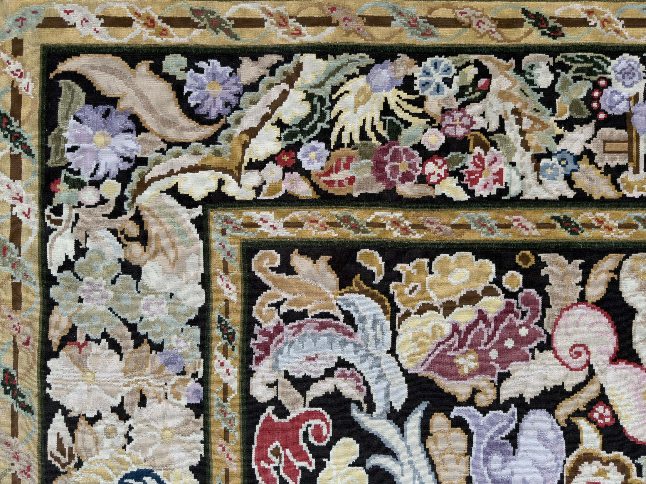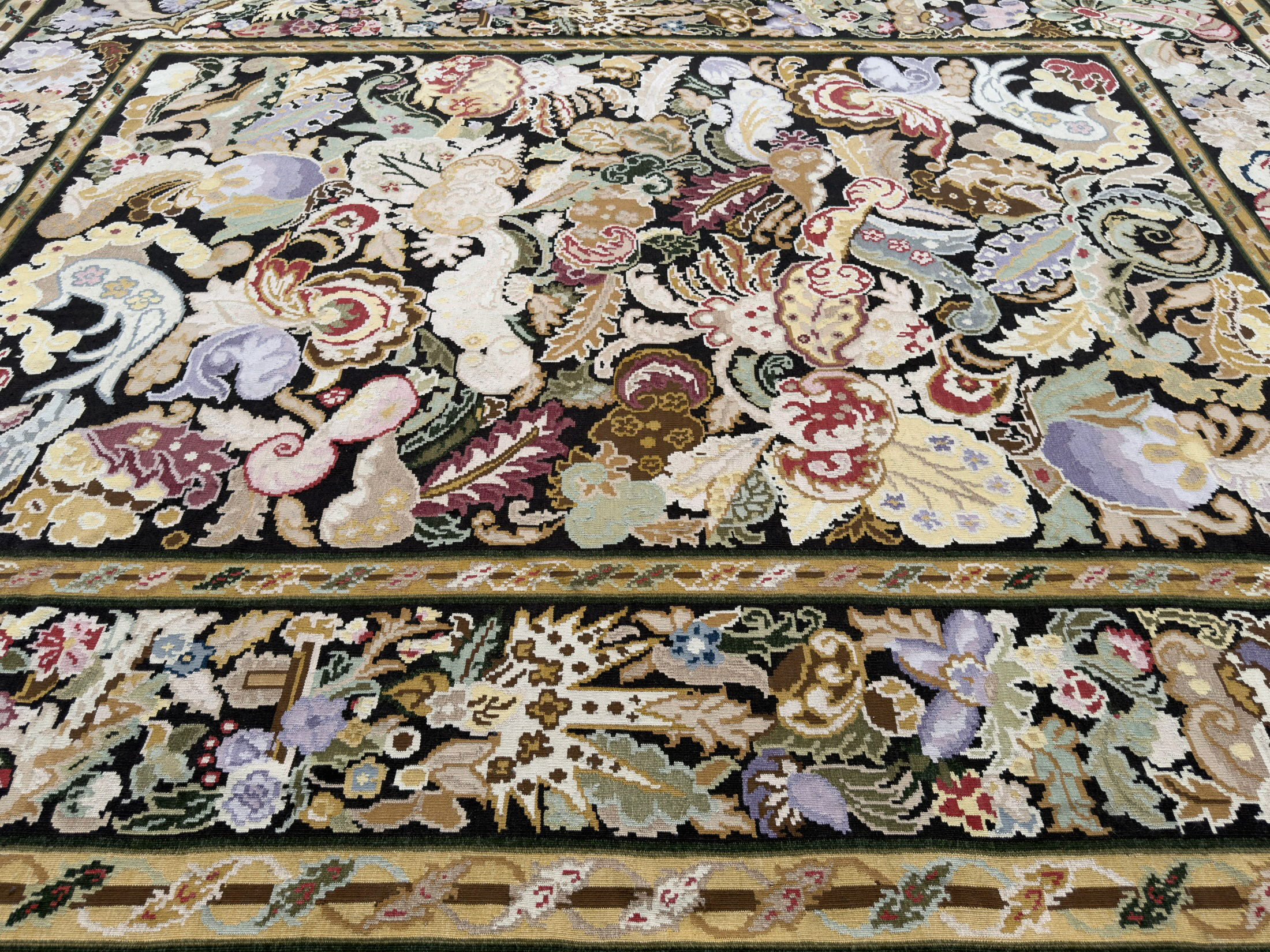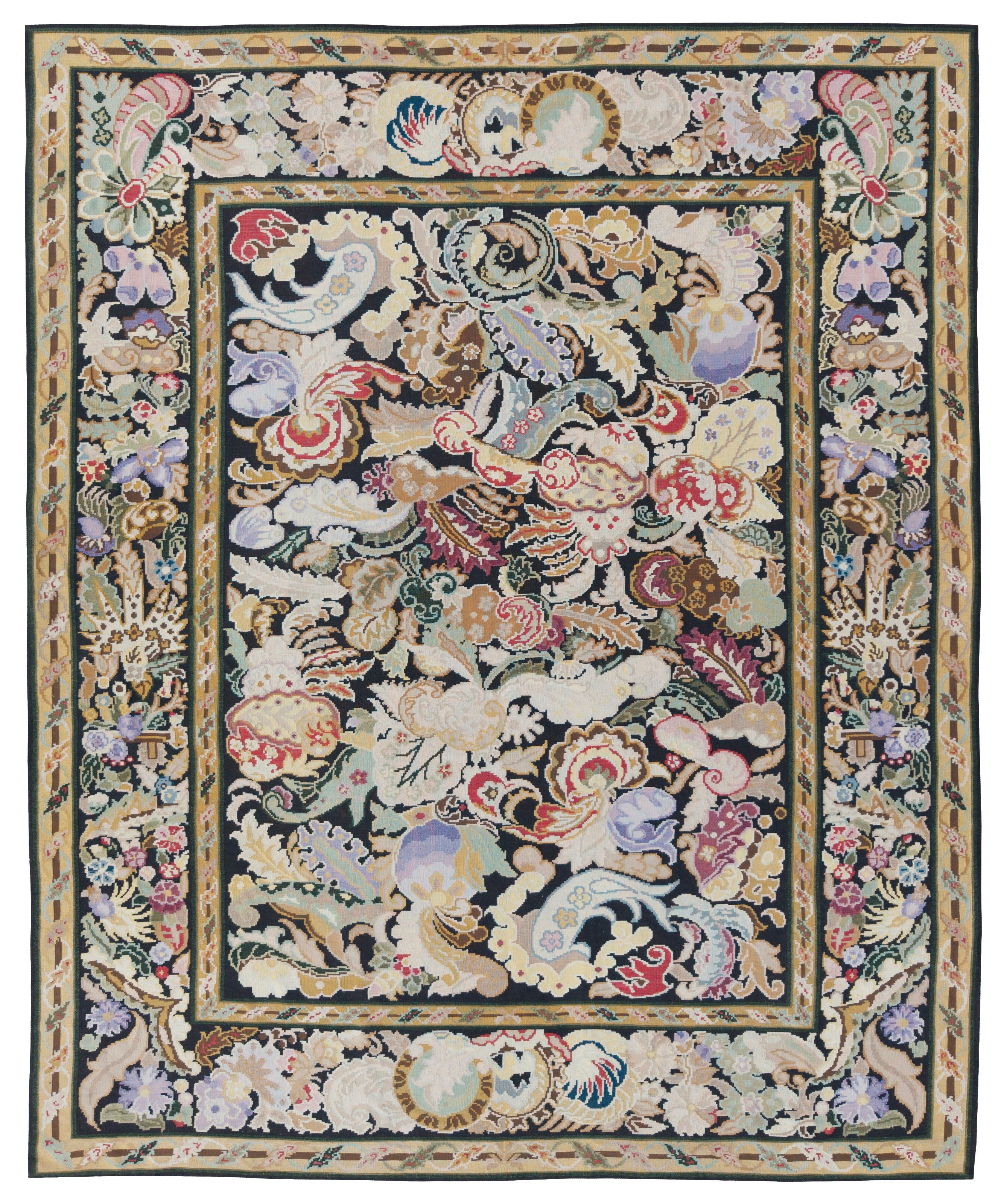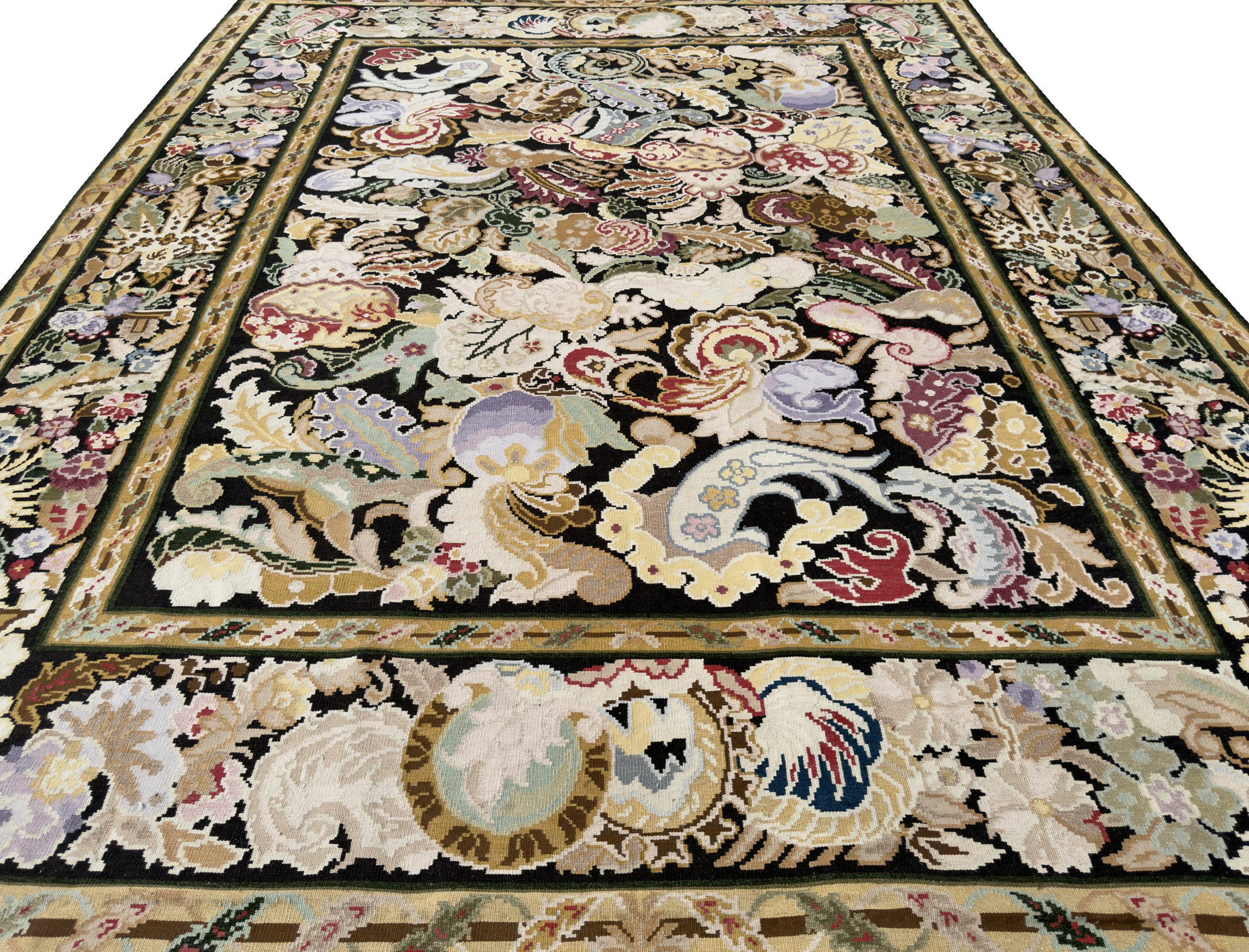 This Bessarabian Kilim is a masterpiece that effortlessly combines traditional motifs and patterns with a unique blend of Eastern and Western modern influences. Its design features floral motifs, over-lapping paisley motifs, bursting leaves, and a fascinating flowing border, all meticulously woven with a harmonious colour palette. The vibrant hues of red, purple, pastels, greens, and gold create a mesmerising visual feast for the eyes, evoking a sense of warmth, elegance, and sophistication. The deep black background used for both main background and border allow the dyes and pattern to create a work of art.