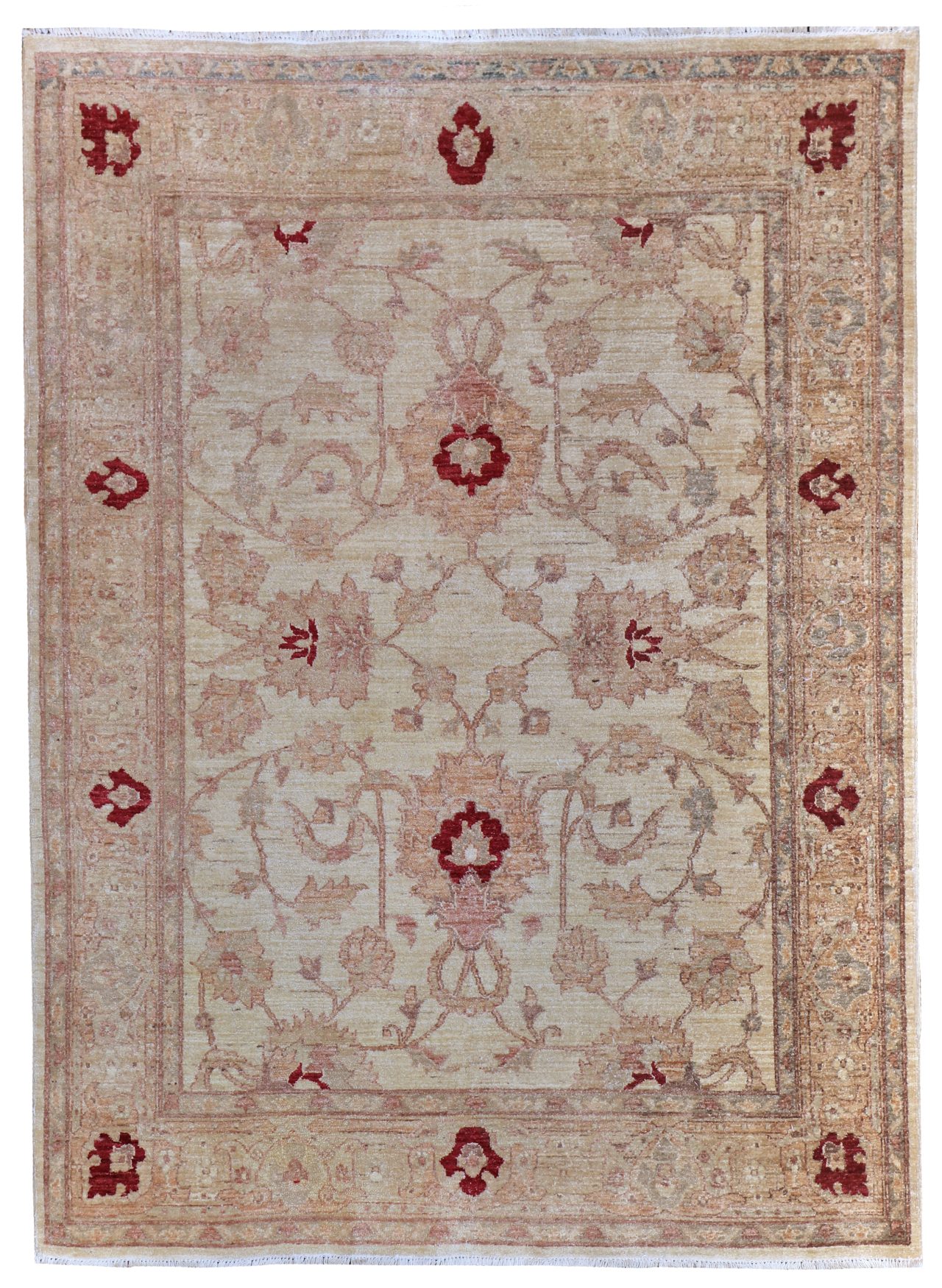 A soft golden yellow border and light main background on this contemporary Agra rug hand-woven with soft wool and natural dyes. The design of large scale floral palmettes with connecting vines using pale greens and red tones. Woven using all hand-spun wool and vegetable dyes a very attractive rug. We supply anti-slip underlay with all our carpets and rugs included in the price, this helps them look great and stay safe on the floor.