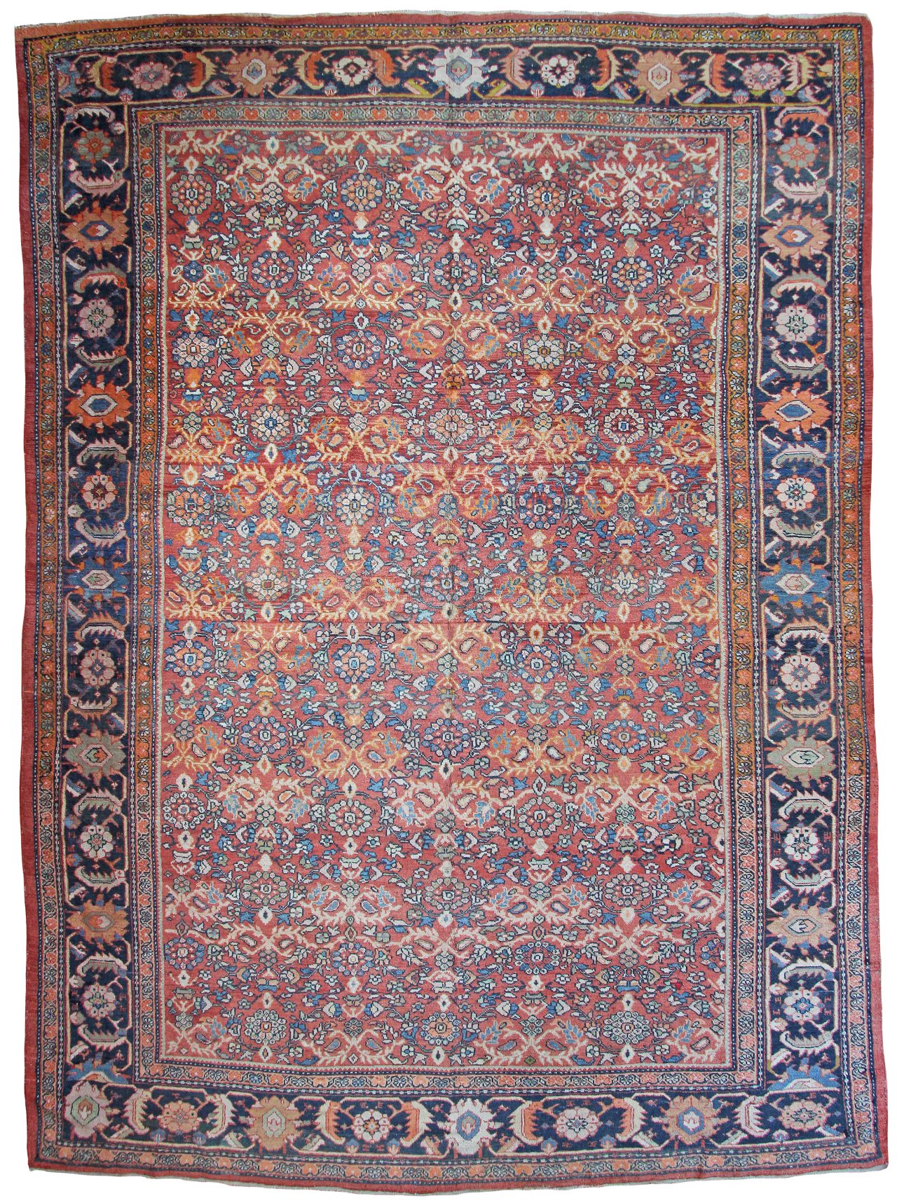 Mahal carpets were produced in Sultanabad, Persia which is now Arak in the center of Iran. Mahal and Sultanabad rugs were made in the same area as the earliest Fereghans and Sarouks, but they are very different in form and structure. Floral motifs and overall designs of vine scrolls and palmettes remain consistent with the influences of western color palettes and are all characteristics of Ziegler carpets. Neighbours to Heriz carpets there designs are very different as Heriz tend to be quite angular and geometric whereas Mahal carpets are generally more open in design and curvilinear.