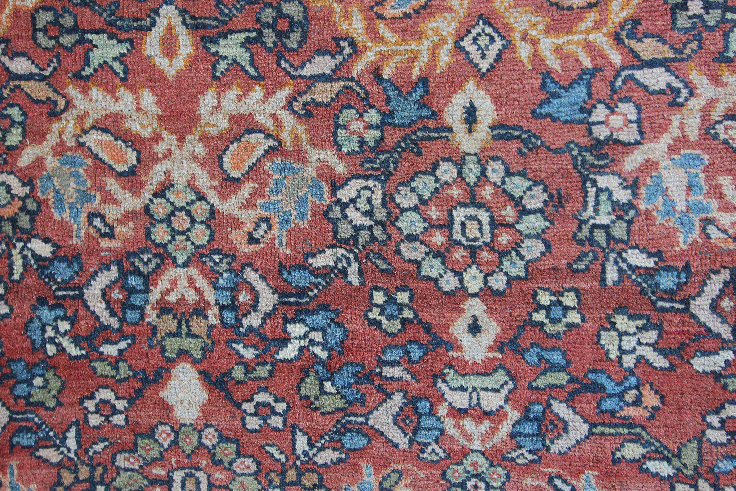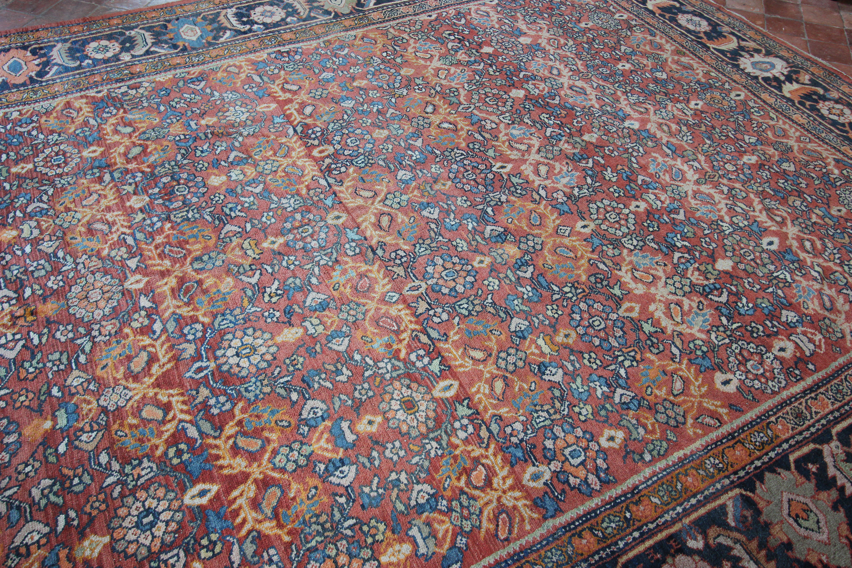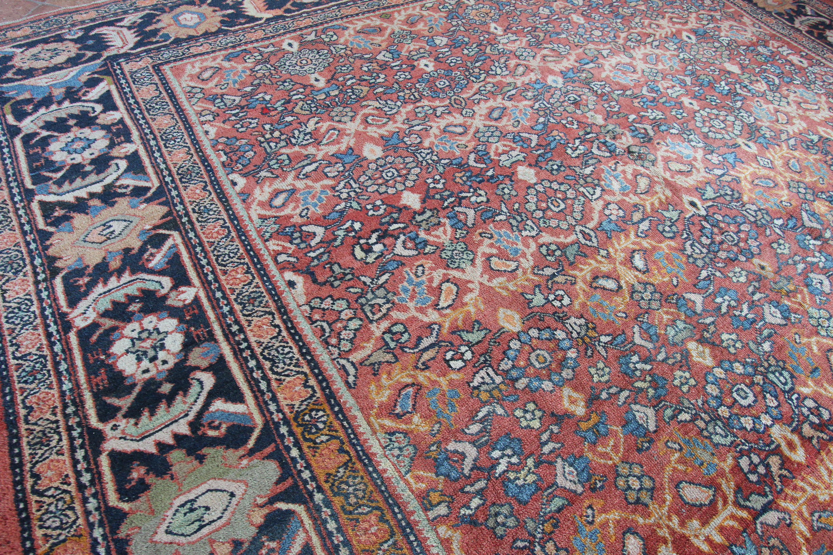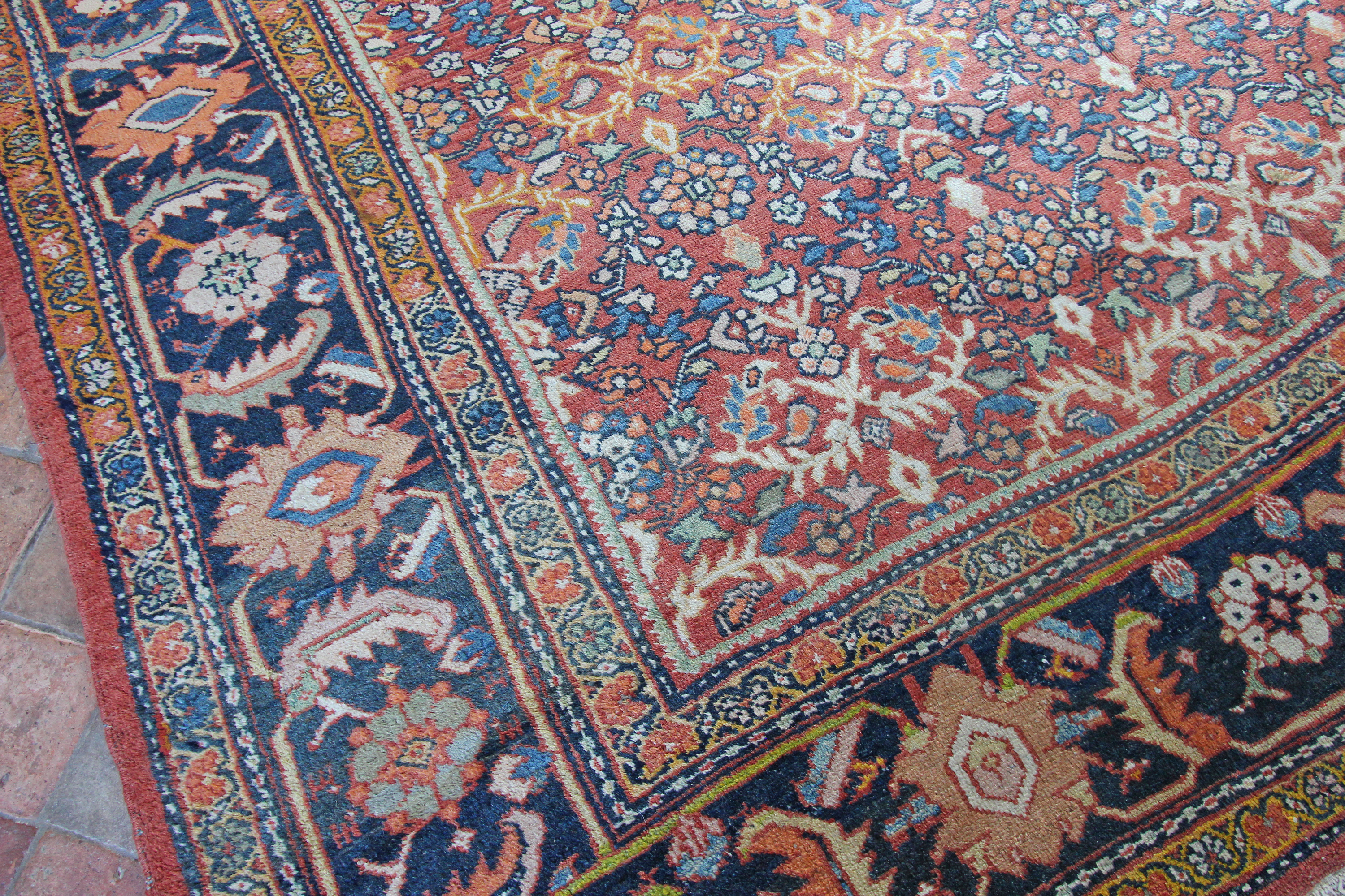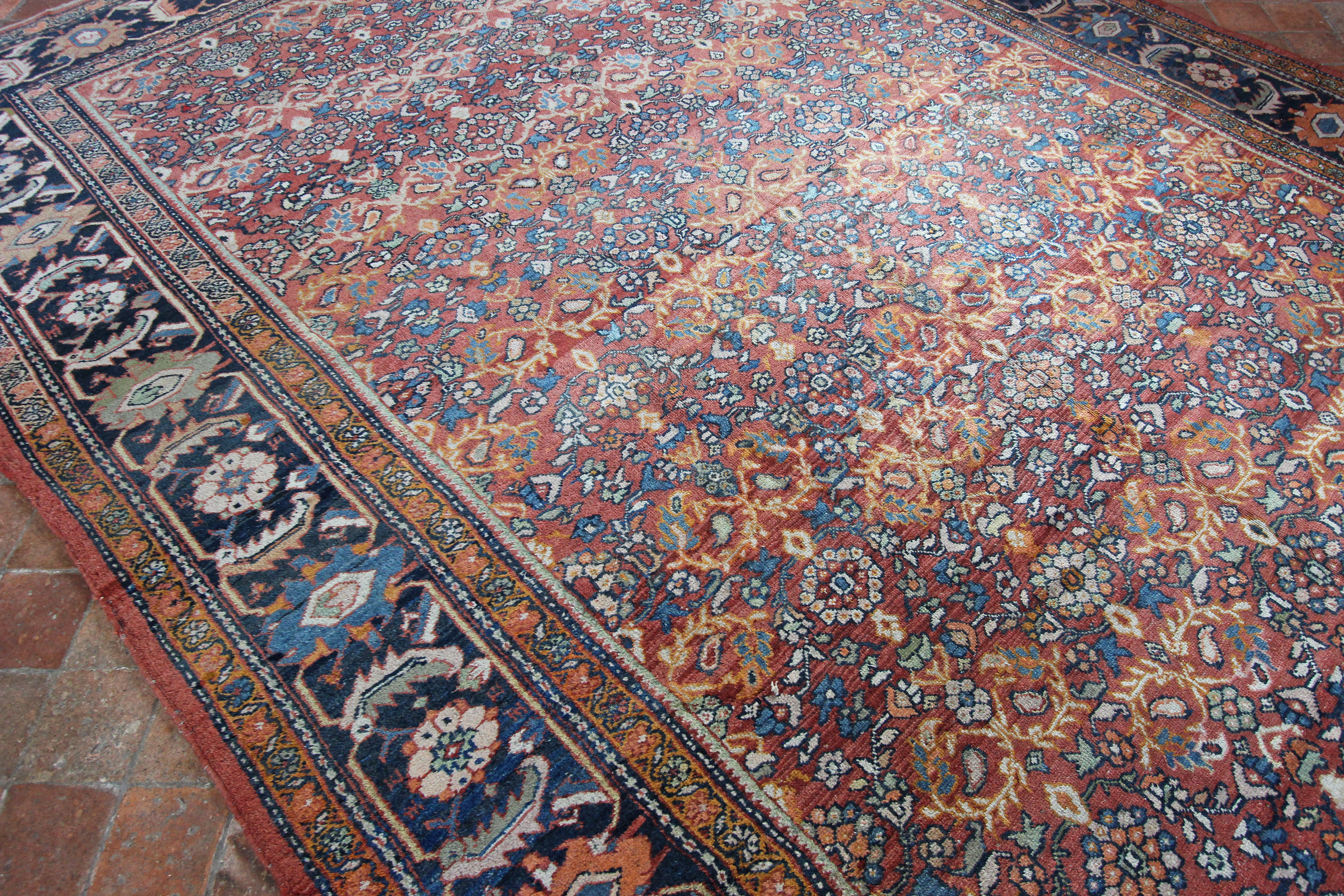 The condition is extremely good for a 100 year old carpet with no major wear or damage, Mahal carpets use soft wool and are generally very durable. The fringes are original too. Please request a home visit to select a convenient day and time for you to view this antique Mahal carpet at home. We love to travel all over the UK showing carpets in situ, helping you choose the right carpet for your home.