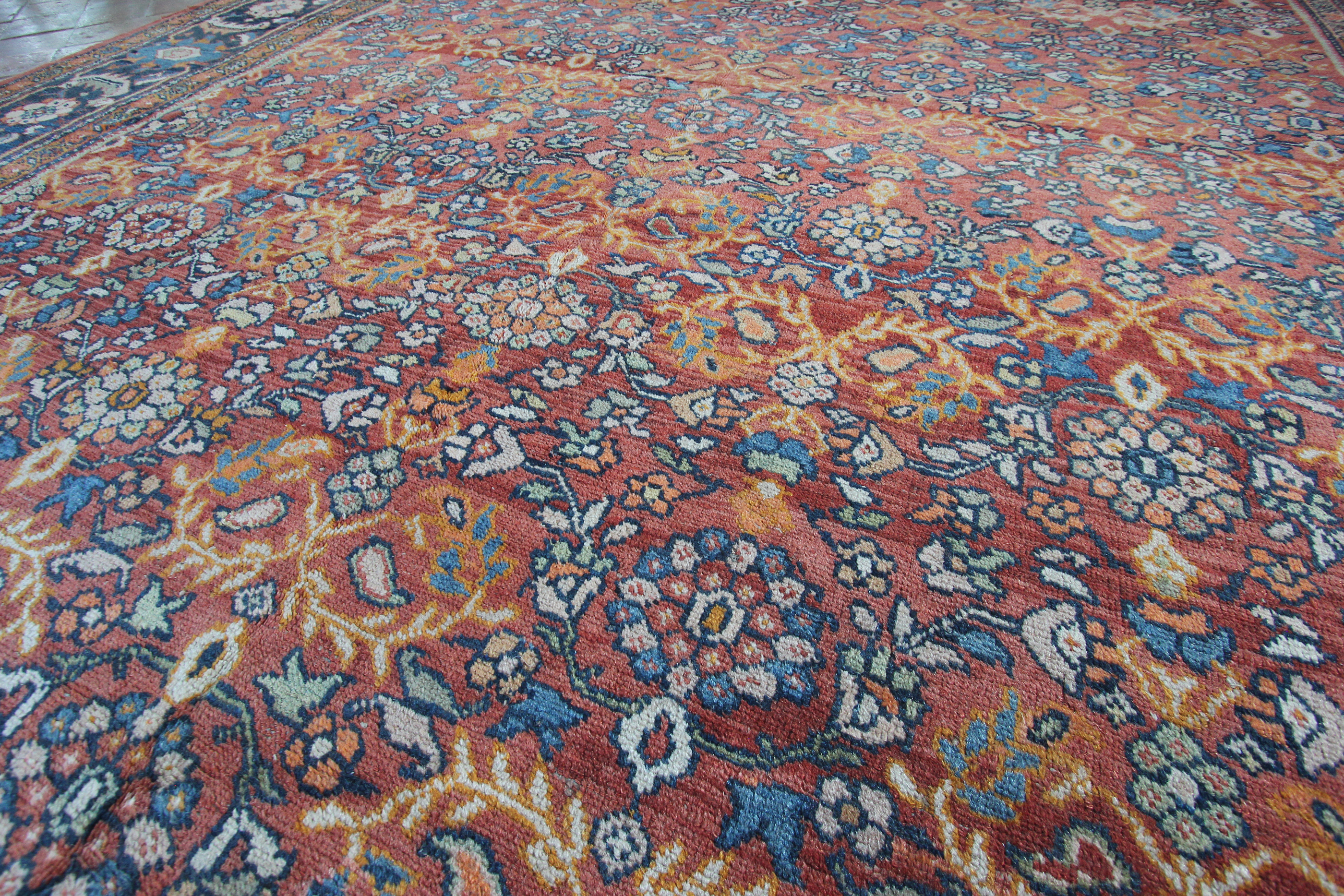 A warm, colourful all over design antique Mahal carpet in really good condition all over woven around 1910. A deep blue indigo dye border design and soft greens and pale blues in the floral motifs. The all over design consists of flowing vine work in-between flowers and leaves. Some burnt orange dyes are used too. Wonderful design and colours to place in a room, please view all the photographs to see the colours close up.