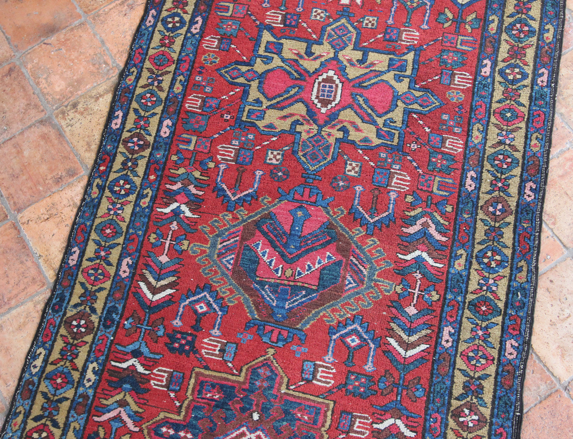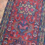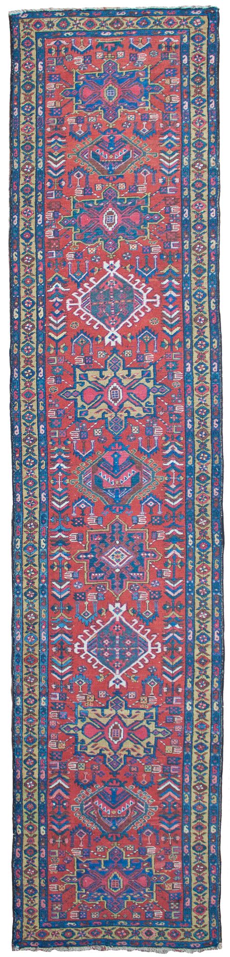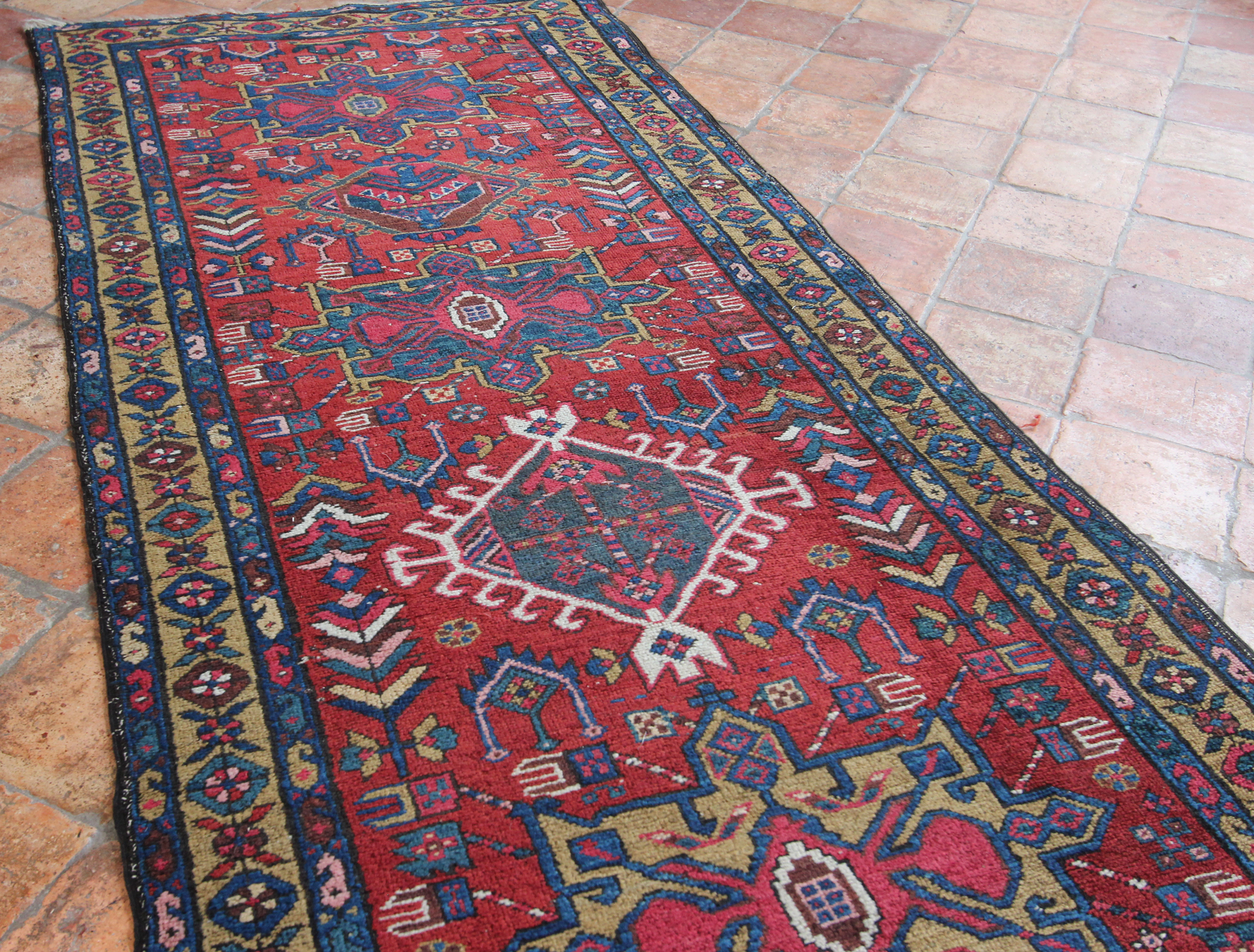 This Heriz runner is a rich and warm red coloured antique runner in very good condition. The condition is excellent, and this runner dates from the early 20th century, circa 1910-1920 with very good wool pile throughout and complete ends and selvedges. This runner is wonderful in it’s design and was woven with a wonderful variety of colours, terracotta/red tones, blues, green and yellows. The design of this Heriz runner is typical of runners from this region, with a repeating eight-star medallion, linked together with the pale blue vine.