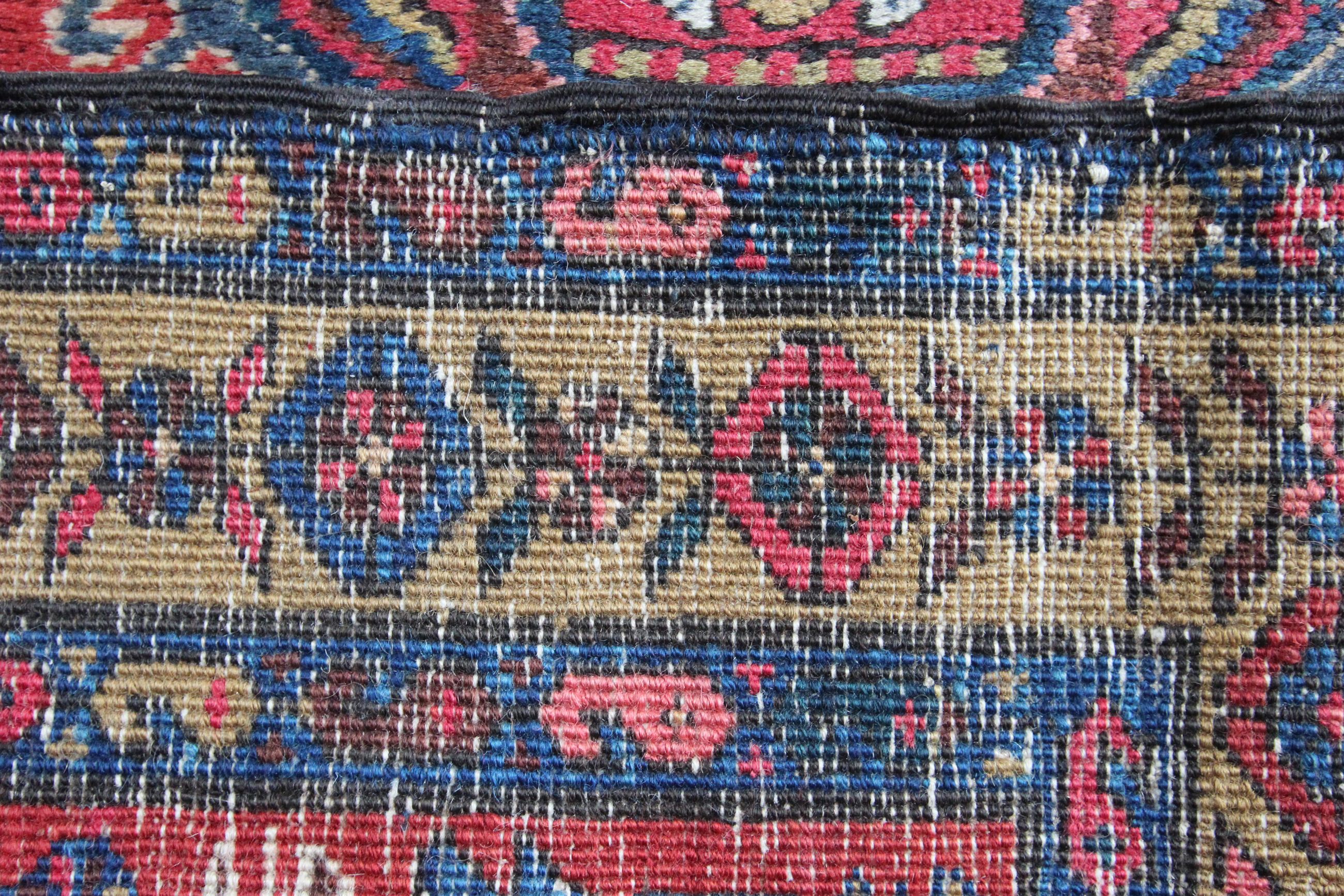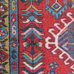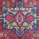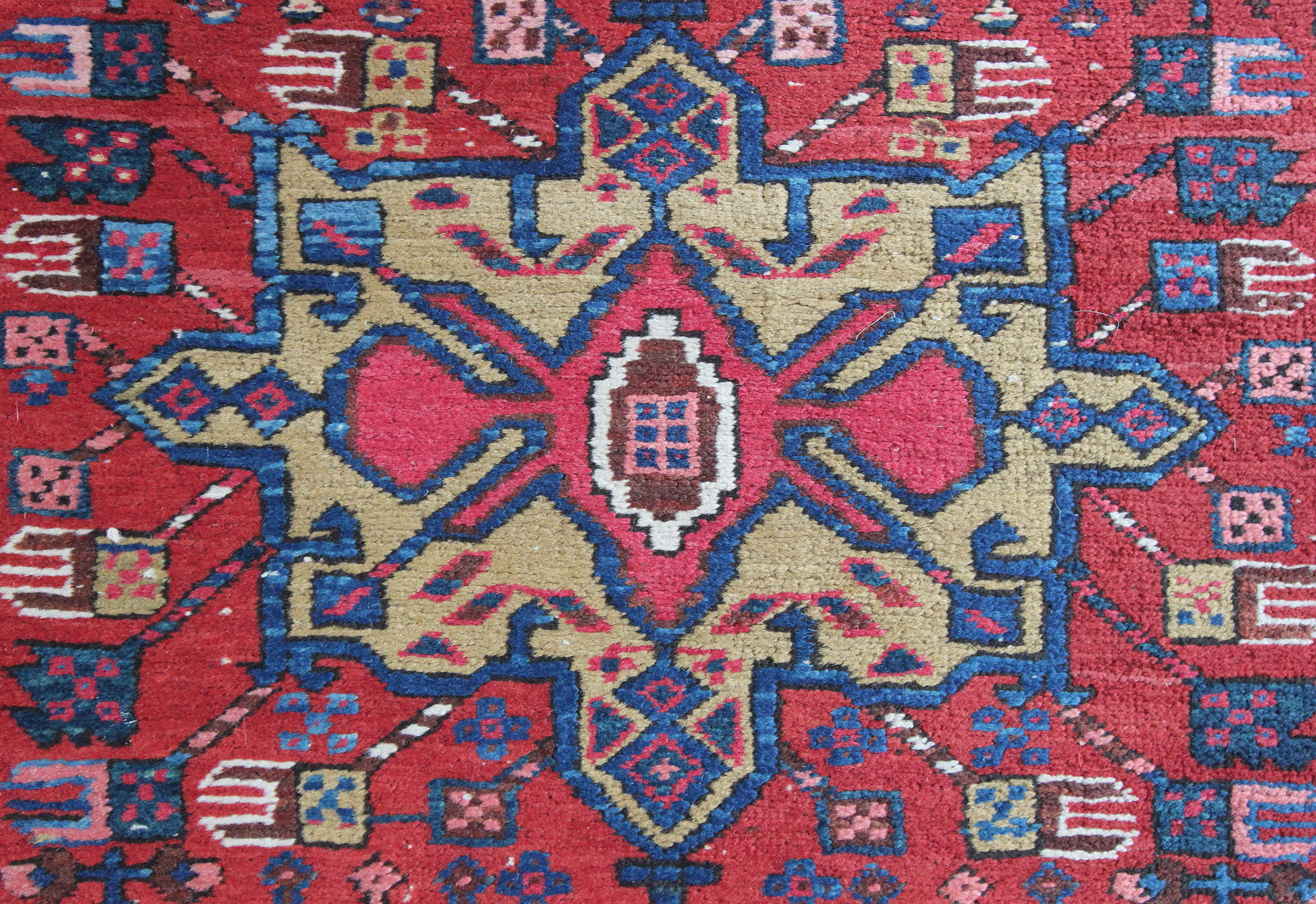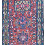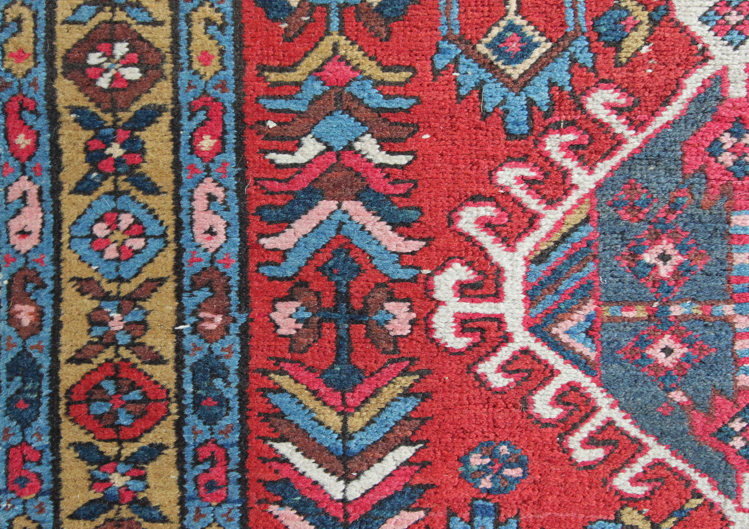 This Heriz runner is a rich and warm red coloured antique runner in very good condition. The condition is excellent, and this runner dates from the early 20th century, circa 1910-1920 with very good wool pile throughout and complete ends and selvedges. This runner is wonderful in it’s design and was woven with a wonderful variety of colours, terracotta/red tones, blues, green and yellows. The design of this Heriz runner is typical of runners from this region, with a repeating eight-star medallion, linked together with the pale blue vine.