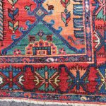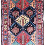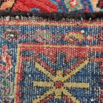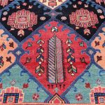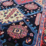 Baktiari, which is west of Isfahan, is a region where rugs used a similar medallion format to those of Isfahan rugs. This is where the similarity ends, as this village rug is coarsely woven on a wool foundation whereas Isfahan rugs are finer and woven using a cotton foundation. The colours on this rug really stand out on the black main field, which makes for a marvelous nomadic rug.