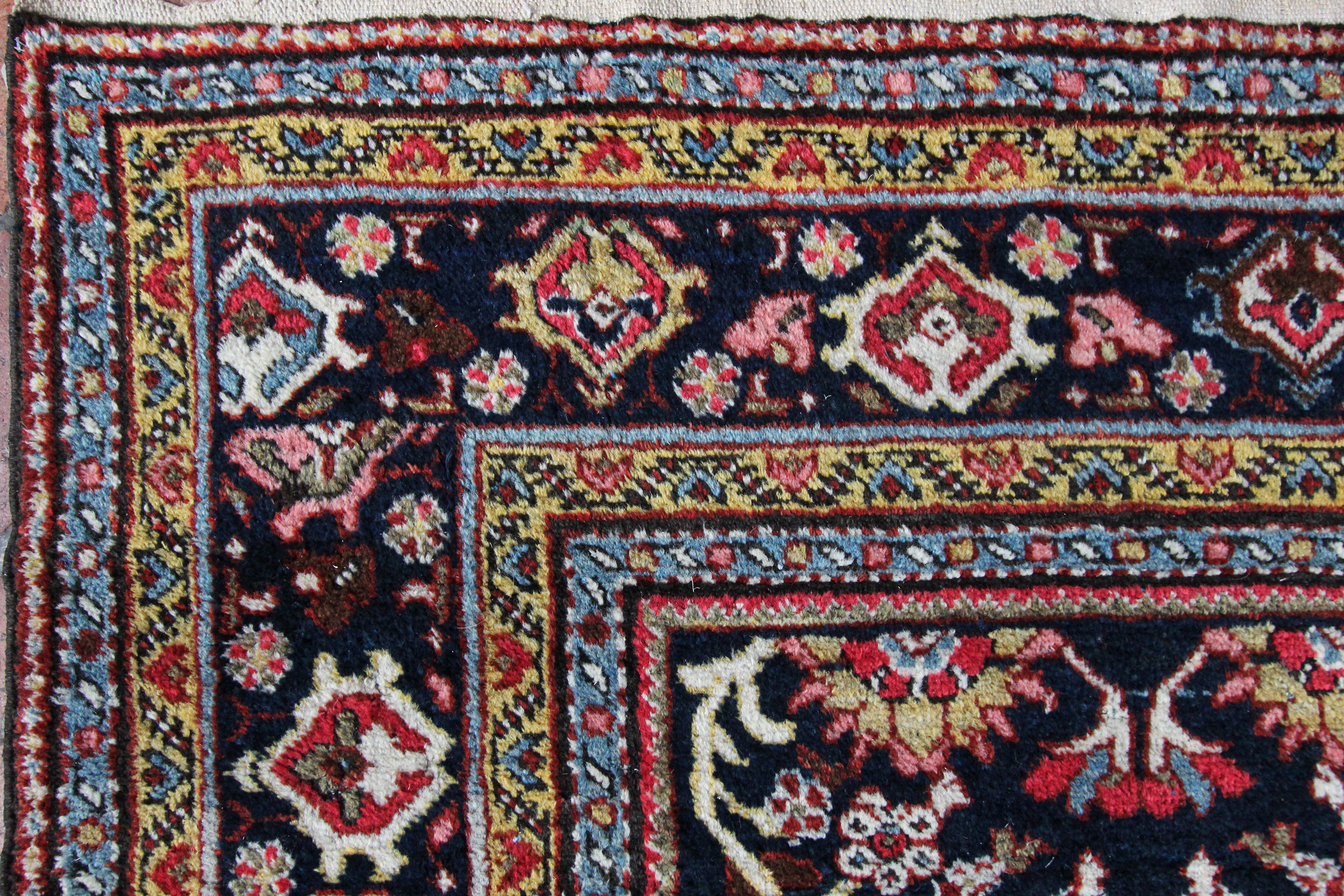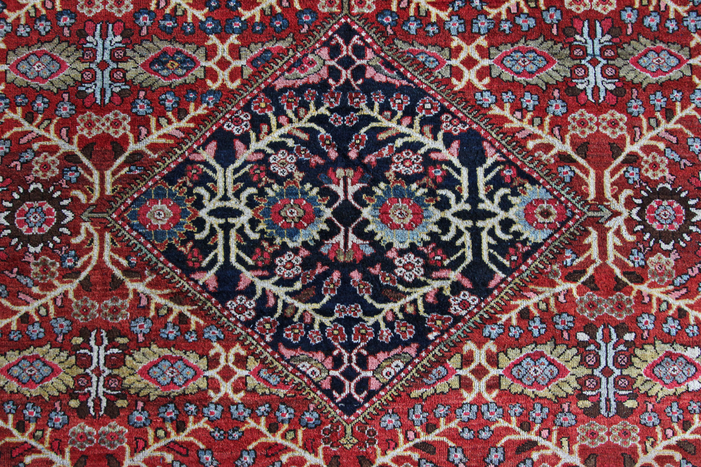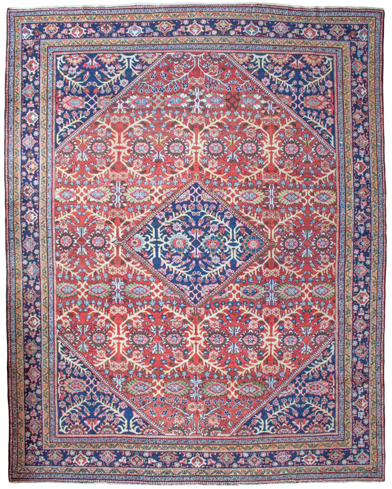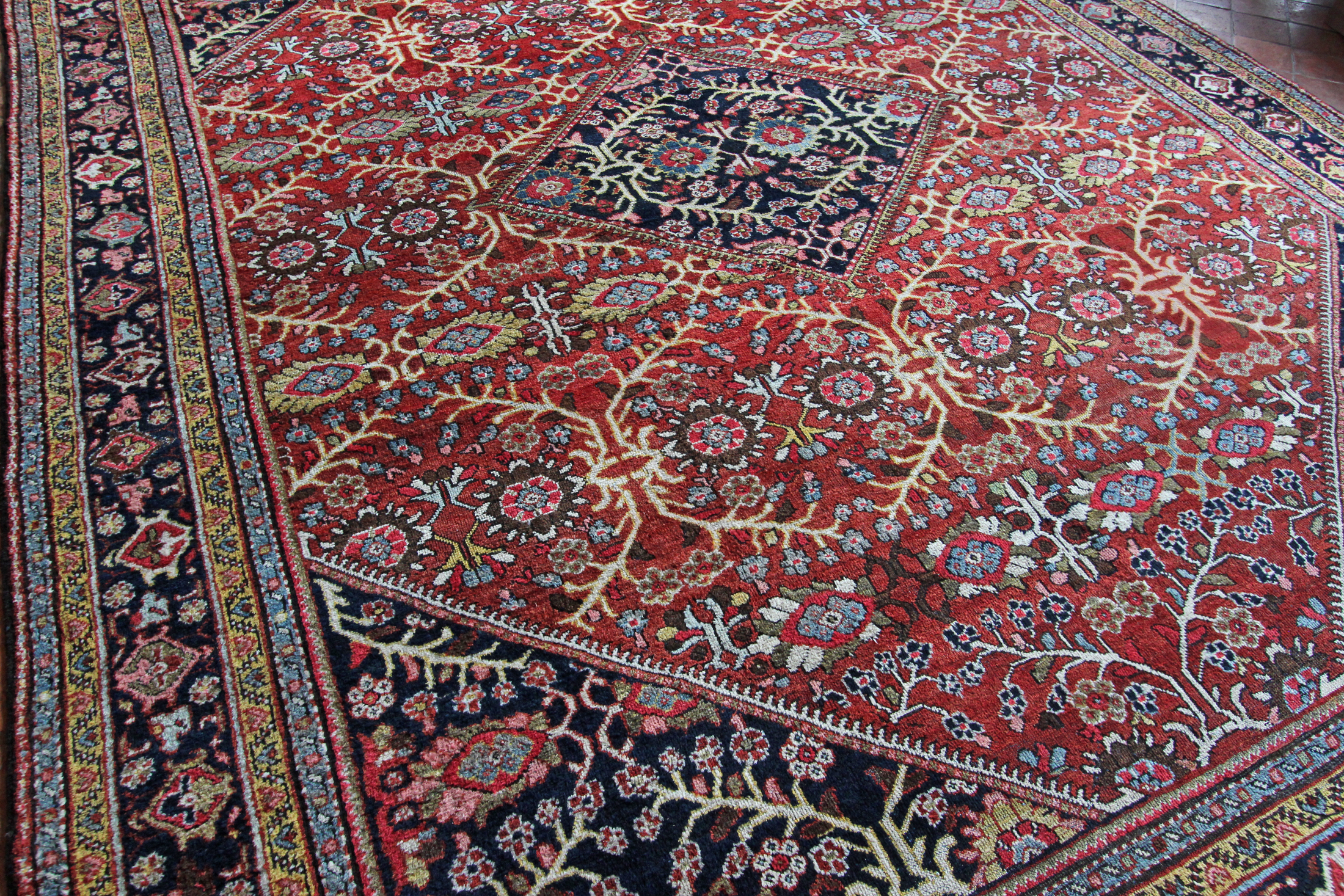 Mahal carpets were produced in Sultanabad, Persia which is now Arak in the center of Iran. Mahal and Sultanabad rugs were made in the same area as the earliest Fereghans and Sarouks, but they are very different in form and structure. Floral motifs and overall designs of vine scrolls and palmettes remain consistent with the influences of western color palettes and are all characteristics of Ziegler carpets. Neighbours to Heriz carpets there designs are very different as Heriz tend to be quite angular and geometric whereas Mahal carpets are generally more open in design and curvilinear.