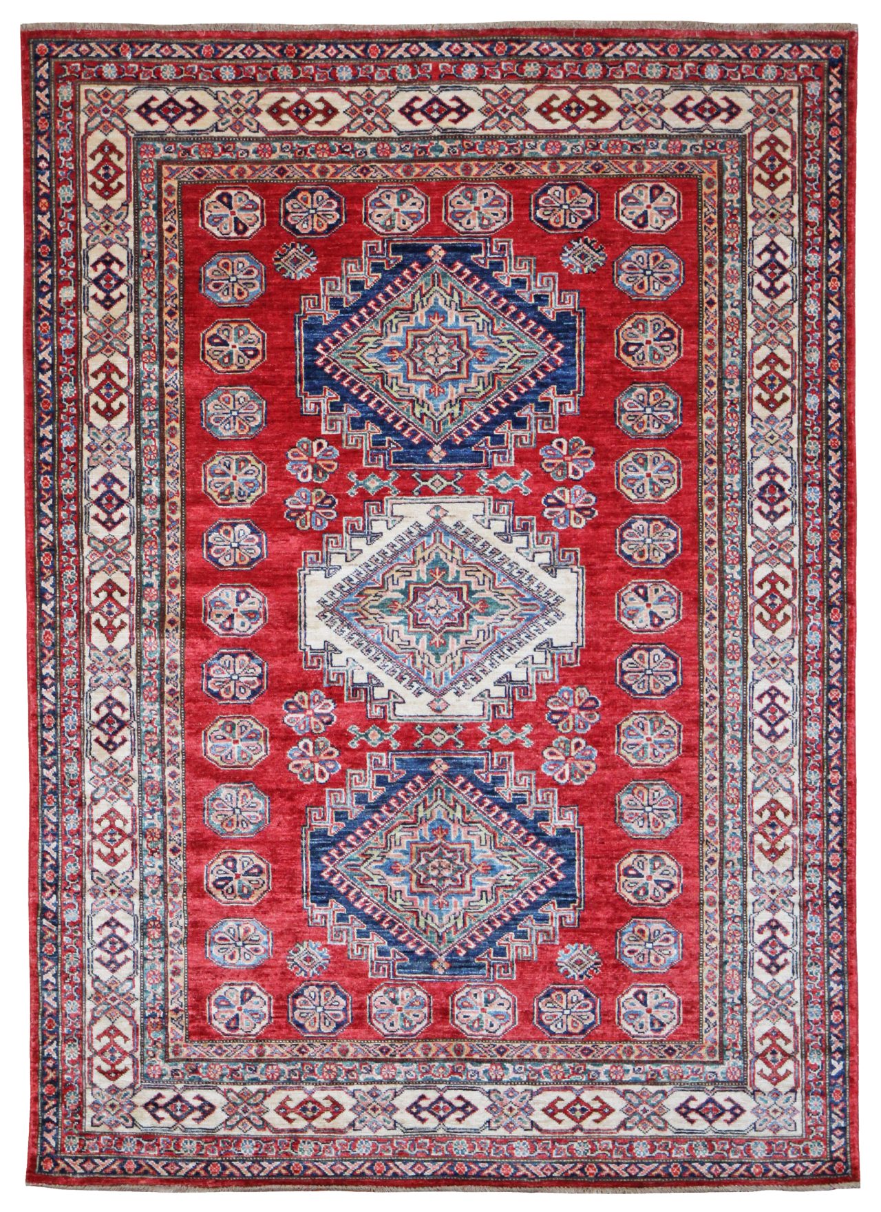 A beautiful hand-woven modern Afghan rug, using natural dyes and an amazing antique Caucasian Kazak design. Great vibrant colours, using rich reds, deep indigo blues, greens and ivory tones. Ideal to brighten up a room and with our excellent rug underlay which is included it will stay secure to the floor.