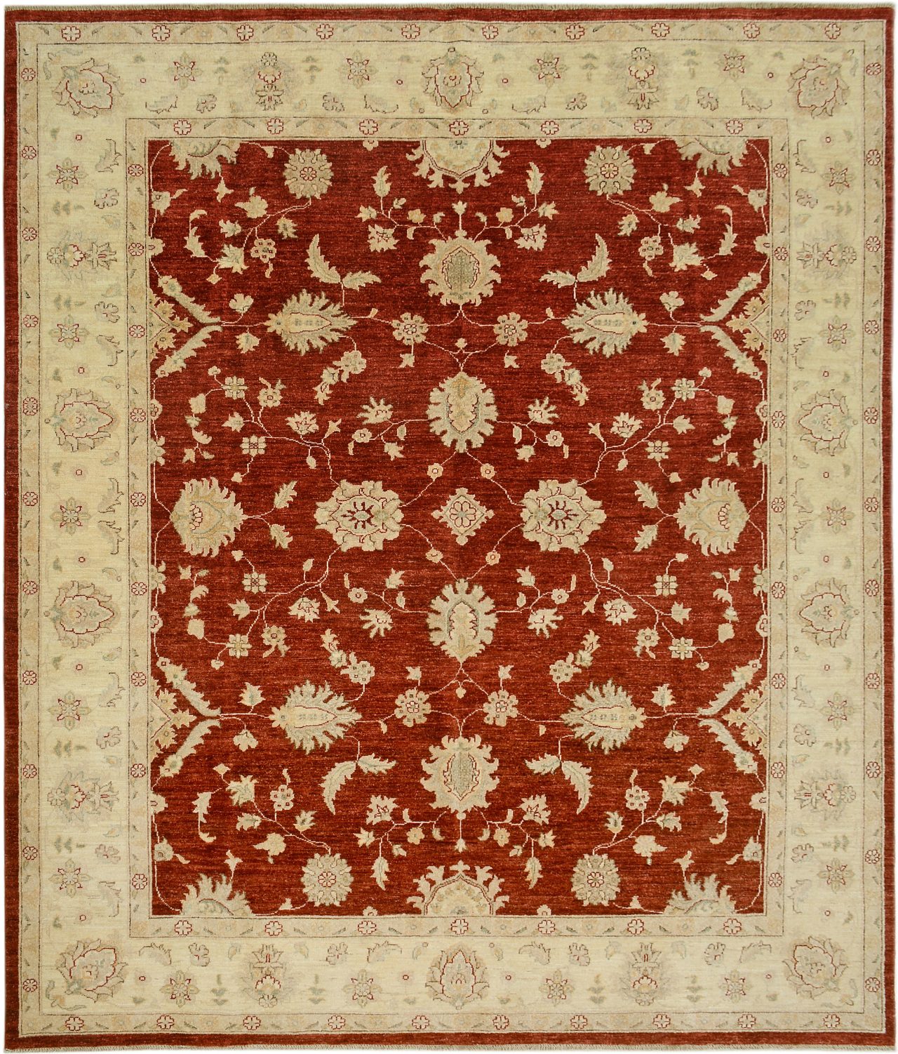 A Ziegler carpet hand-woven in India with subtle muted natural dyes to produce pale colours, this carpet uses a warm red background. A brand new contemporary carpet which we weave for todays modern interiors which often require softer colours that are easy to live with. We have a vast stock of competitively priced modern carpets woven with traditional floral designs such as Ziegler and Agra as well as more contemporary rugs which can have little or no pattern.