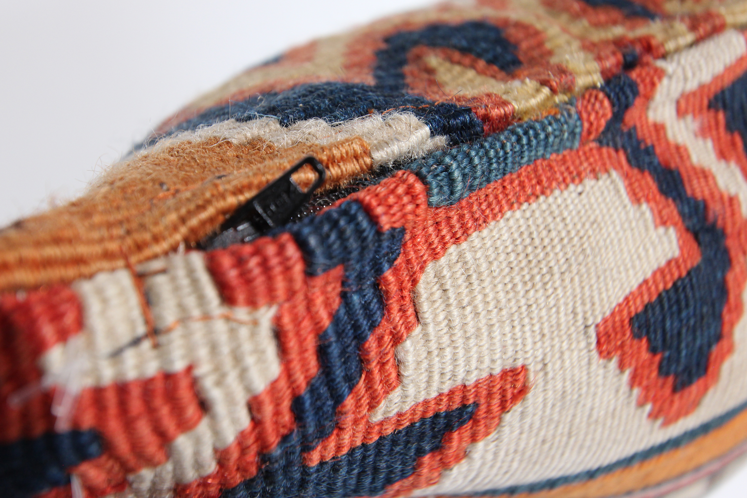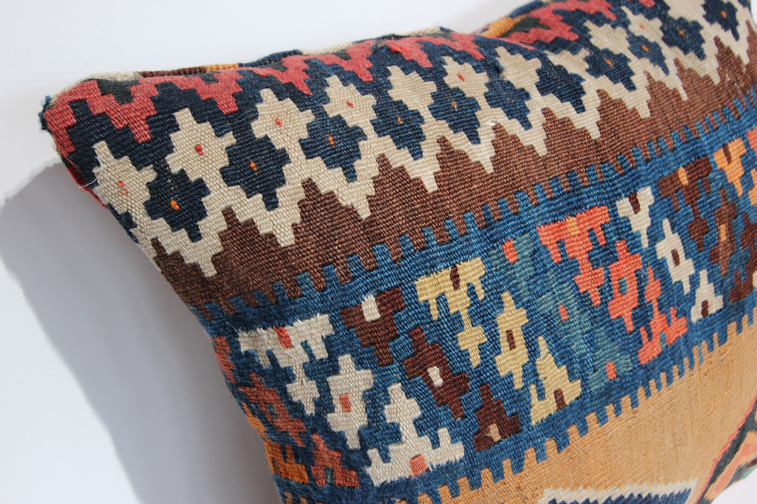 A wonderful antique Kilim cushion, double sided with this lovely geometric design. Great old natural antique colours and beautifully hand-stitched and filled with a feather cushion insert. All of our antique cushions have been hand-stitched using the best materials and inserts.