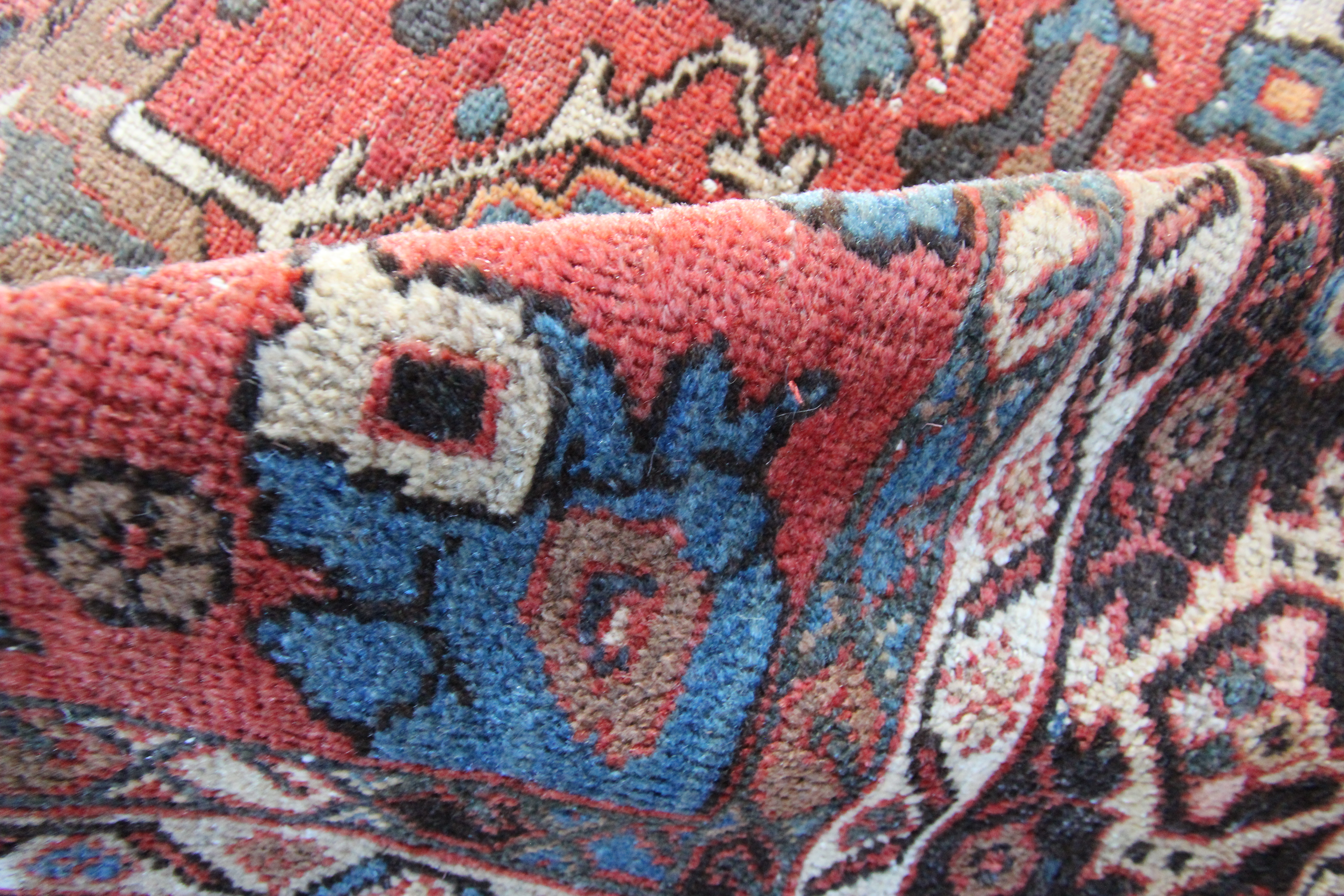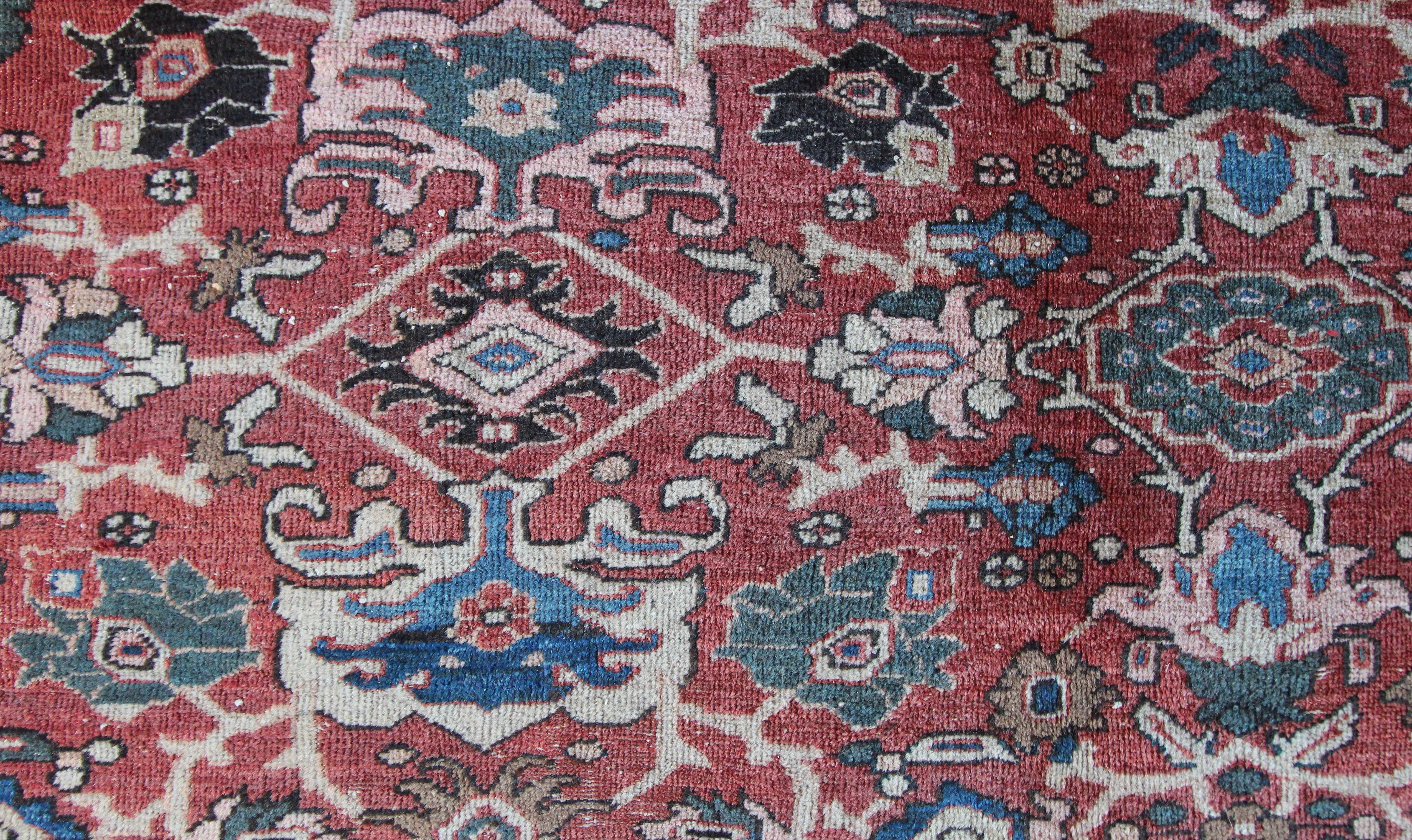 Antique Mahal carpets are usually woven with an all-over pattern,  consisting of floral designs and soft tones.  Their neighbours in the north of Persia, Heriz were always more geometric in their style – and more often were woven with central motifs.  Look at both types if you are thinking of furnishing a room,  as one of these two styles (Mahal or Heriz) are the most popular and fashionable types.