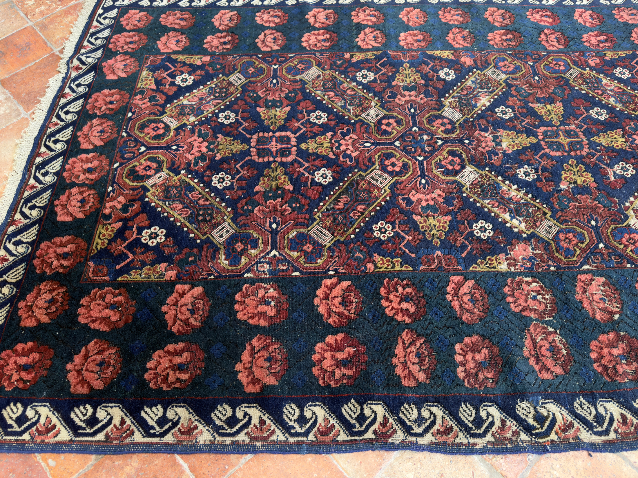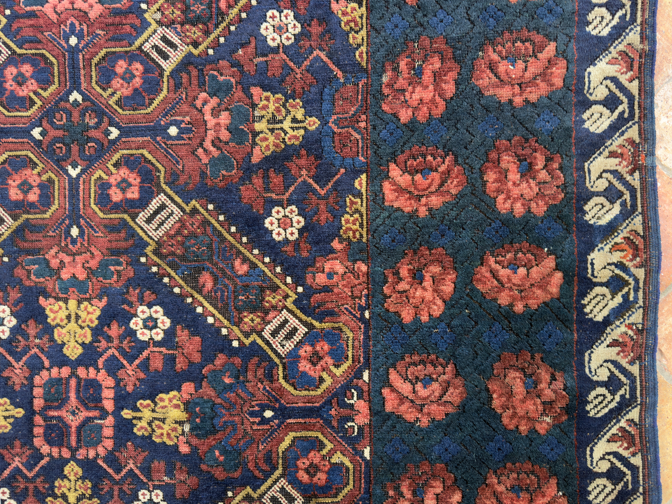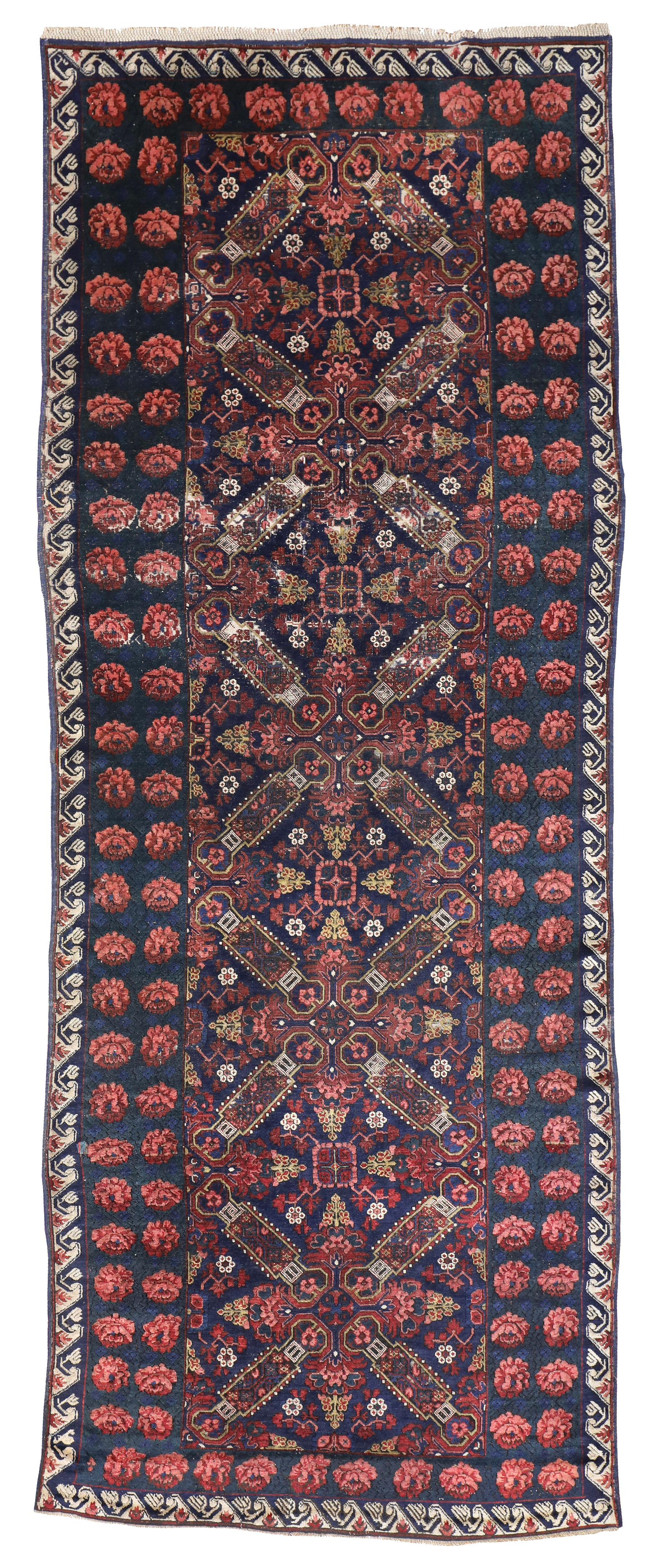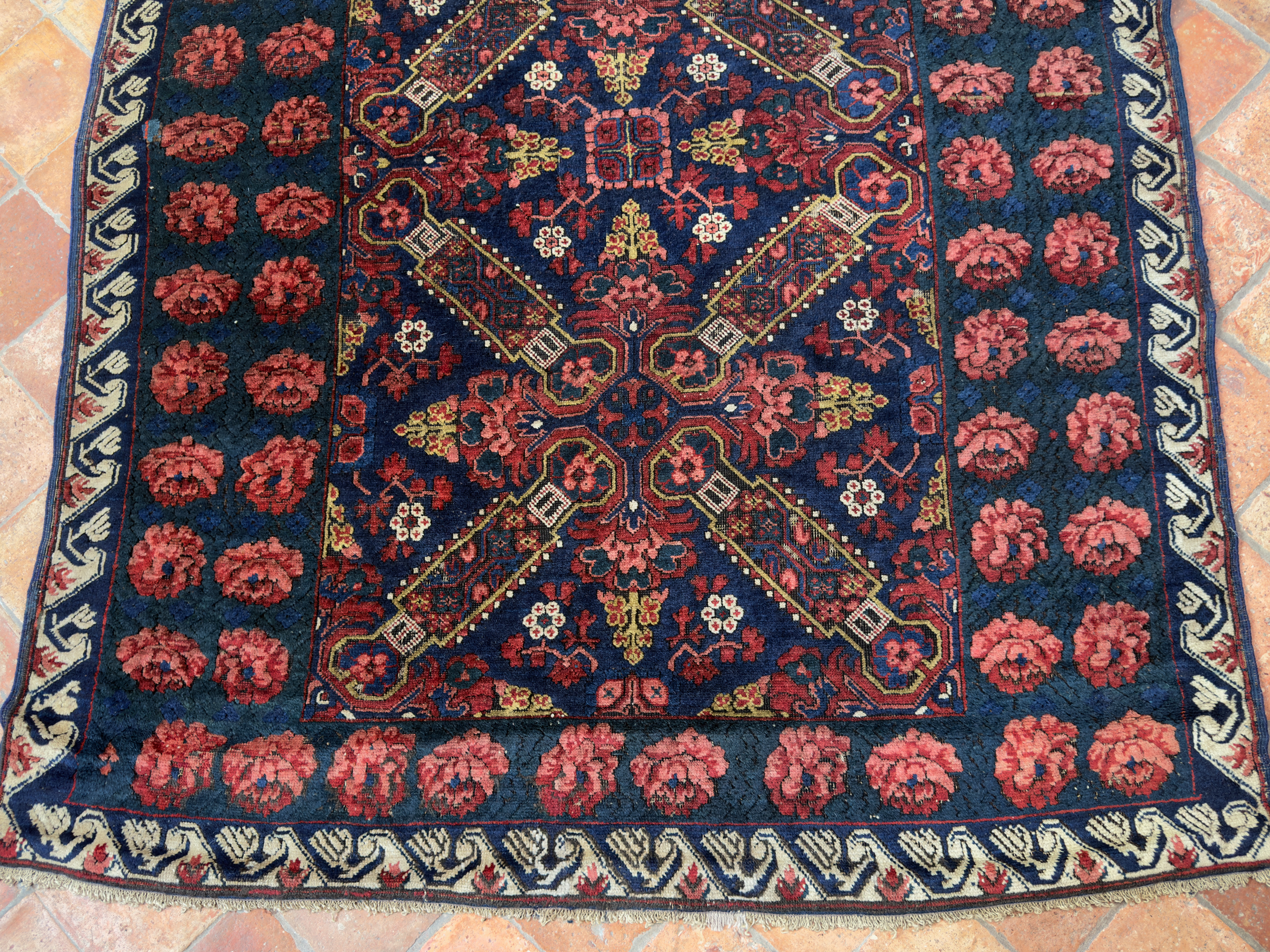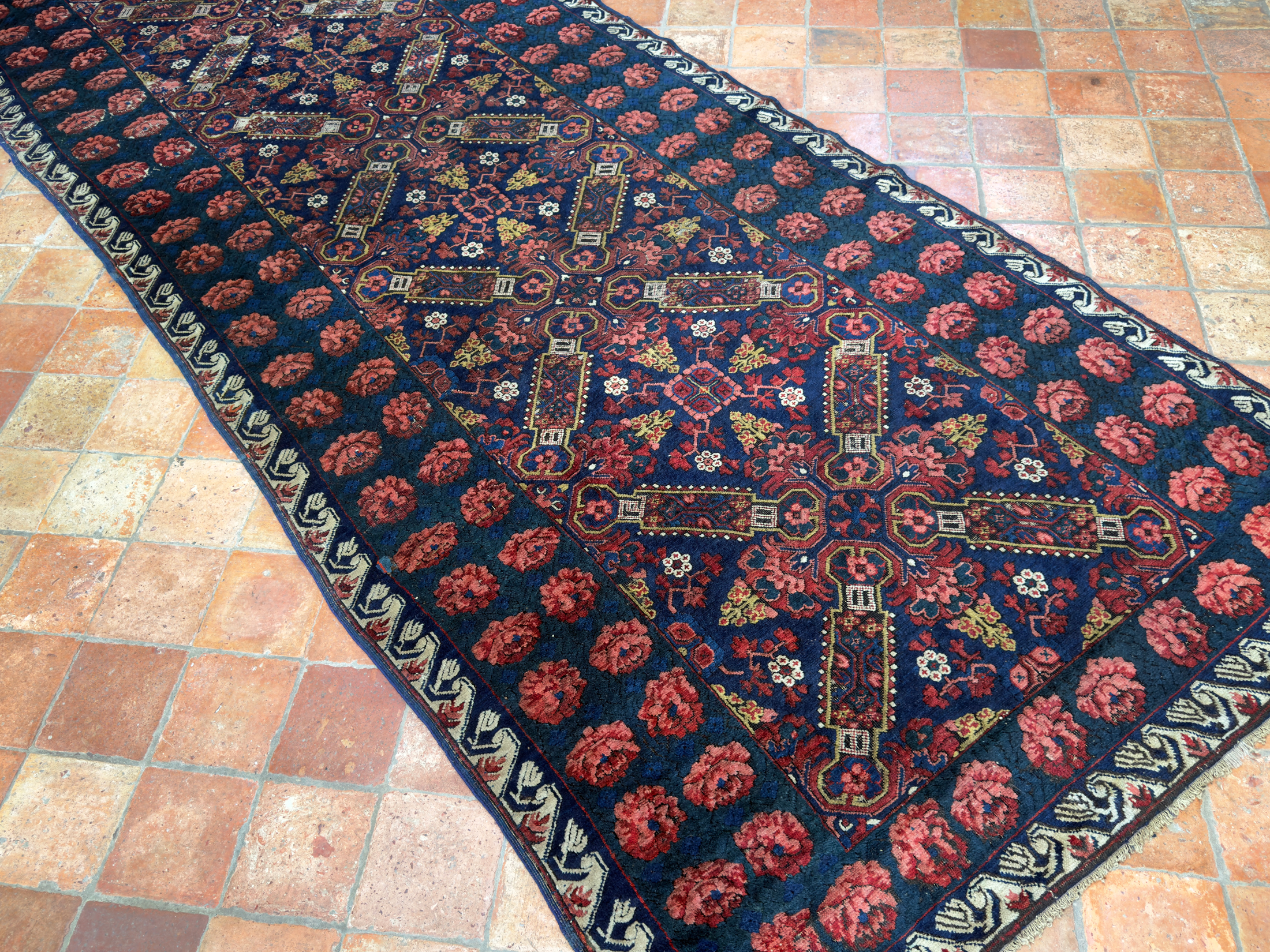 An ancient and lightly distressed Seychour Kelleh woven around 150 years ago, woven with the St. Andrew Cross Pattern running down the main field. The Seichur village is between Derbent and Karagashli Town in the Northern Kuba region of Dagestan. The wool is very soft and the rug has a floppy handle, with a very deep blue almost black background, and famous green rosette floral pattern in the main border, which is a pattern the Seychour weavers used a great deal. An interesting tribal runner, placed in a hall or corridor it would look like it had lived there for 100 years or more.