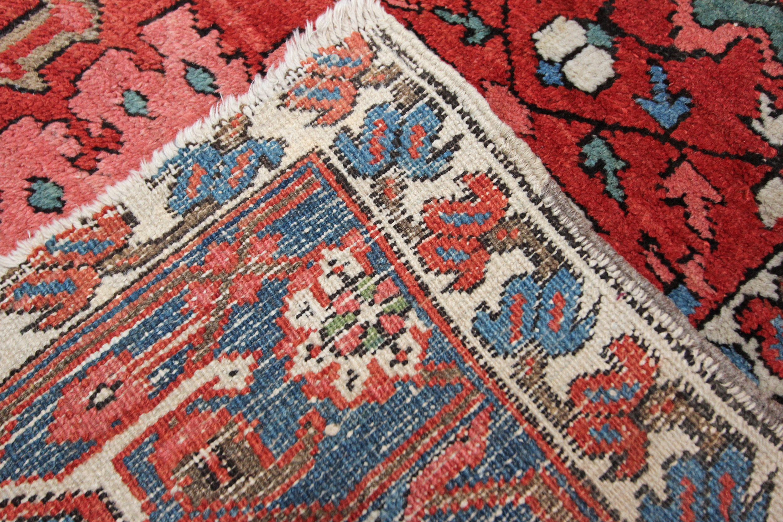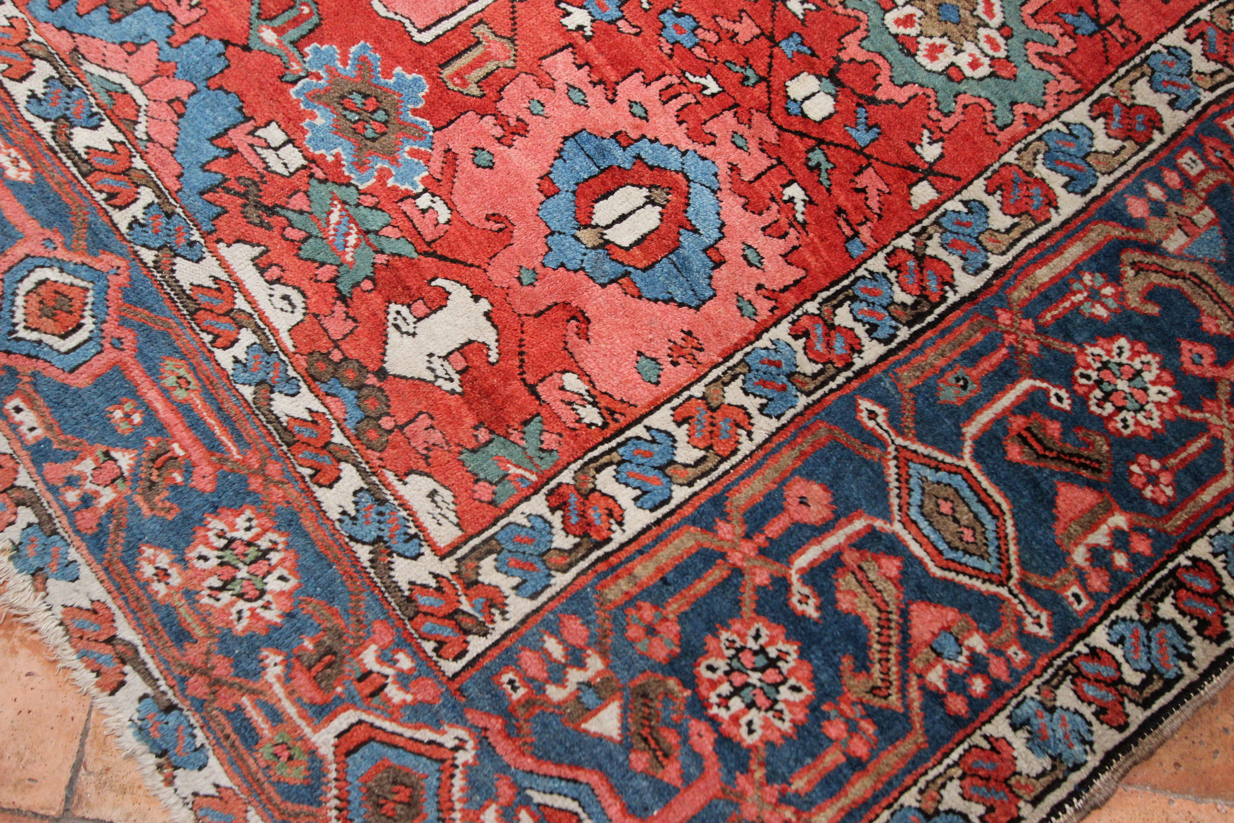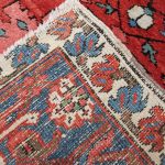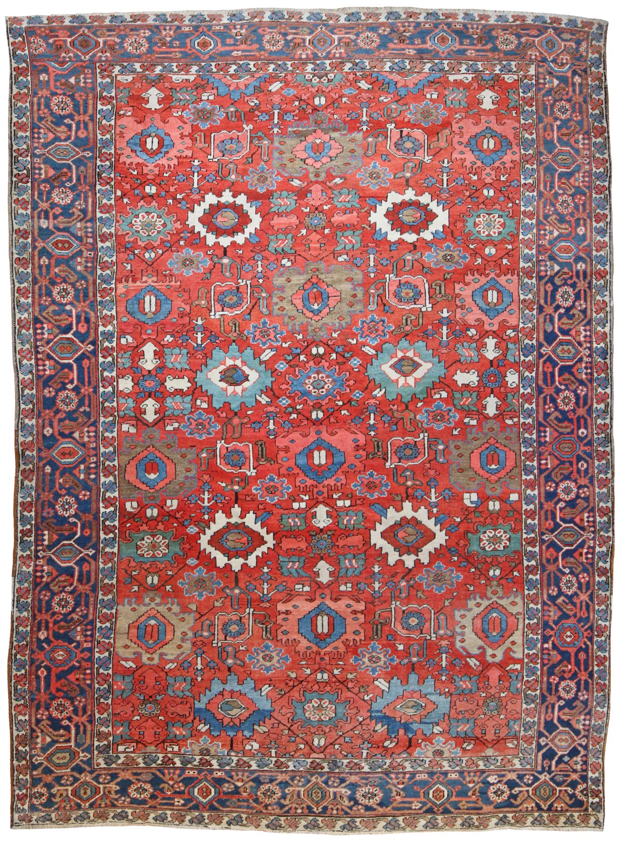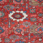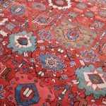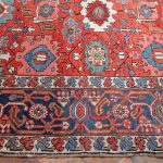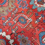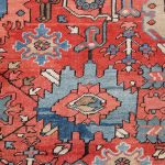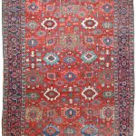 Antique Serapi carpets are more intricate finer tribal weavings hand-woven by Azerbaijan Turkish inhabitants close to the city of Heriz in North-West Persia. They are famous among collectors because of their vivid vegetable dyes or soft earth tones that are woven on a geometric pattern. In terms of design, drawing, and colouration – Serapi carpets are clearly part of one and the same tradition as Heriz weavings. Despite being a distinct antique rug style, which originated as a Northwest Persian adaptation of early Sarouk Farahan medallion, but with a more geometric and abstract village sensibility.