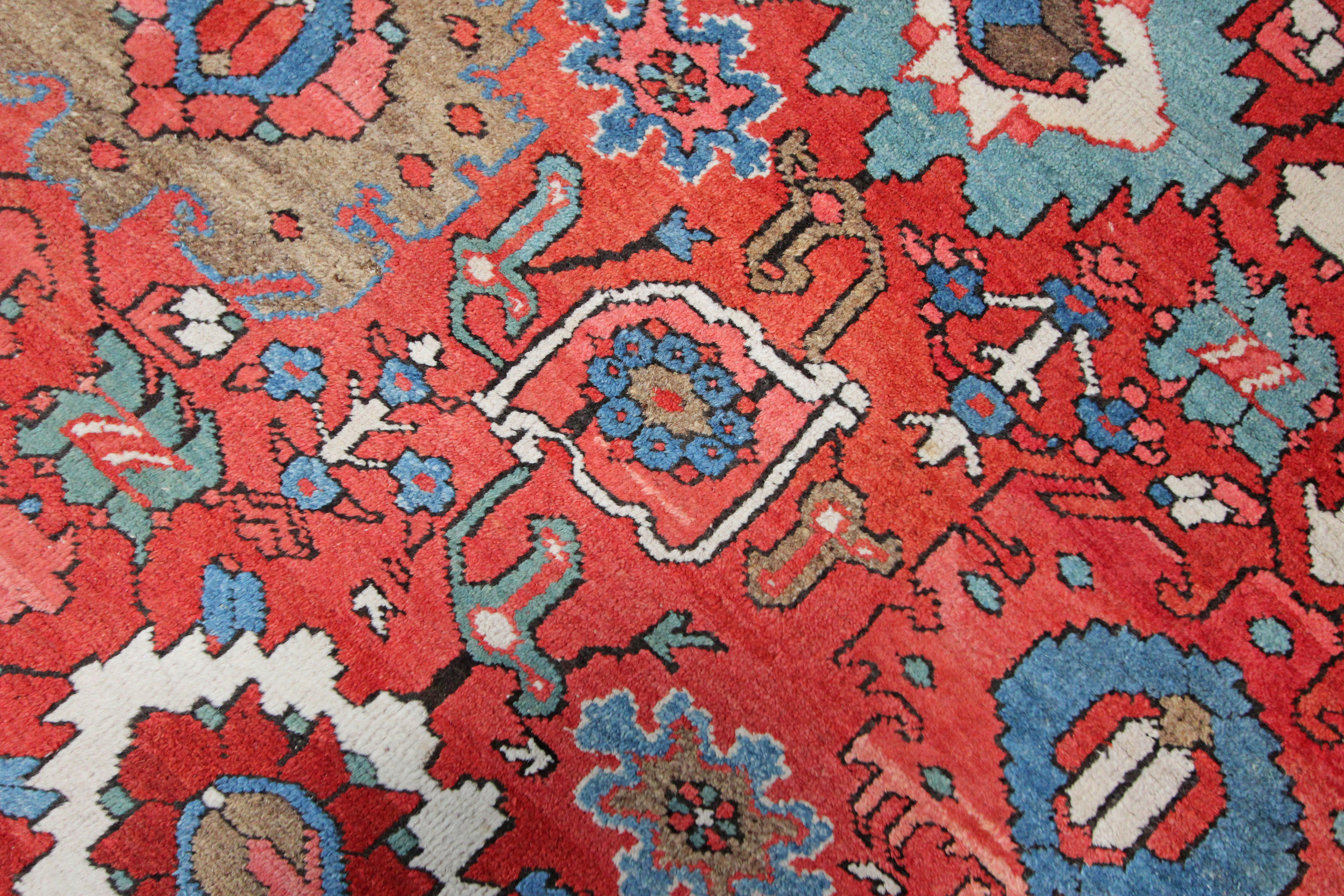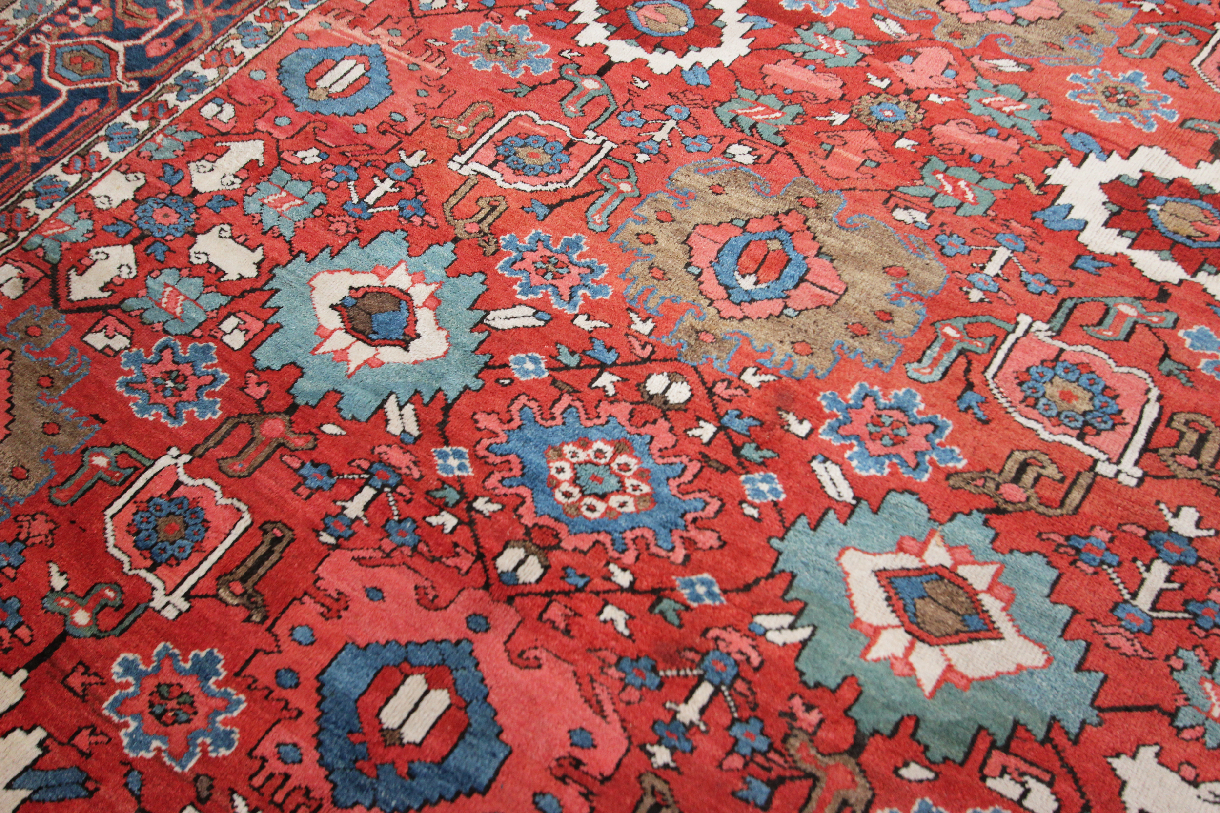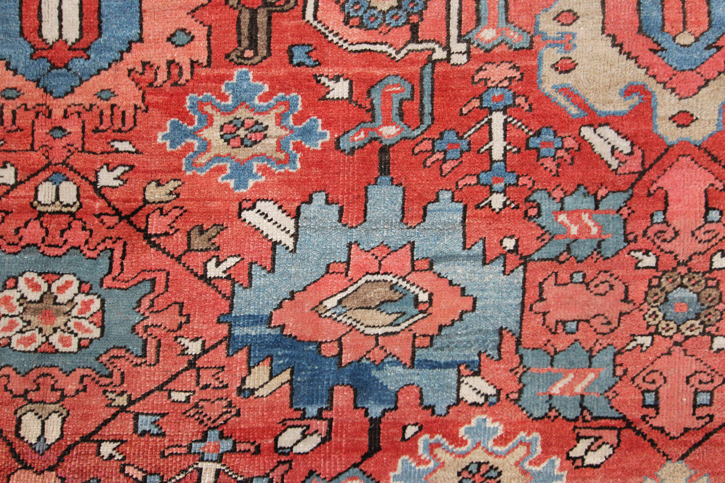 Antique Serapi carpets are more intricate finer tribal weavings hand-woven by Azerbaijan Turkish inhabitants close to the city of Heriz in North-West Persia. They are famous among collectors because of their vivid vegetable dyes or soft earth tones that are woven on a geometric pattern. In terms of design, drawing, and colouration – Serapi carpets are clearly part of one and the same tradition as Heriz weavings. Despite being a distinct antique rug style, which originated as a Northwest Persian adaptation of early Sarouk Farahan medallion, but with a more geometric and abstract village sensibility.