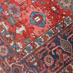Like Heriz, Serapi carpets will often have a multiple concentric medallion format that emits jutting branches or vines ending in large stylised palmettes, leaves, or flowers. With framing corner pieces at the periphery of the field. The main border is usually some variant of the ‘turtle’ vinescroll pattern. In terms of design, what distinguishes Serapis from Heriz carpets is once again their more refined approach. The articulation of the medallions is crisper, more finely linear, and open, the highest grade in terms of weave, and very probably the oldest type in terms of age. Heriz carpets are generally coarsely woven with as few as 30 knots per square inch. They also have a deeply depressed warp structure with a markedly ribbed back surface. Since the early twentieth century they have come to make use of light blue cotton wefting. Serapis, in contrast, have a higher knot count, sometimes attaining 80 knots per square inch. Their backs are relatively flat, and they have ivory cotton wefting and generally they have a softer floppier handle than a Heriz.