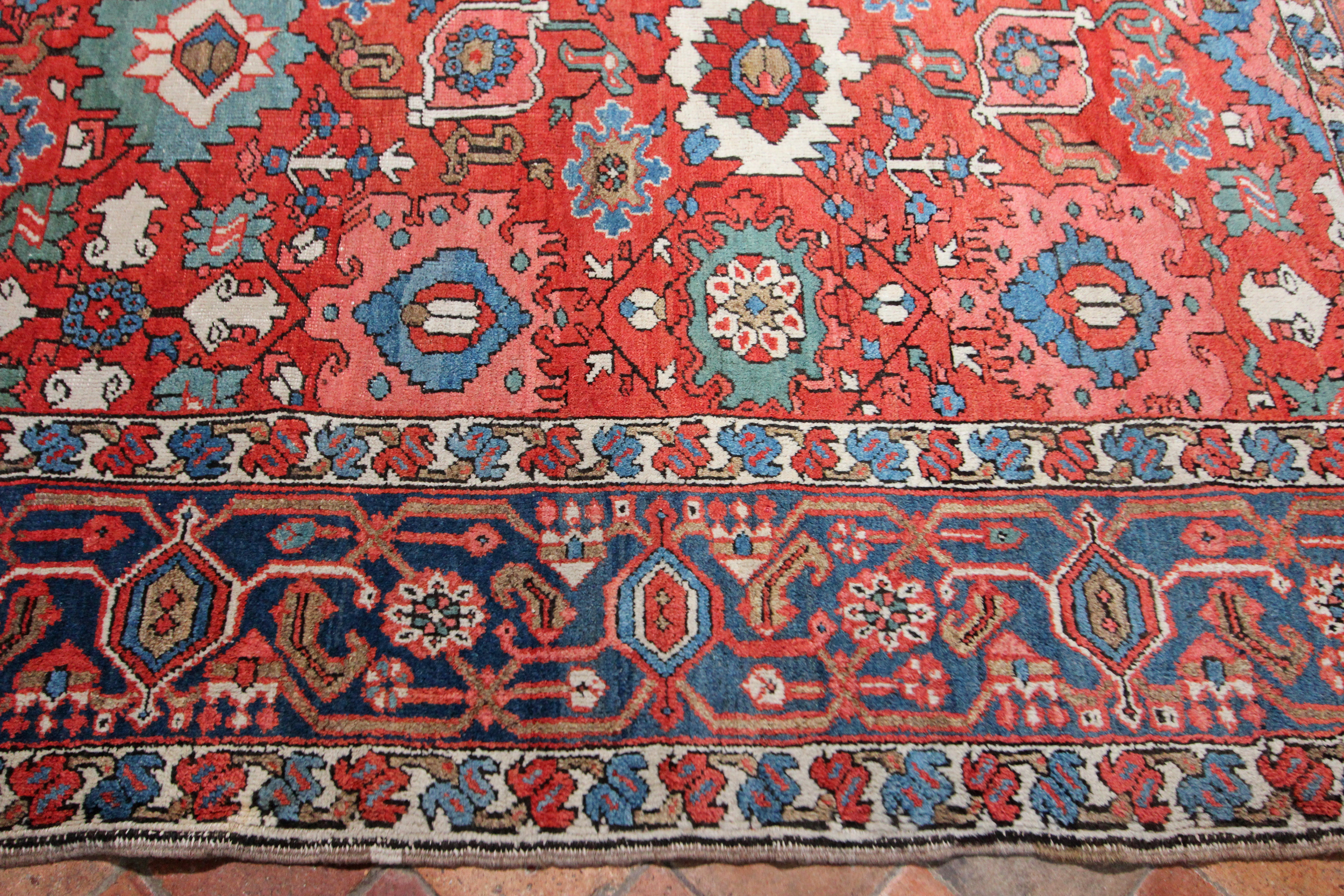 A magnificent all over design antique Serapi carpet, with a fine weave and exceptional pile height over the majority of this rare antique carpet. The more open design of floral palmettes combined with the early ‘Harshang’ motif create a stunning pattern. Stunning faded pale blues, sage greens, rustic brick reds and muted pinks combined with ivory wool are famous dyes for these earlier tribal carpets from Heriz in Northern Persia. These finer early Serapi examples from the mid to late 19th century are increasingly rare to come across in such original condition.