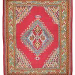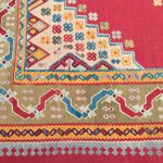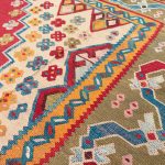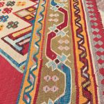 Ushak’s were woven in the Anatolian highlands south of Istanbul, they are famous for producing wool carpets and rugs, rarely weaving kilims and scarcely seen in these larger sizes. Stunning geometric pale blue medallion design with beautiful interesting corner spandrels each filled with colourful floral motifs in an array of fun colours. The pale green border with flowing ribbon design is a fabulous natural dye, and an expensive colour to produce, as green required double dyeing, as this colour was not obtained from one source.