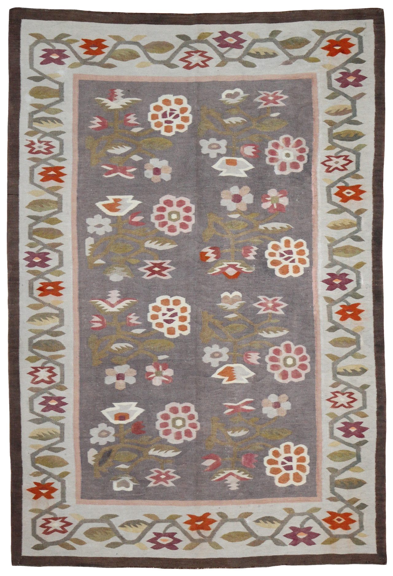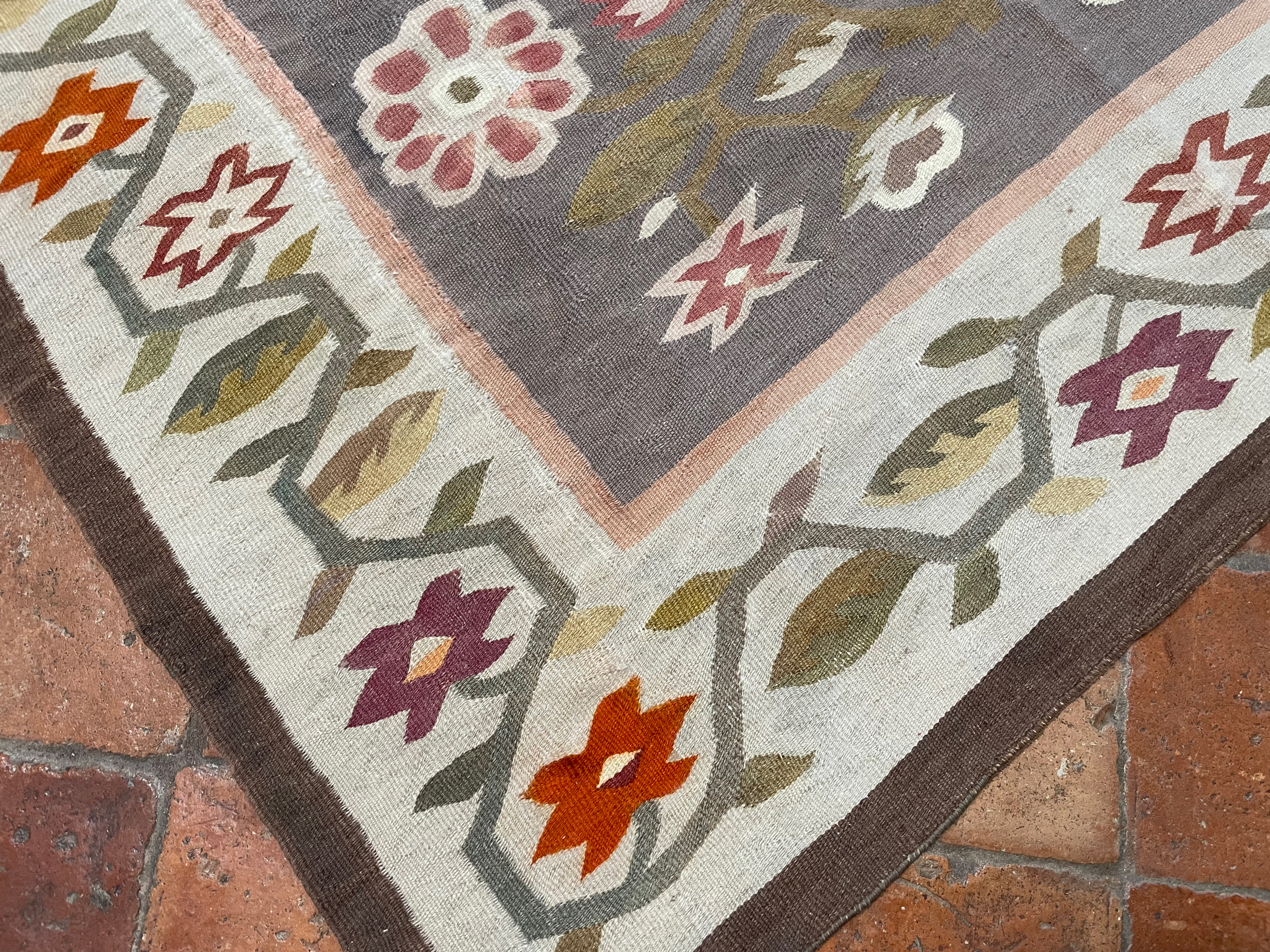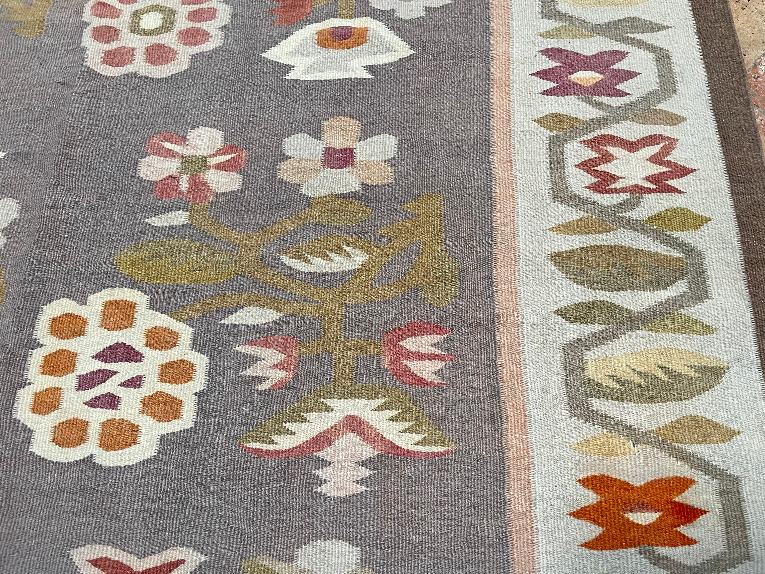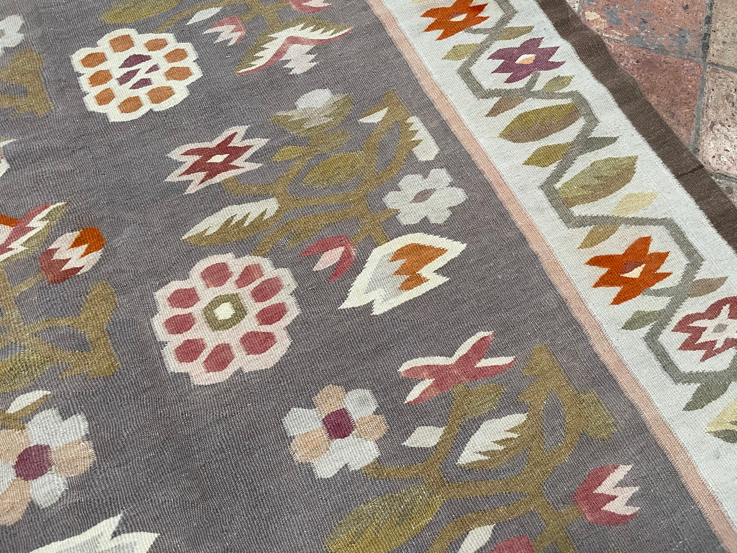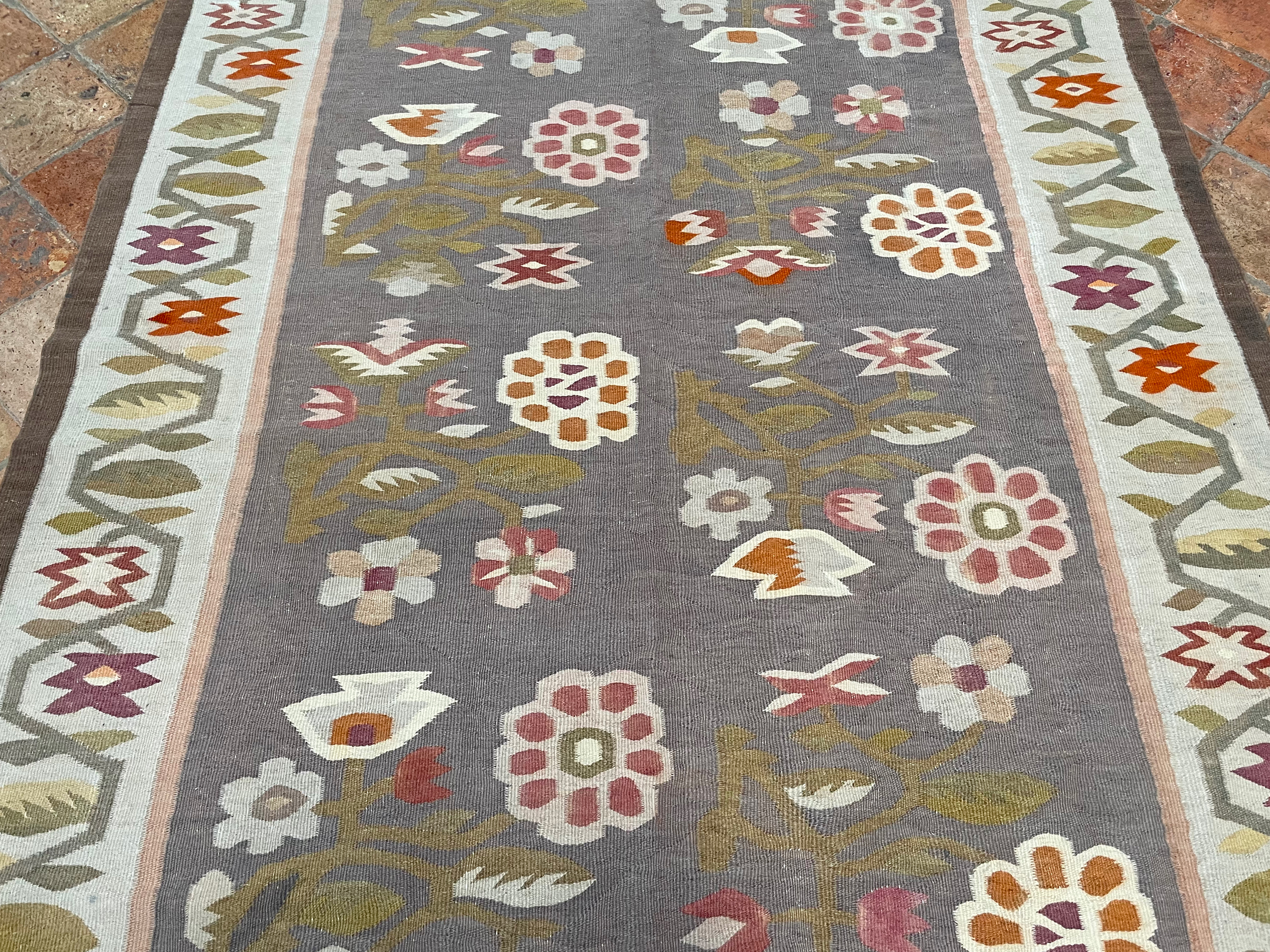 Such a pretty and rare small Bessarabian Kilim, circa 1910 with a gentle light purple/mauve background colour, soft greens and an off-white grey border. The well spaced out floral pattern is quite beautiful. In lovely original condition, with just a tiny bit of dye bleed from the orange dye in the border, which is barely noticeable. A very attractive little Kilim though, which sitting on our underlay would stop it from moving on the floor and preserve it too.