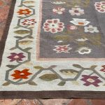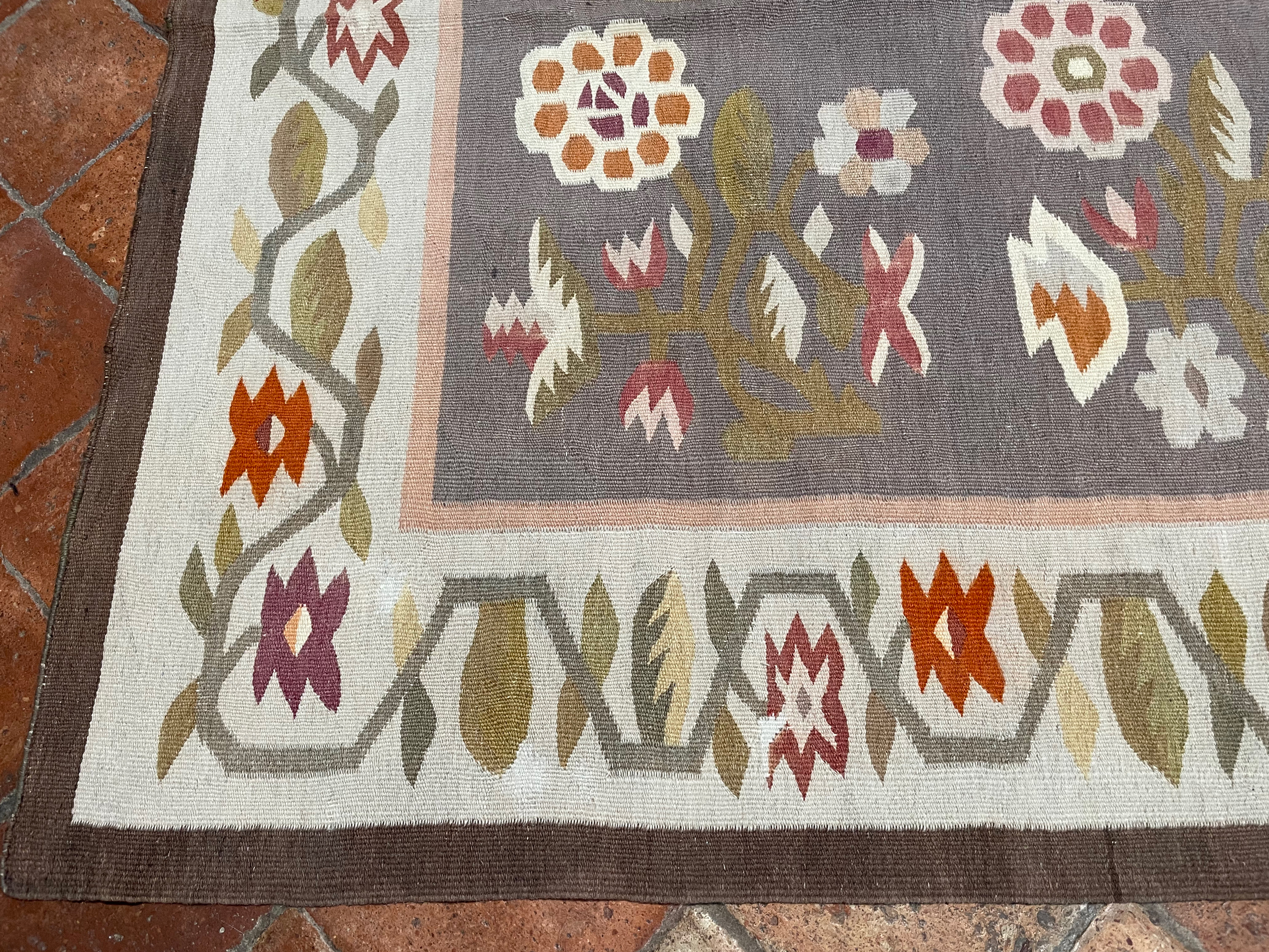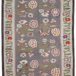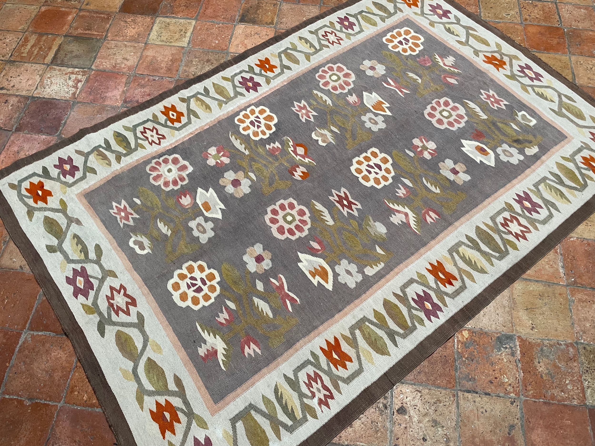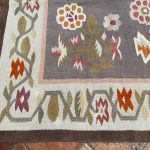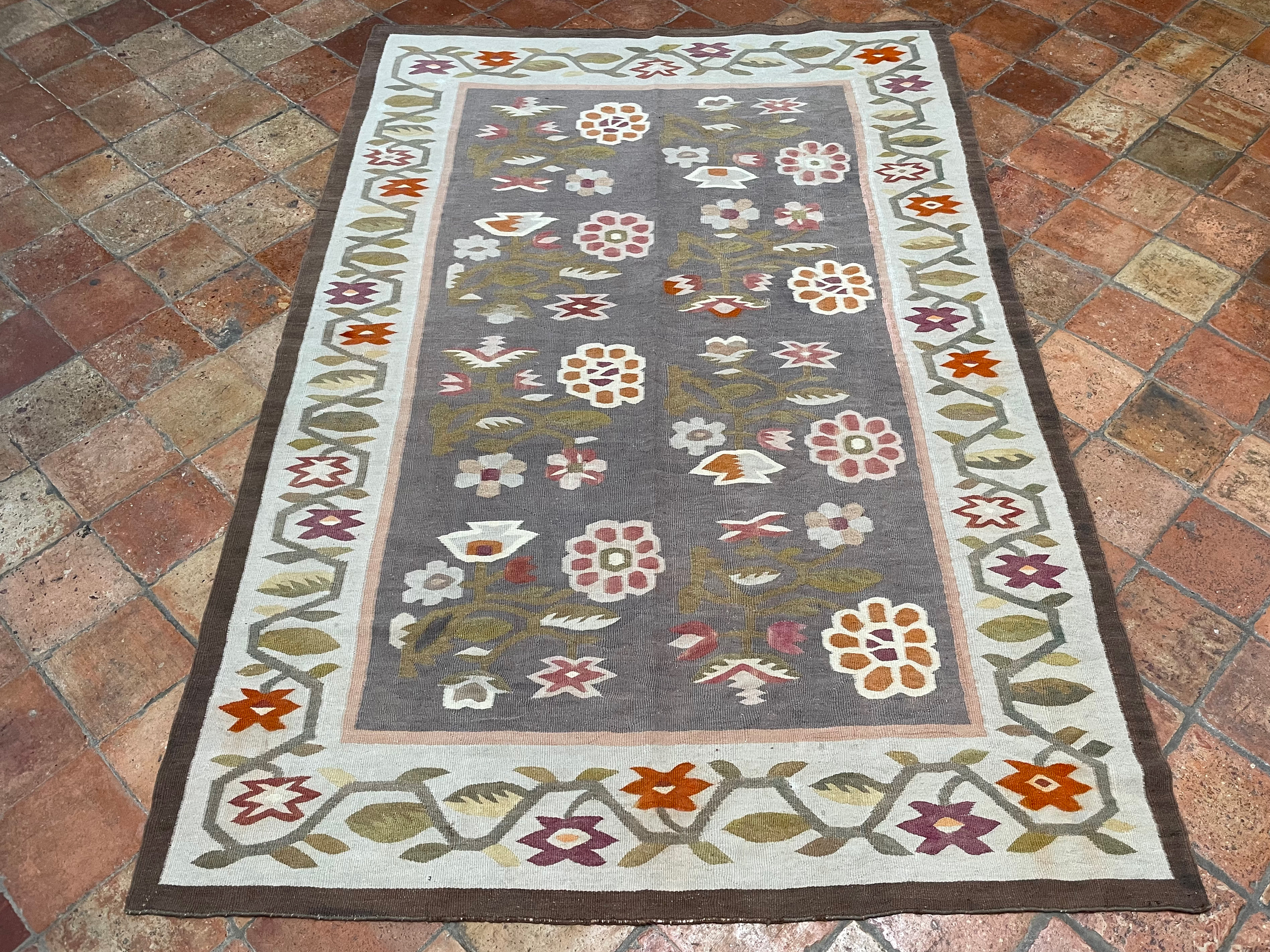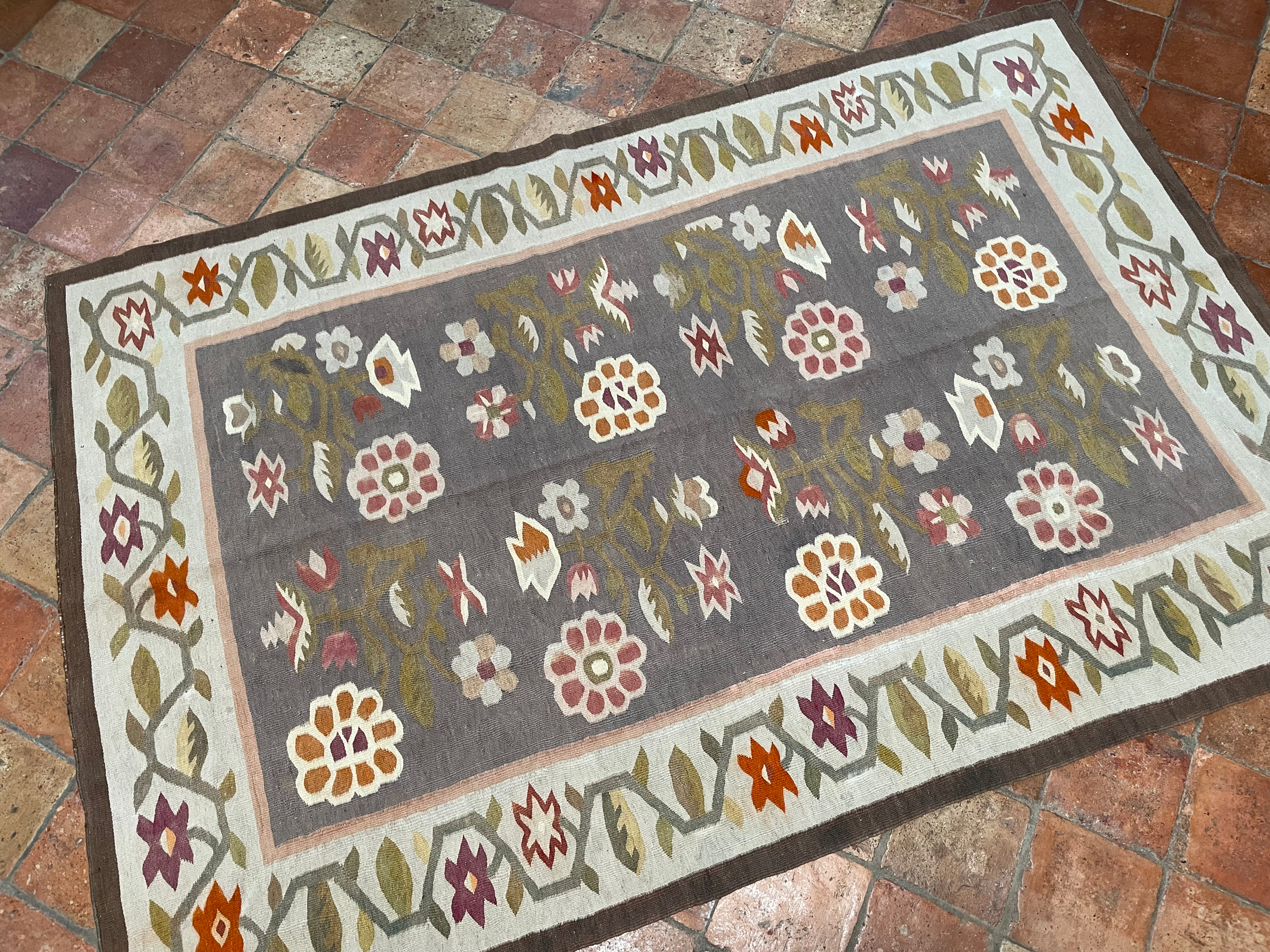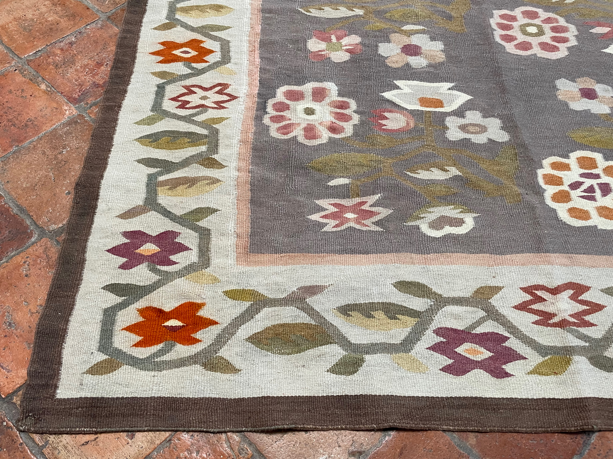 Such a pretty and rare small Bessarabian Kilim, circa 1910 with a gentle light purple/mauve background colour, soft greens and an off-white grey border. The well spaced out floral pattern is quite beautiful. In lovely original condition, with just a tiny bit of dye bleed from the orange dye in the border, which is barely noticeable. A very attractive little Kilim though, which sitting on our underlay would stop it from moving on the floor and preserve it too.