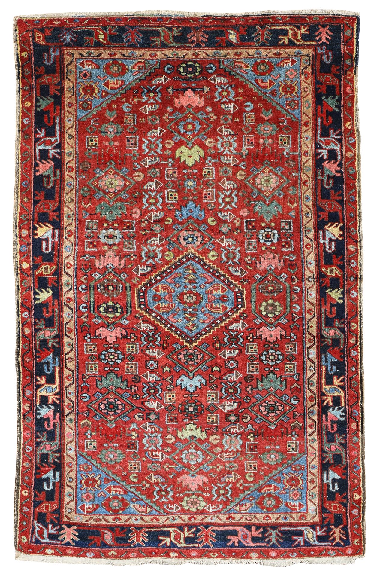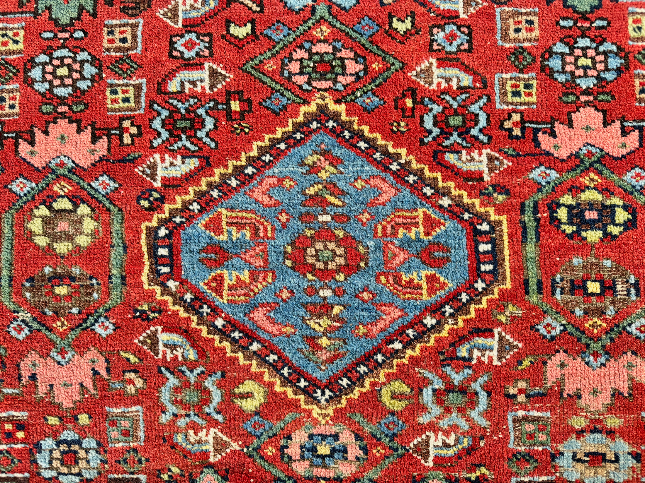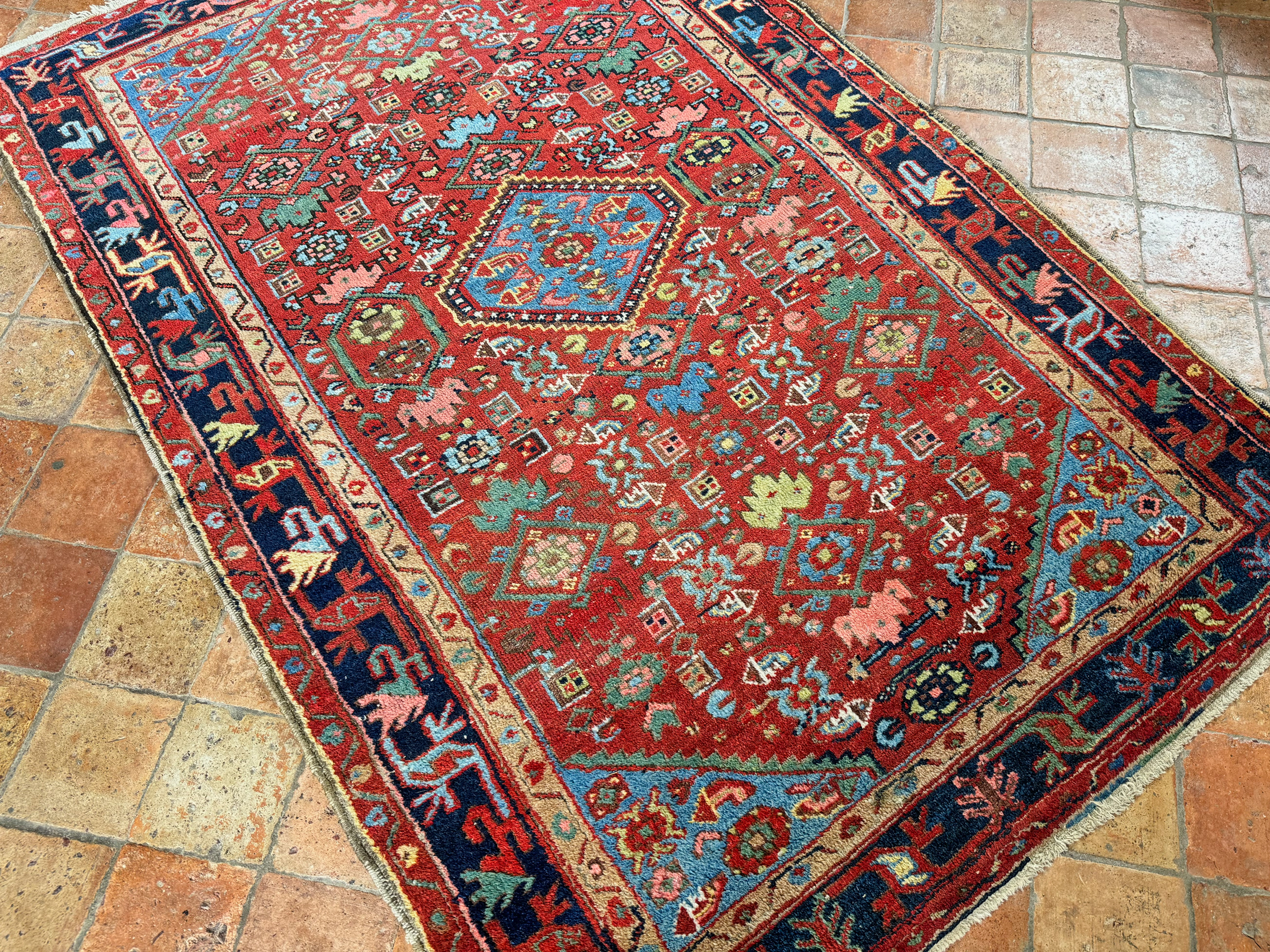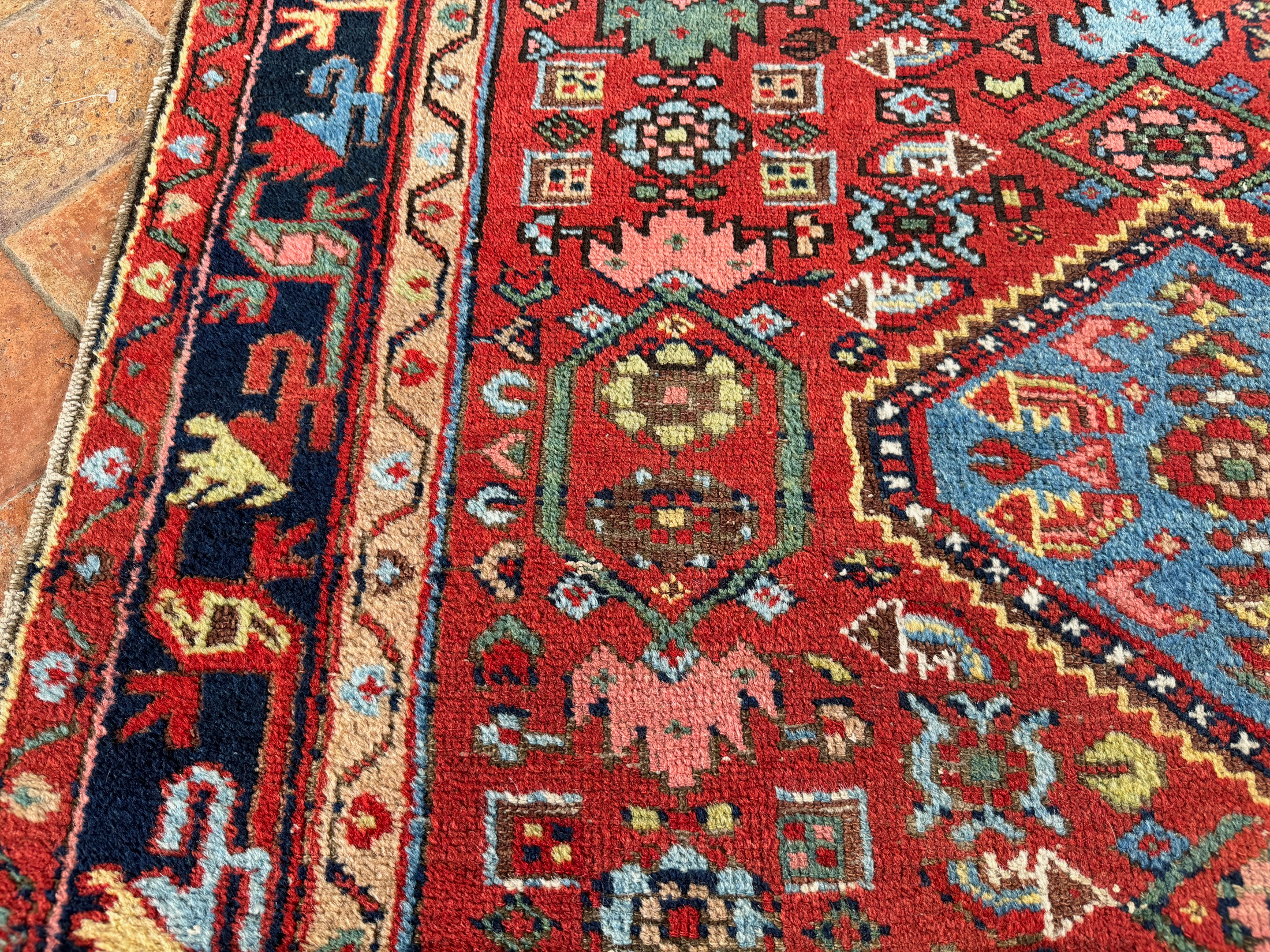 A colourful tribal rug woven in the North-West of Persia around 1900-1910. With a tough wool pile this rug is extremely durable and would add life to many rooms. Good pale blue dyes and hints of green natural dyes. A very handsome antique rug in a great size and with lovely motifs.